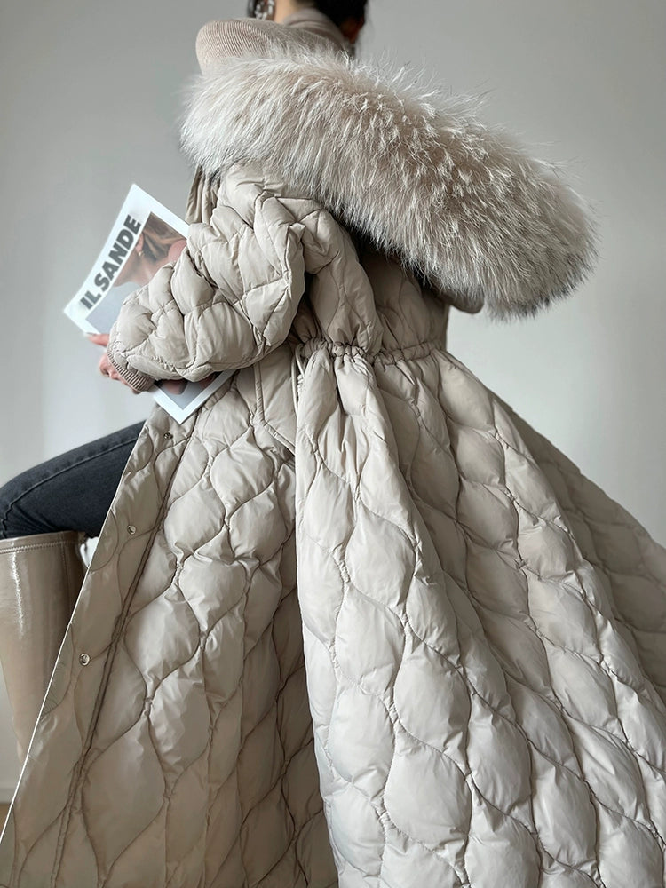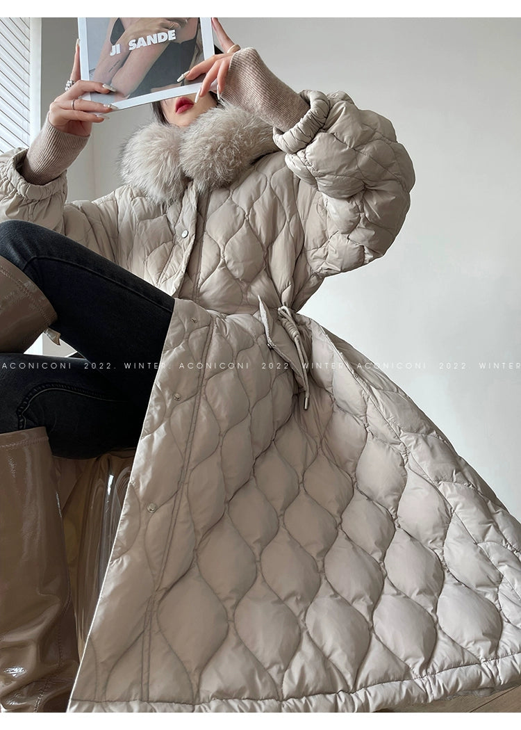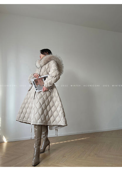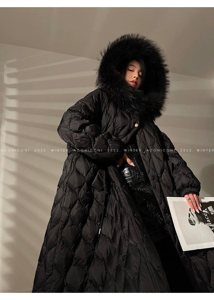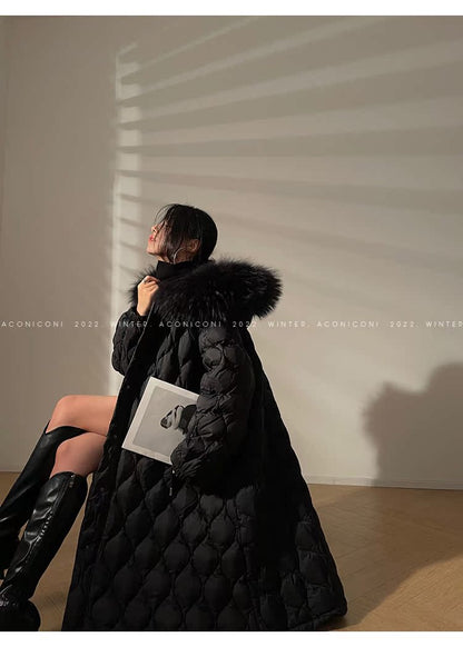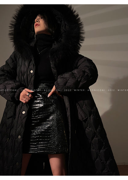 Aconiconi Elegant Duck Down Long Sleeve Hooded Long Fur Winter Coat - He Xu Ling Hua
