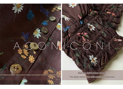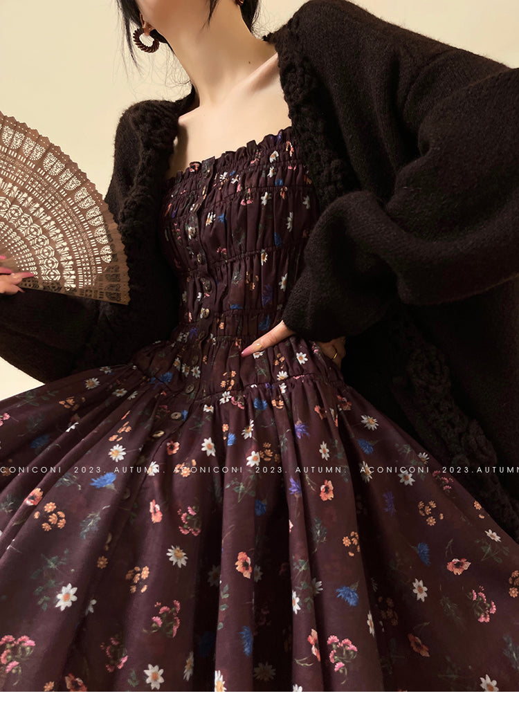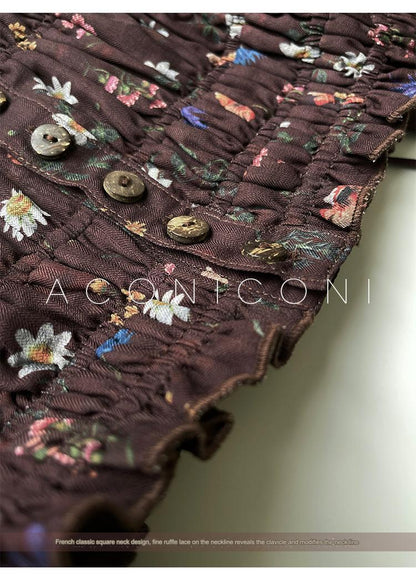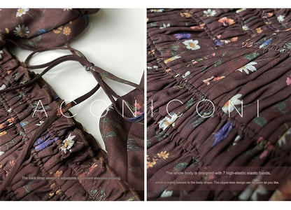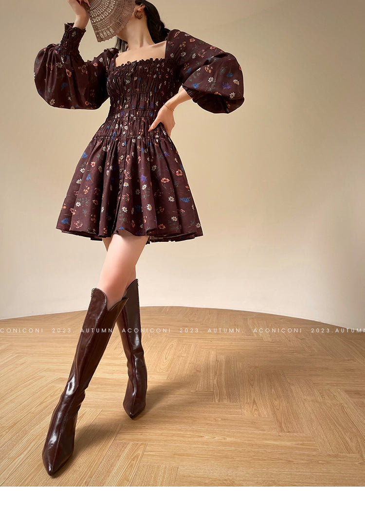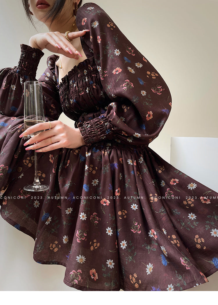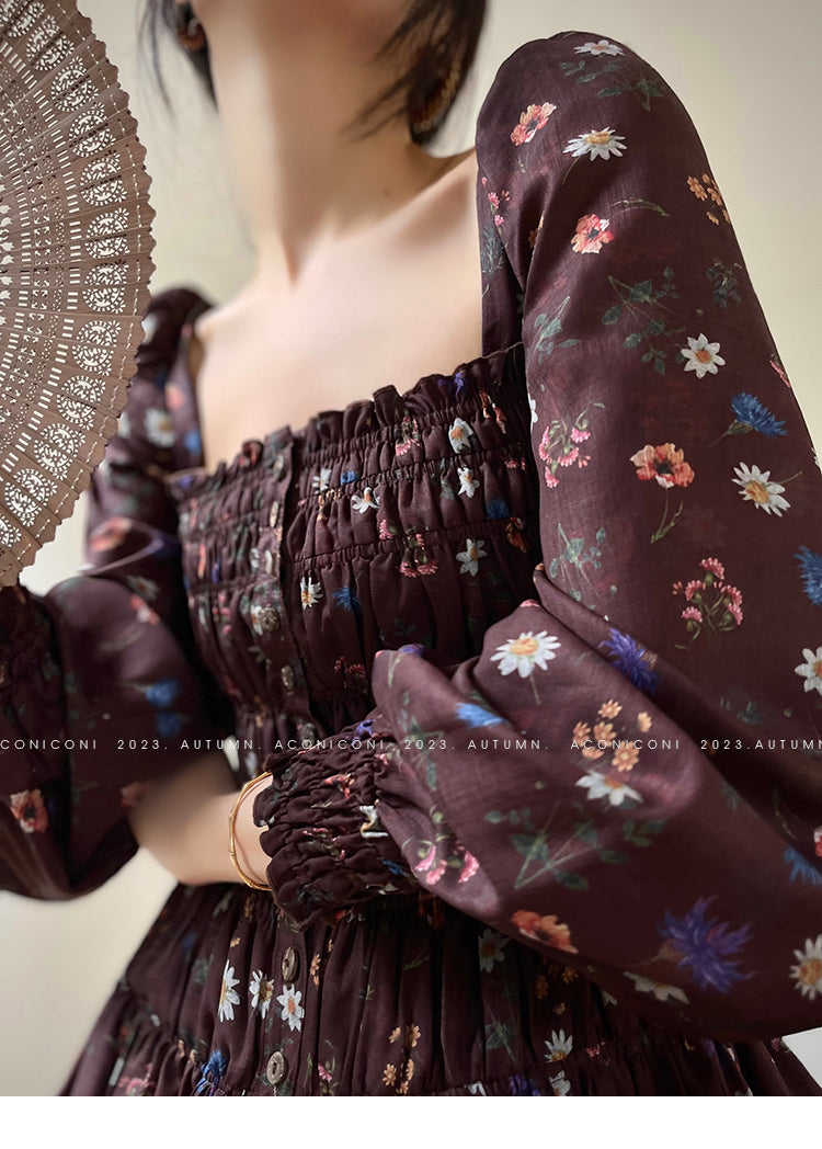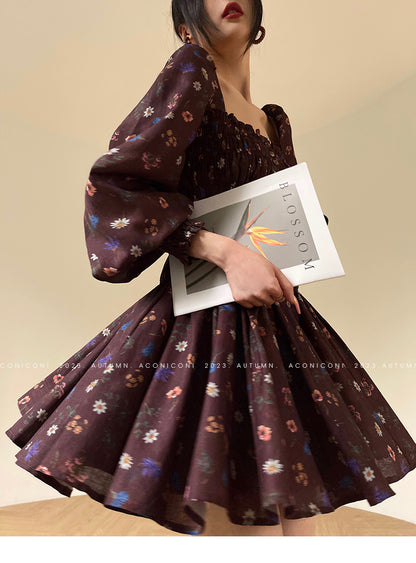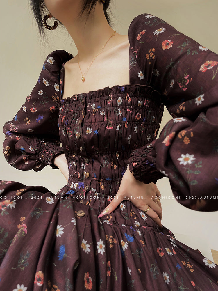 Aconiconi Autumn Floral print French A line brown cottage Dress- Samba Moon
