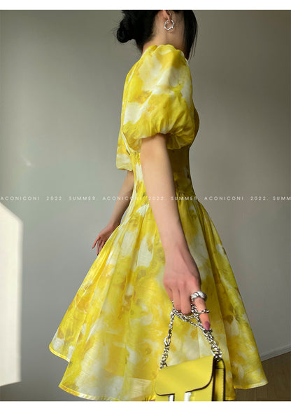 Aconiconi Elegant Lemon French Print Short Sleeve drop waist Dress- desire