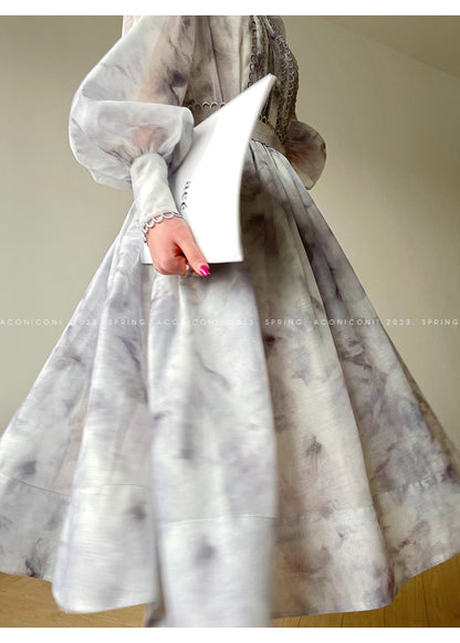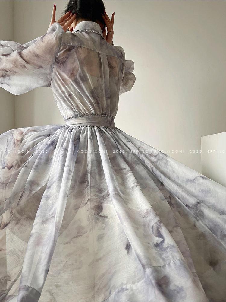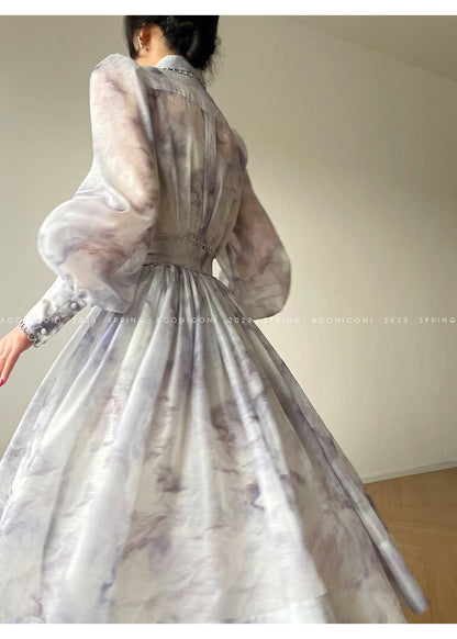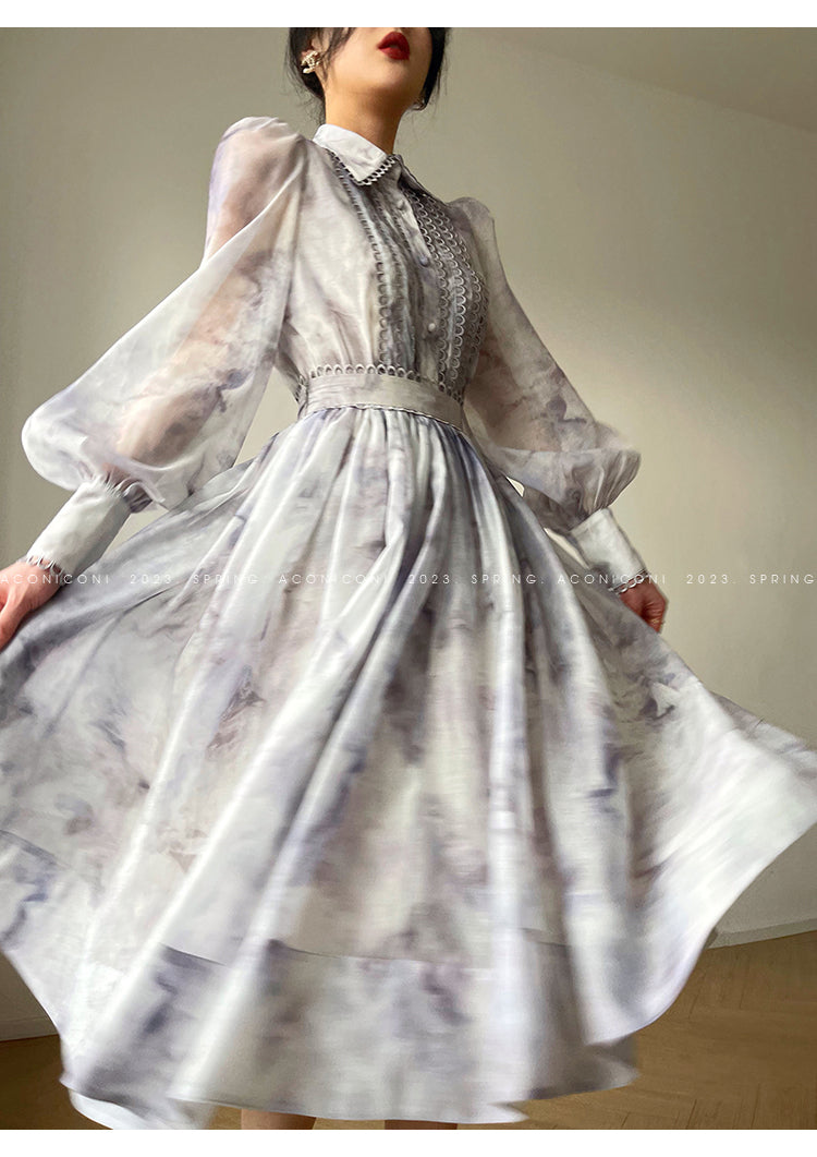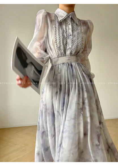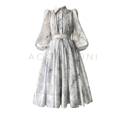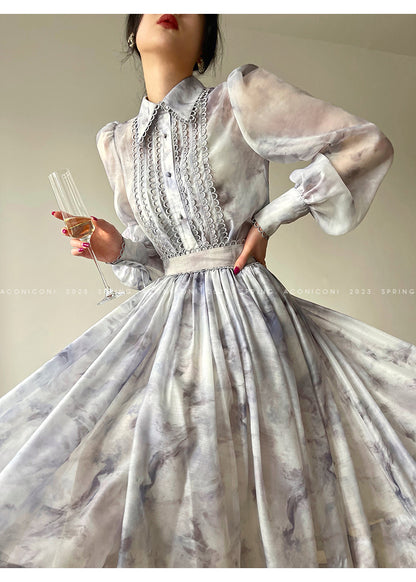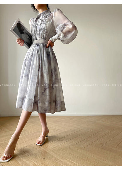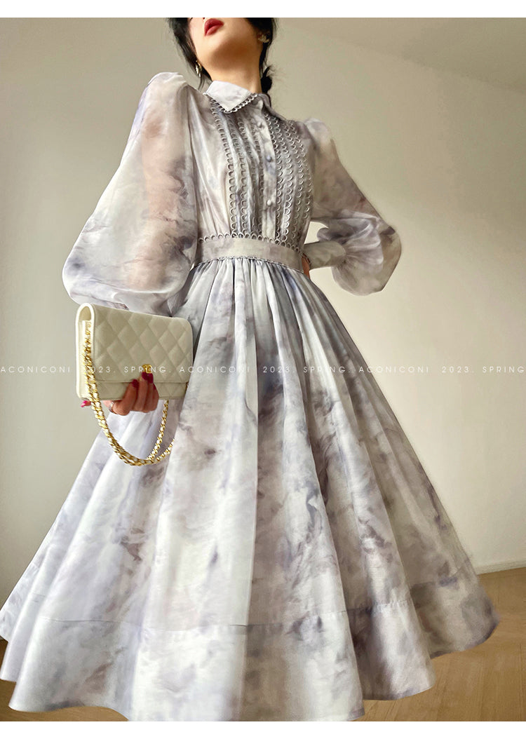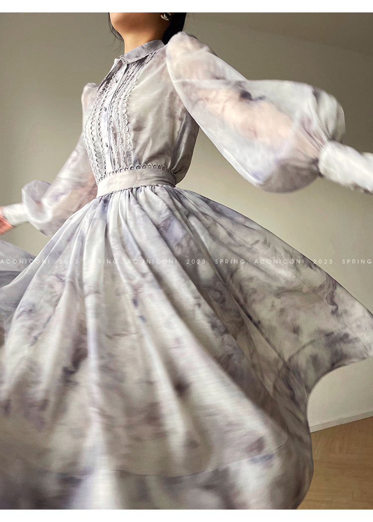 Indulge in the sophisticated and exclusive Aconiconi Elegant Light Blue French Tie-dye Long Sleeve Lace Shirt Dress-Victoria. This stunning mid length dress exudes elegance with its dashing french tie-dye design and delicate lace details. Perfect for the fall season, this classy and chic outfit is a beautiful addition to any wardrobe.