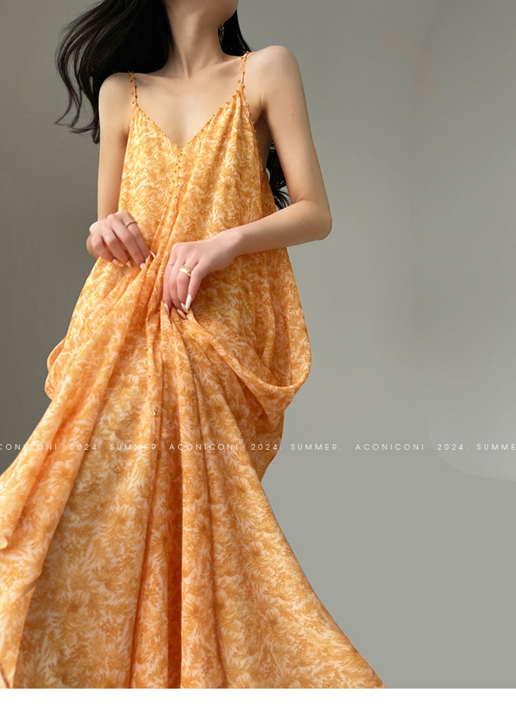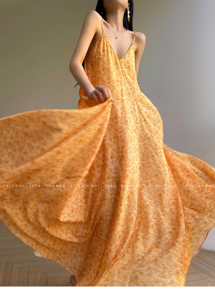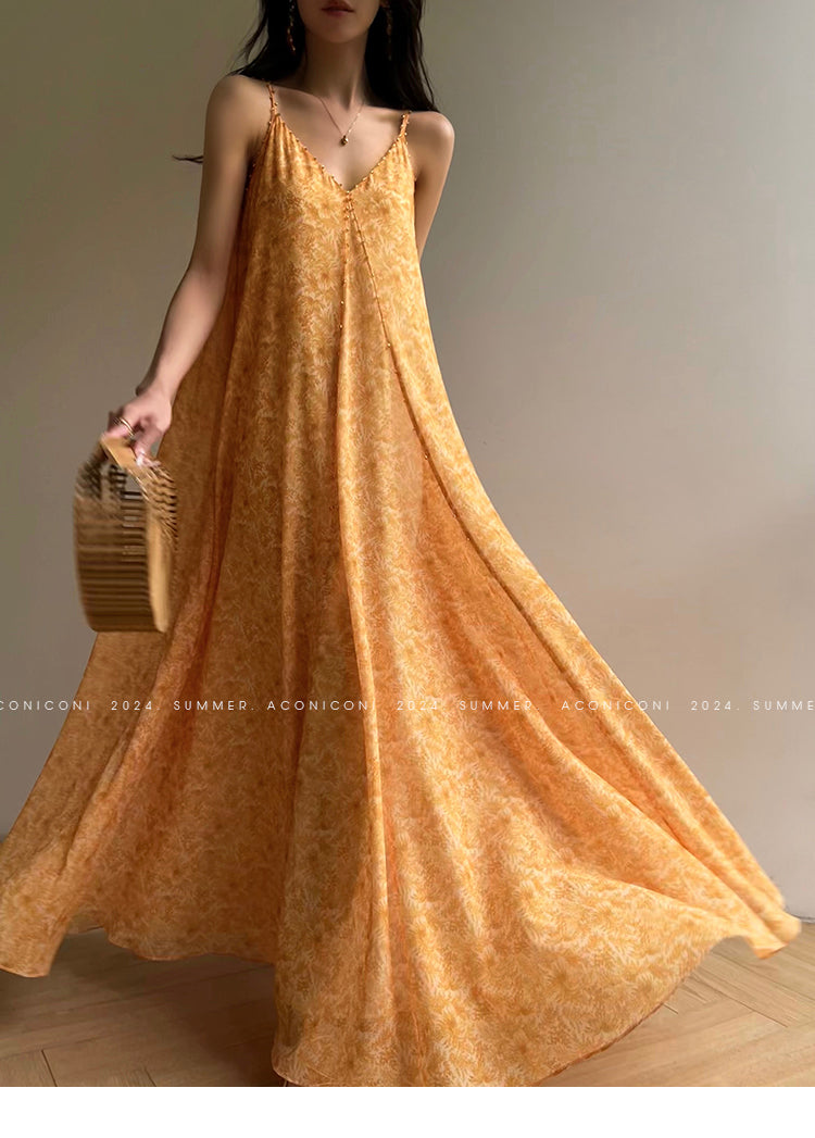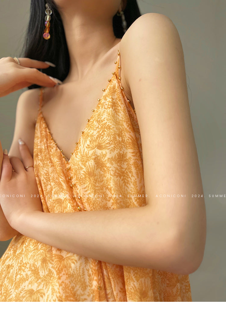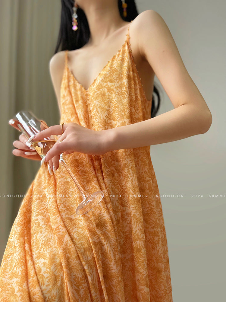 Aconiconi Elegant Orange Pearl V-Neck Sleeveless Loose Long vacation Dress- Ice Brew Orange