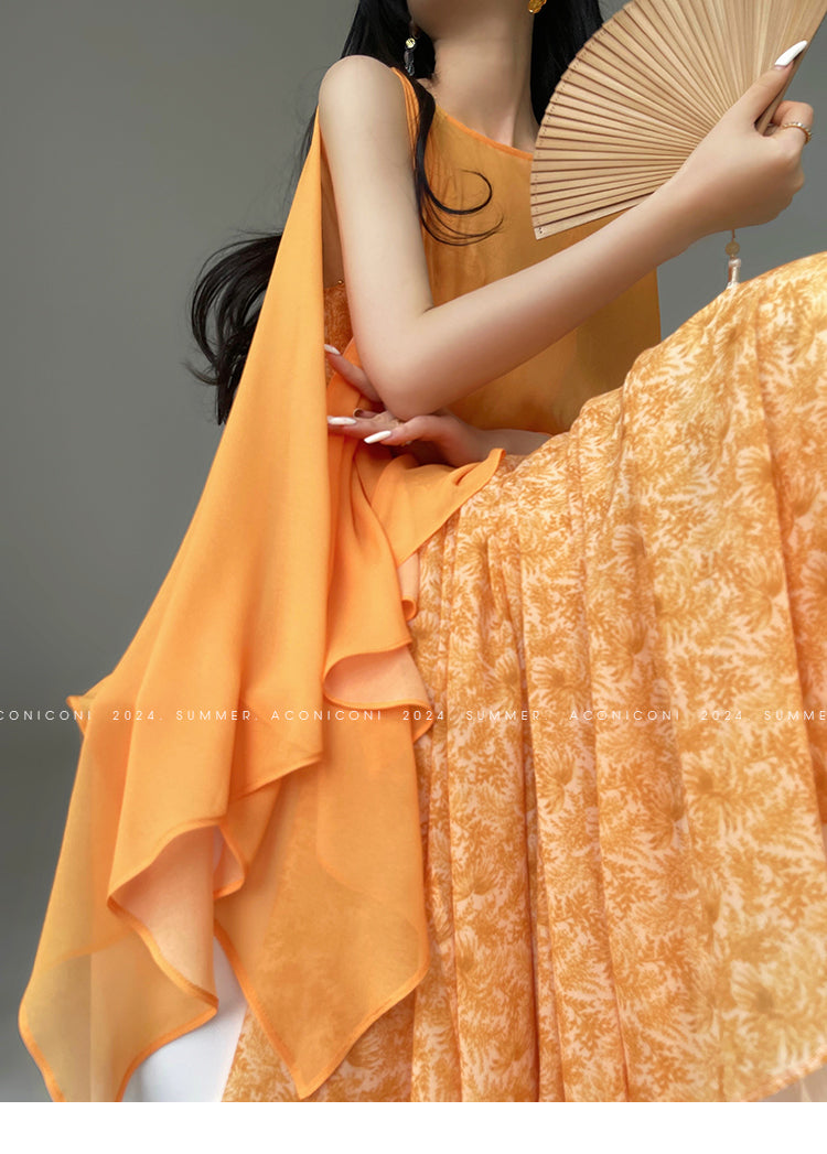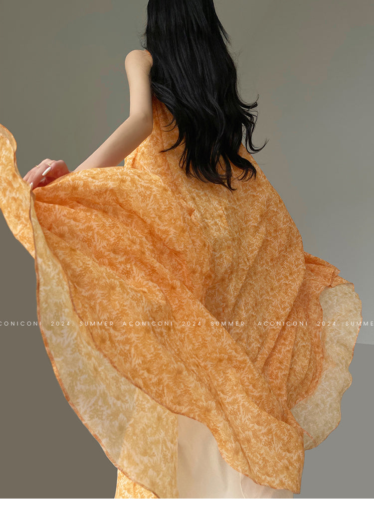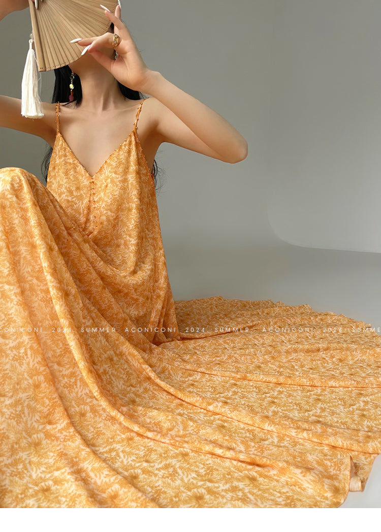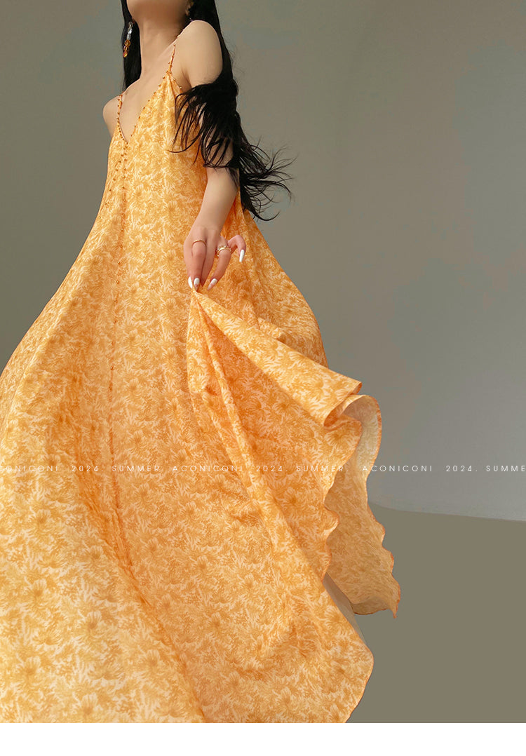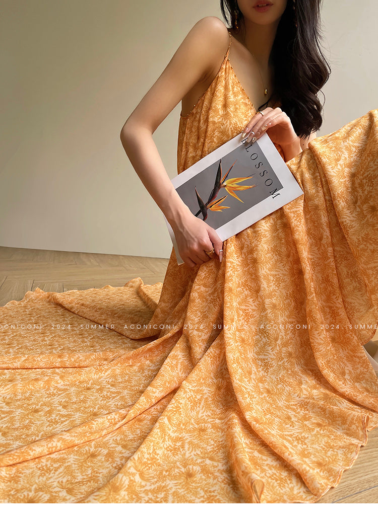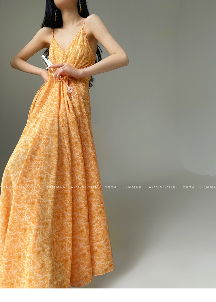 Aconiconi Elegant Orange Pearl V-Neck Sleeveless Loose Long vacation Dress- Ice Brew Orange