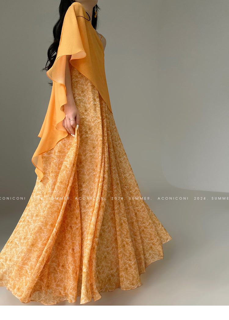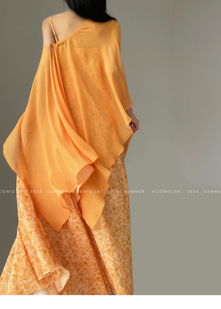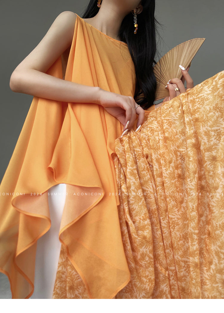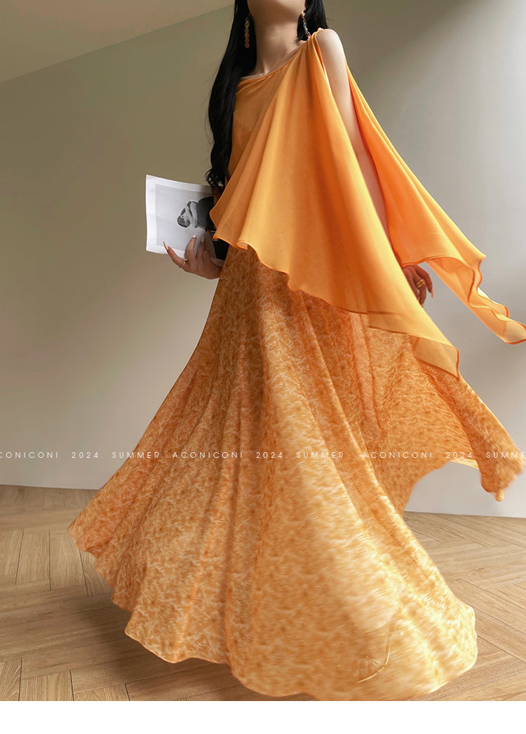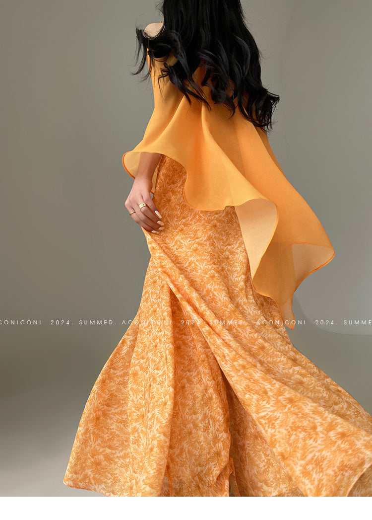 Aconiconi Elegant Orange Pearl V-Neck Sleeveless Loose Long vacation Dress- Ice Brew Orange