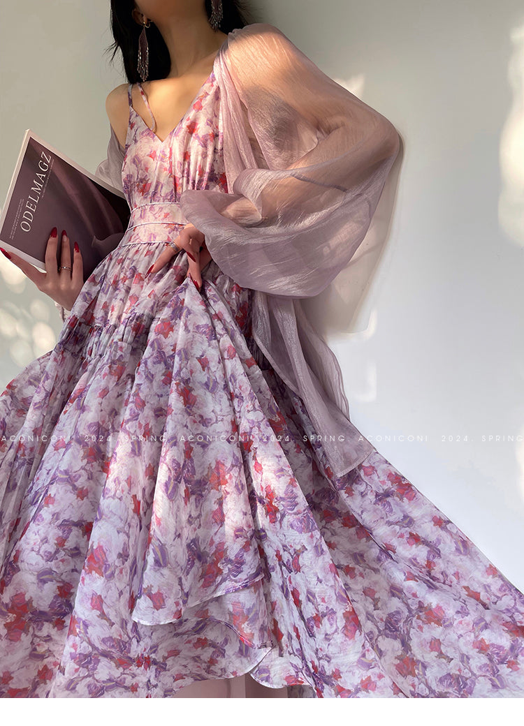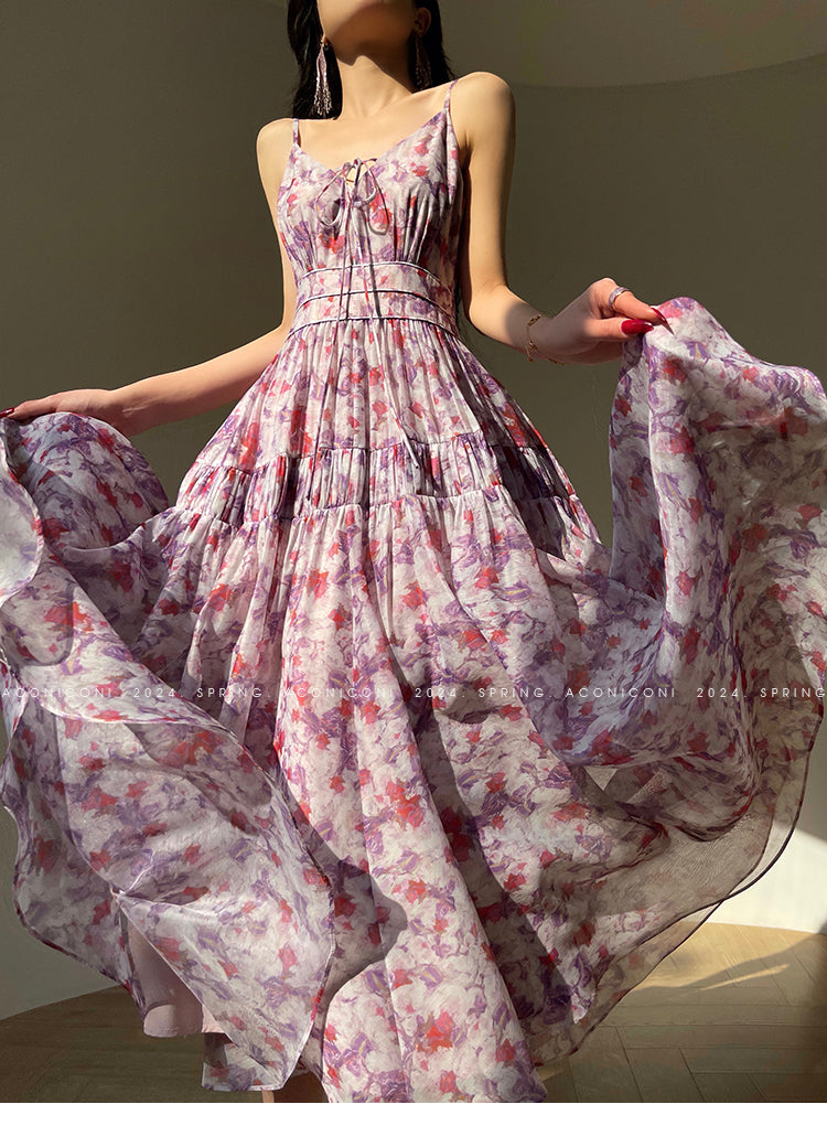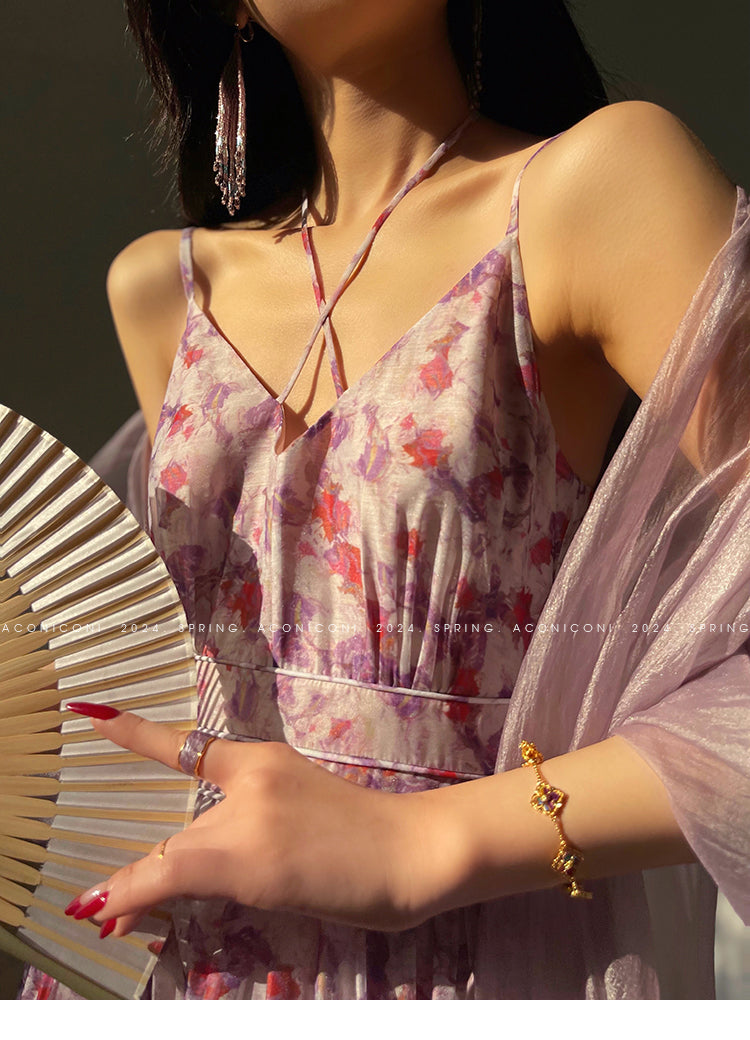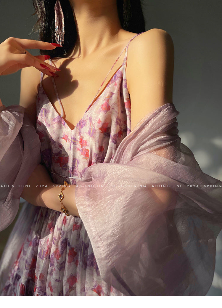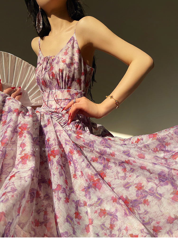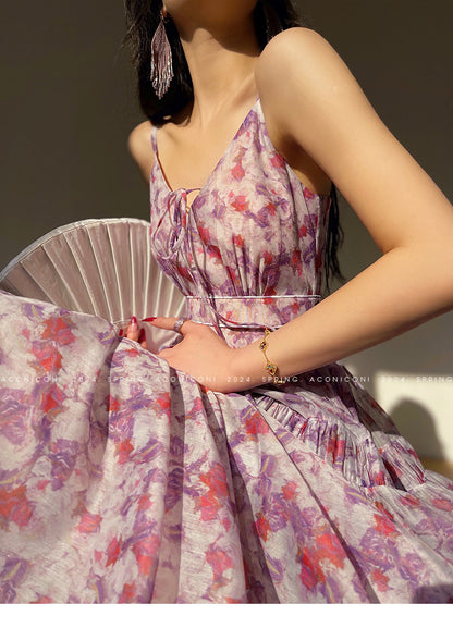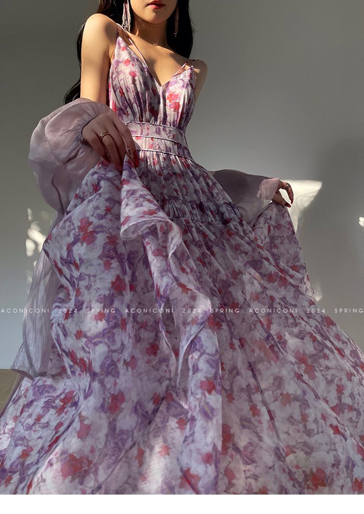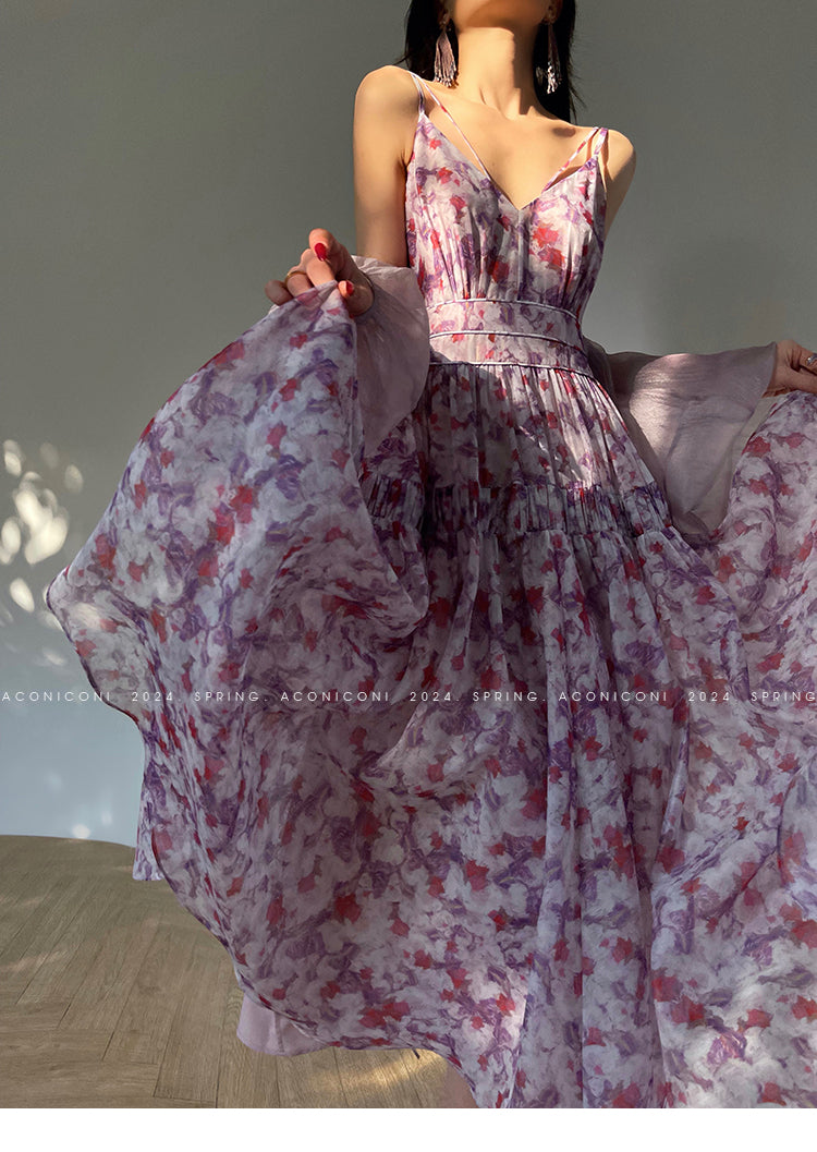 Indulge in luxury with our Aconiconi Elegant Purple Flower Print Dress, featuring a sensual V-neck and sleeveless design. Exude sophistication and style with its elegant print, perfect for your next resort getaway. Elevate your wardrobe with this exclusive Nikita dress.
