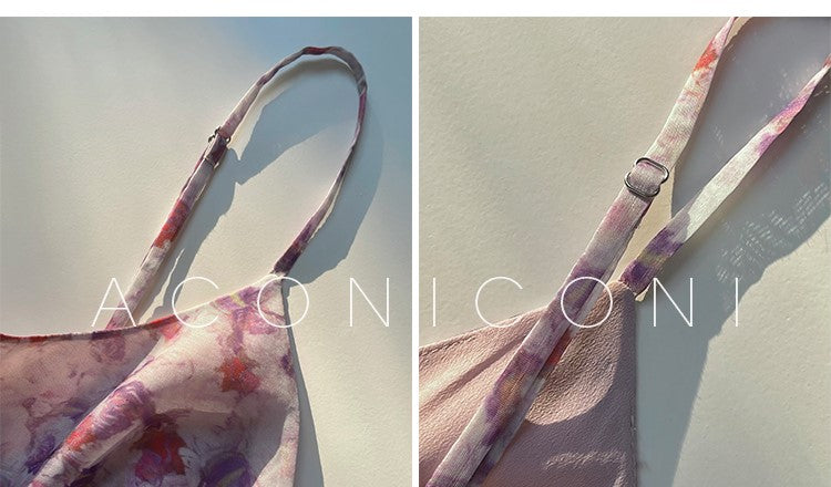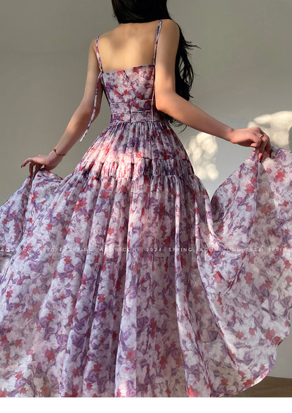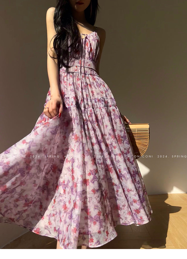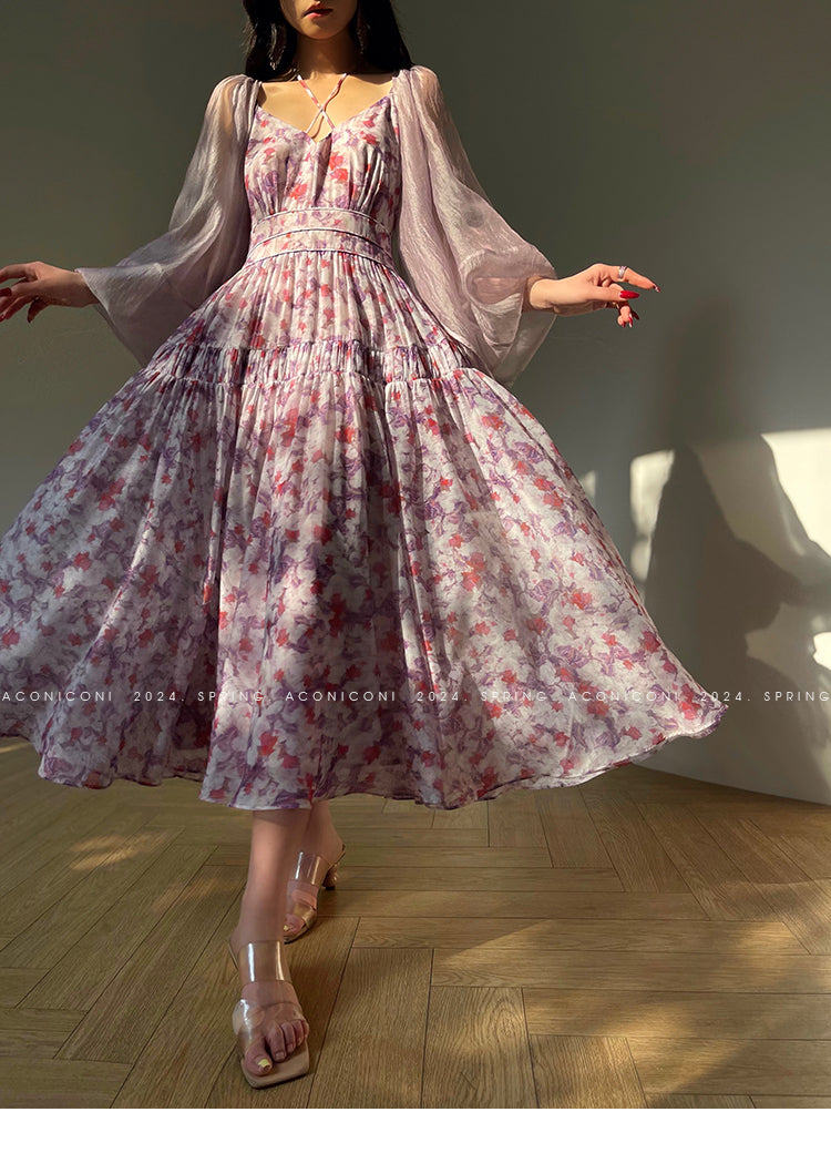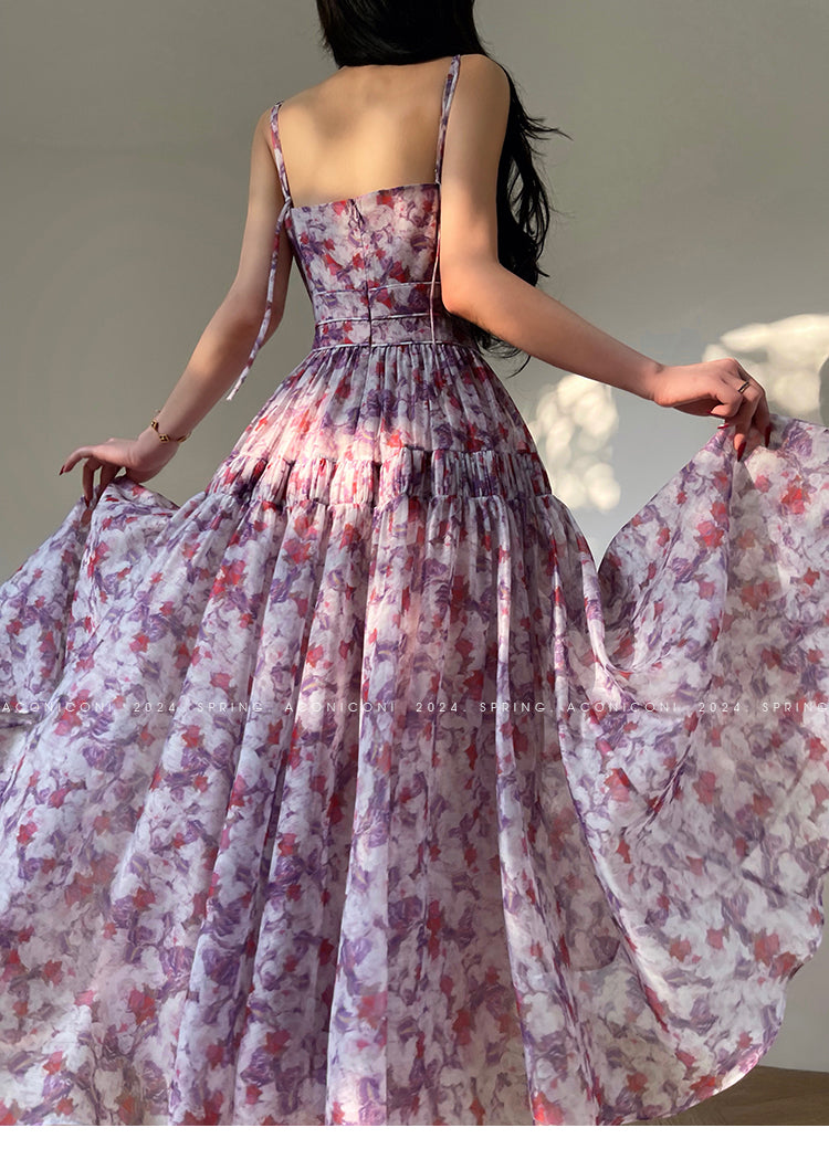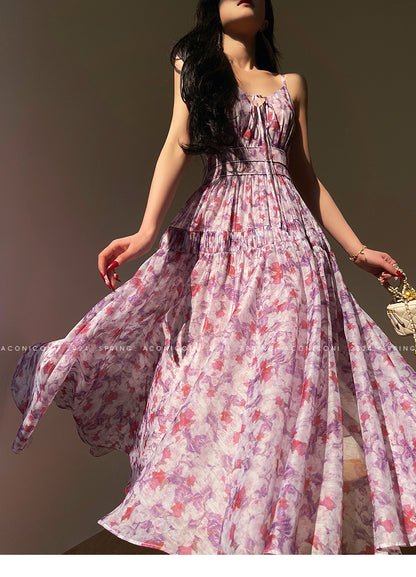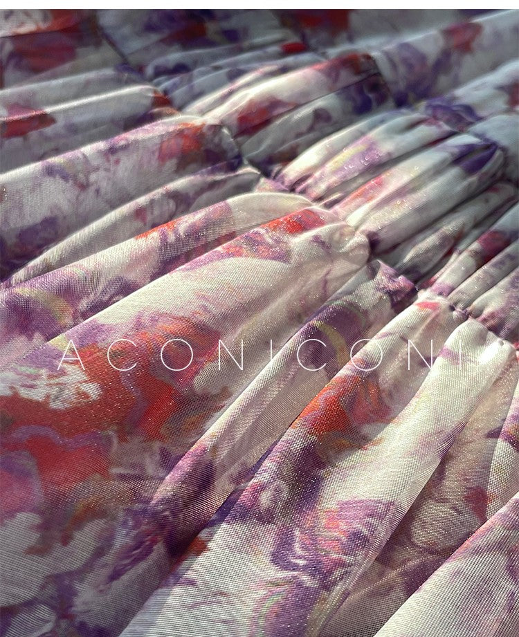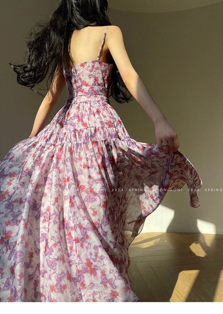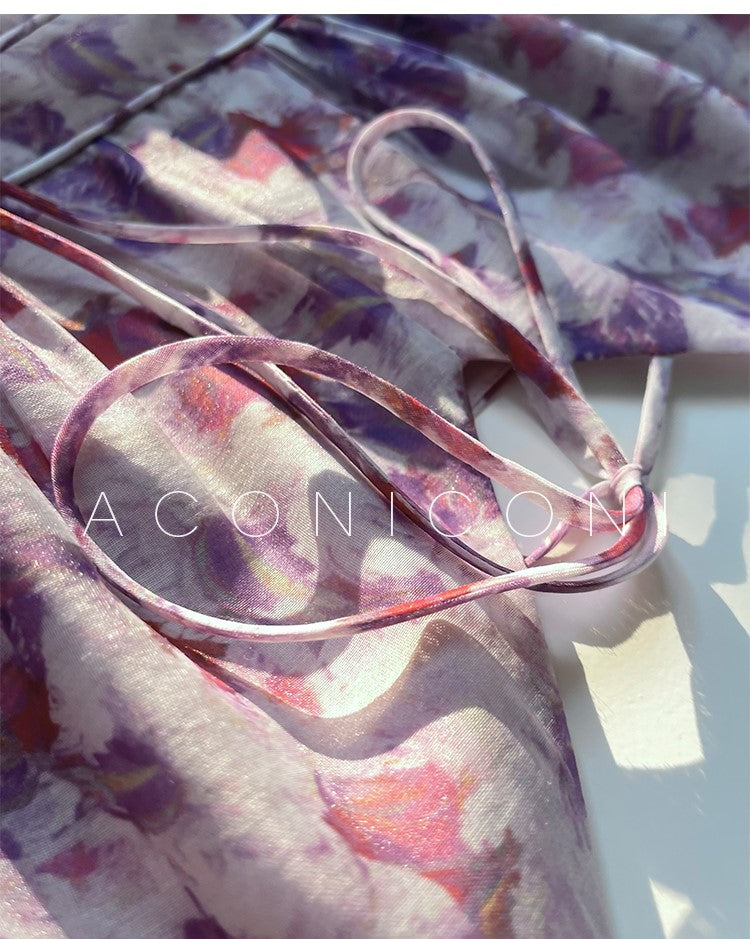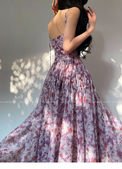 Indulge in luxury with our Aconiconi Elegant Purple Flower Print Dress, featuring a sensual V-neck and sleeveless design. Exude sophistication and style with its elegant print, perfect for your next resort getaway. Elevate your wardrobe with this exclusive Nikita dress.