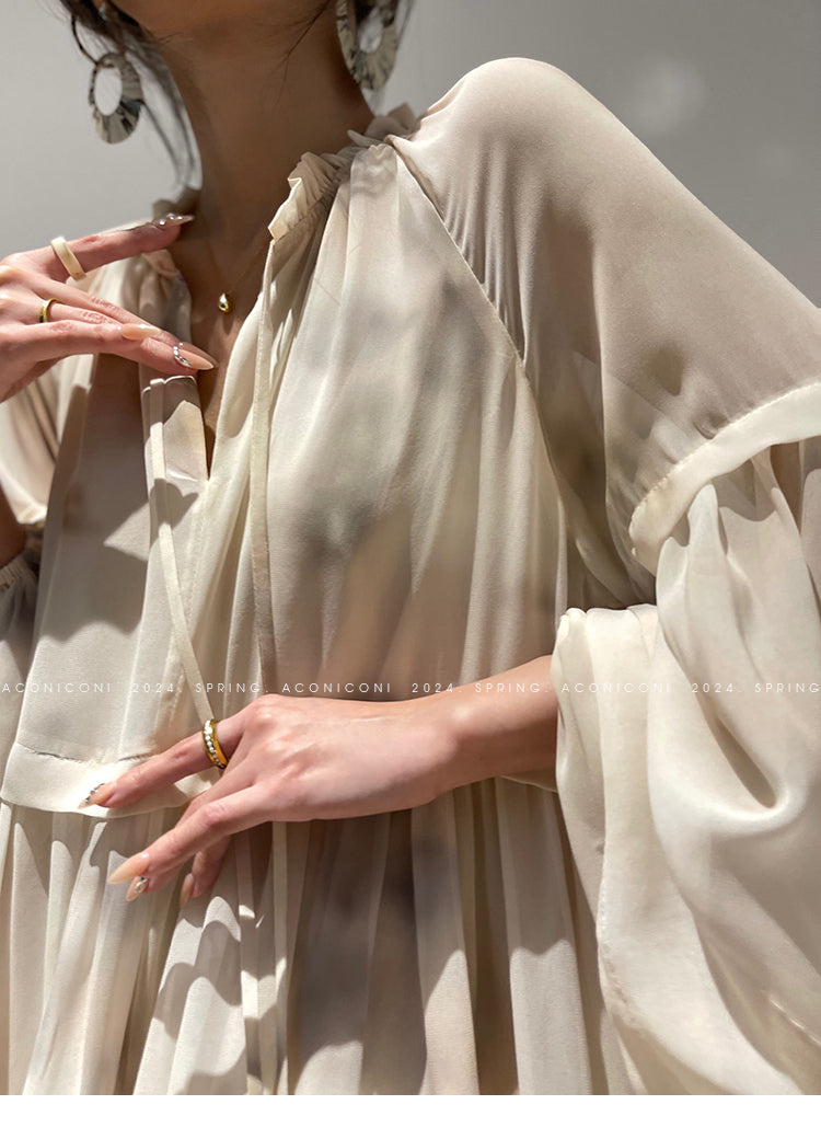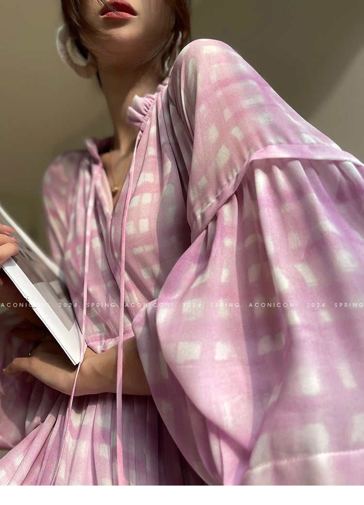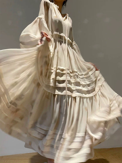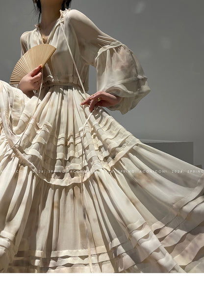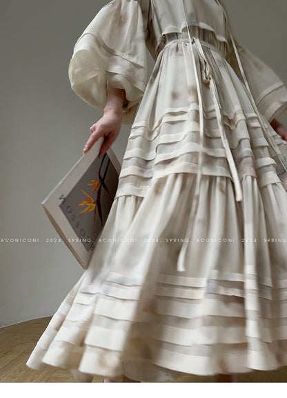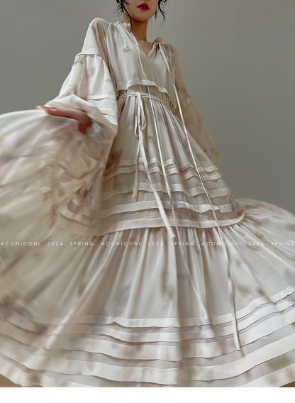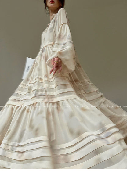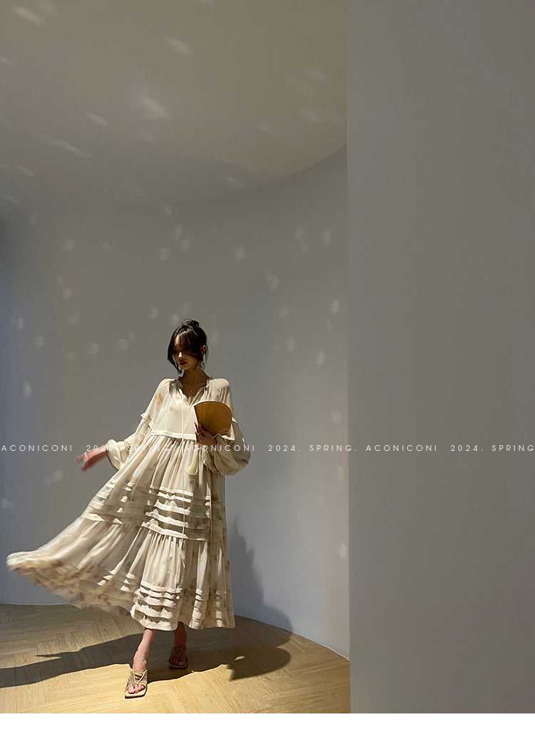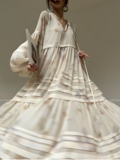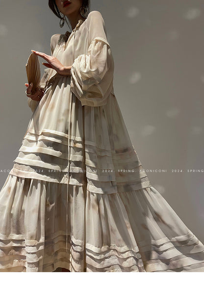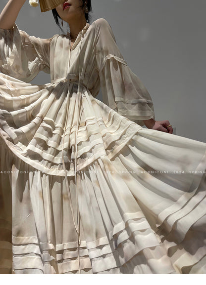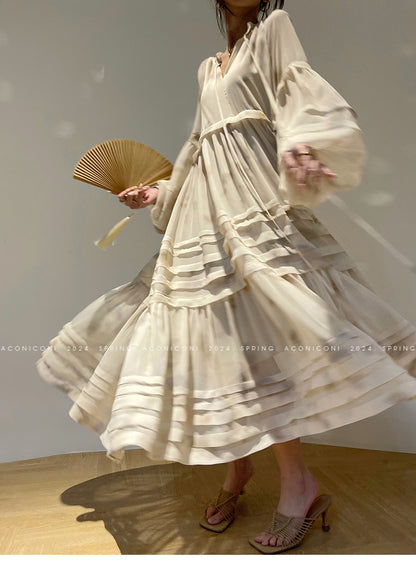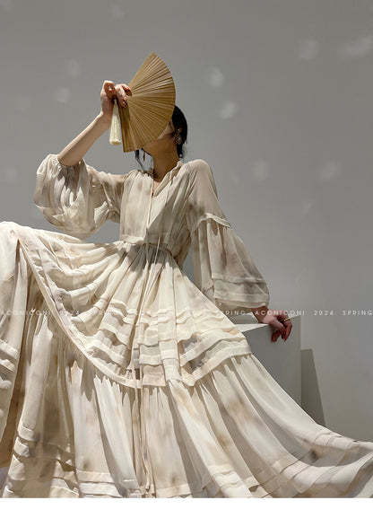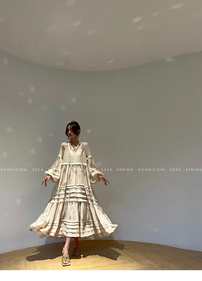 Aconiconi Elegant V-Neck Lantern Sleeve Loose Big Resort Dress - Peach Smoke
