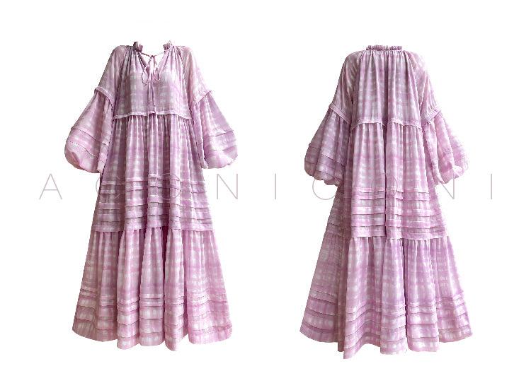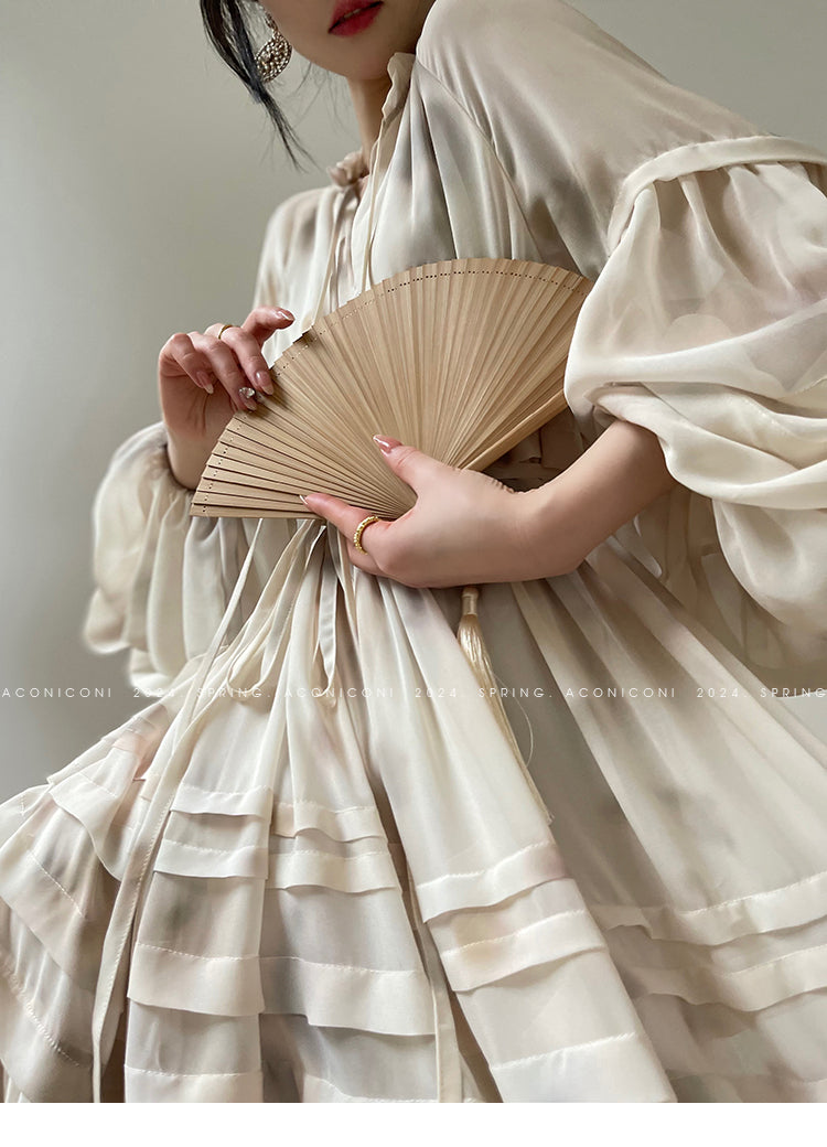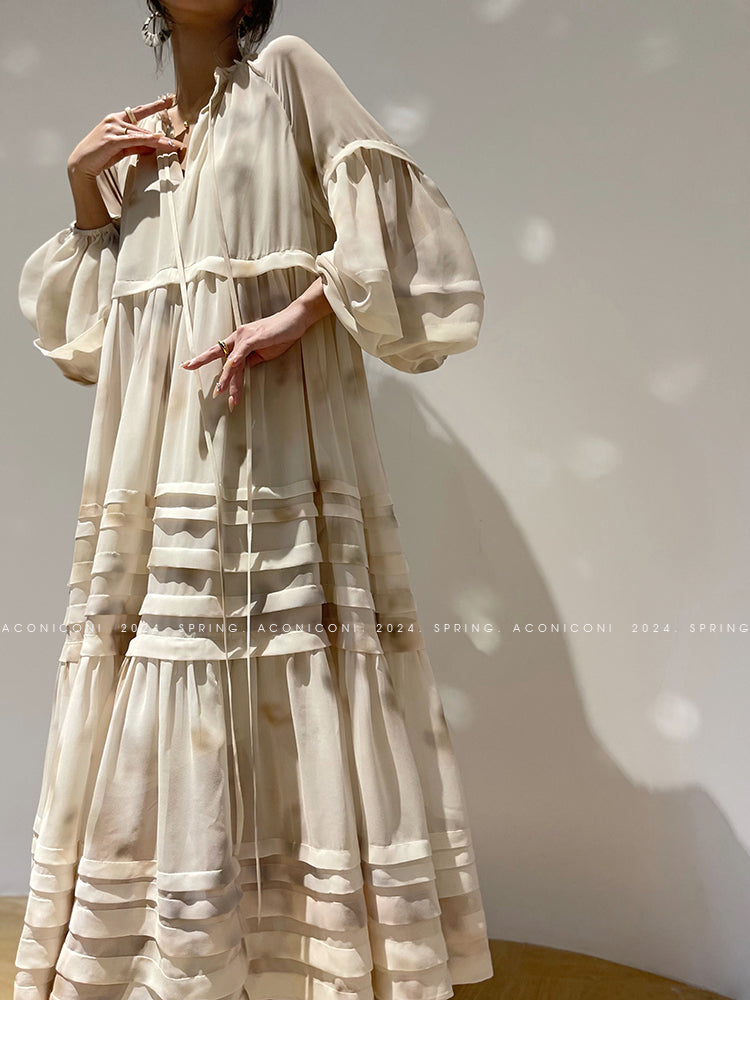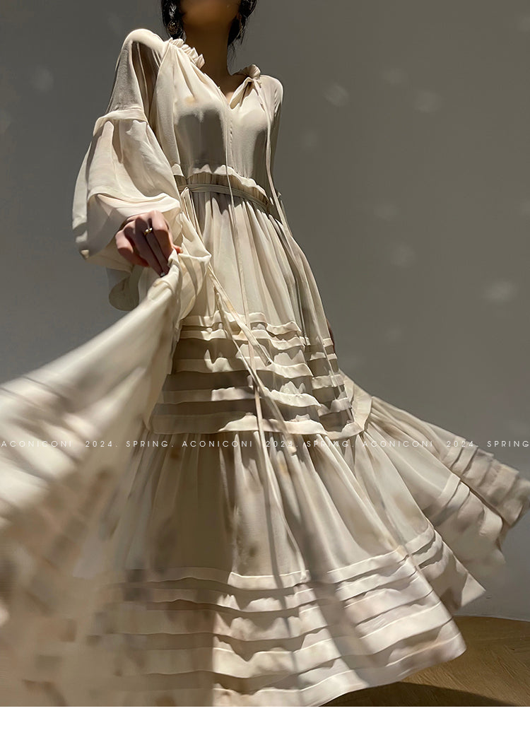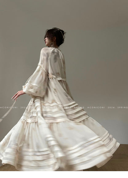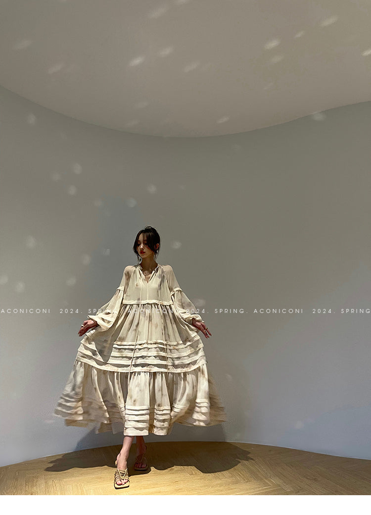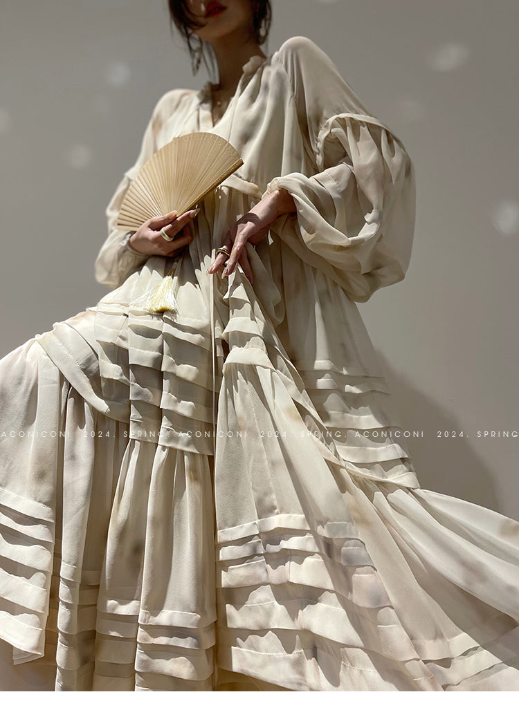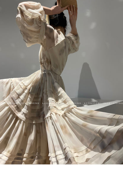 Aconiconi Elegant V-Neck Lantern Sleeve Loose Big Resort Dress - Peach Smoke