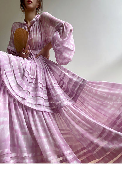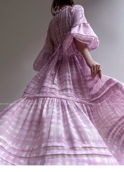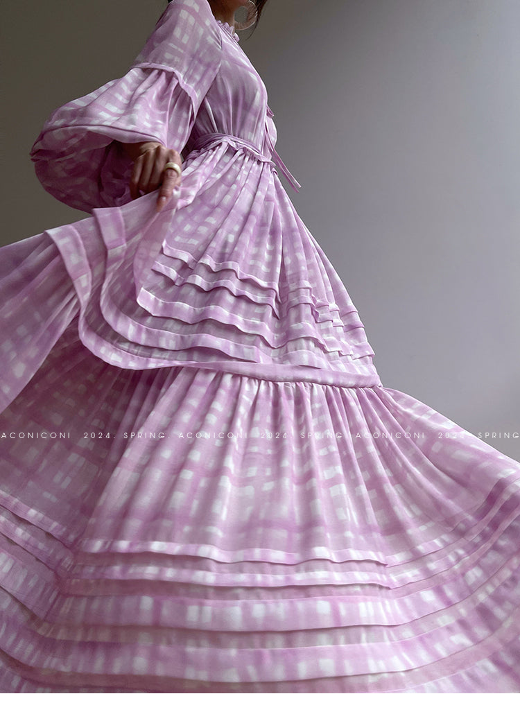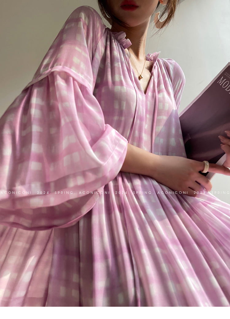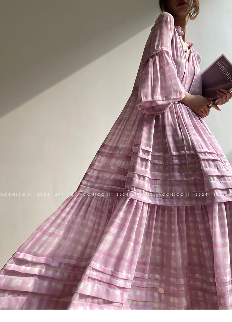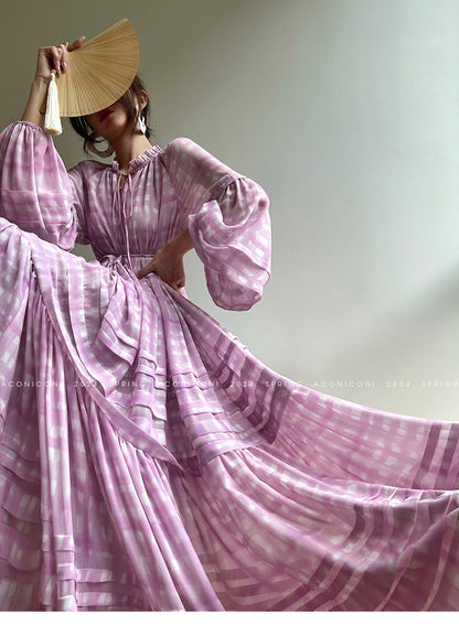 Indulge in luxurious elegance with our Aconiconi loose big resort dress in gorgeous purple. Featuring a stunning v-neck and lantern sleeves, this dashing long dress is the perfect outfit for picnics, weddings, or outings. Its sophisticated and fashionable design is both chic and classy, making it the must-have outfit for fall.