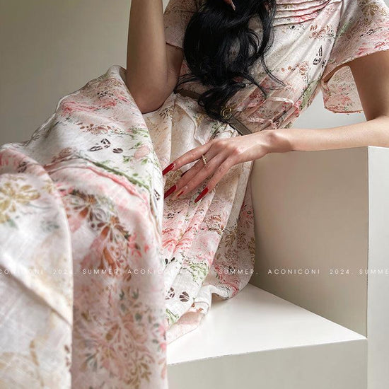 AconiconI Elegant Retro Flower Print Short Sleeve Loose Long Dress- Sweet Early Summer
