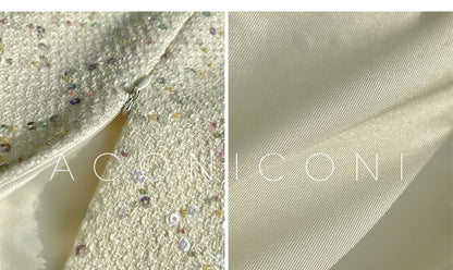 The classic Chanel woven fabric is blended with 3 kinds of off-white yarns of different thicknesses. The coarse and fine yarns are interlaced in warp and weft, and the layers are rich. Through the complicated special weaving, the coarse and fine textures are interwoven quite tightly.