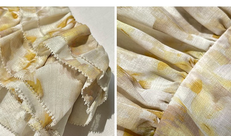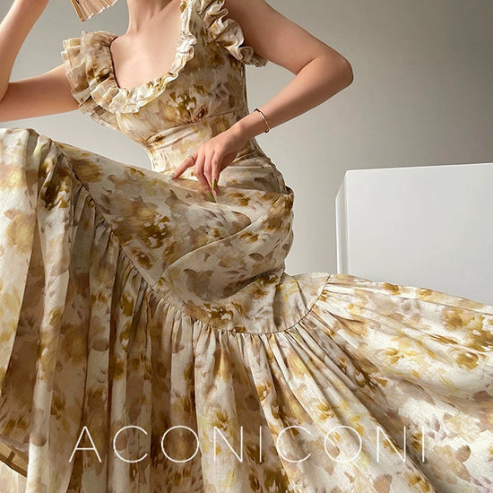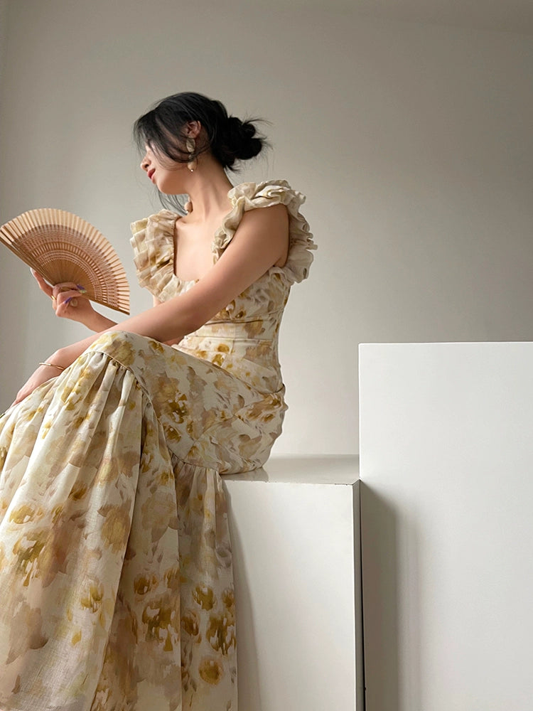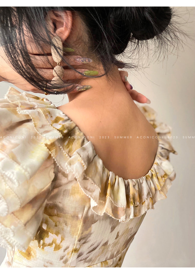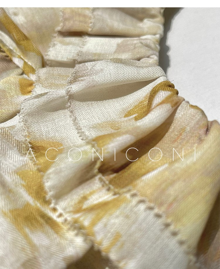 Aconiconi Elegant U-Neck pleated Short Sleeve Tea Dinner Date Dress- Ginger Flower Summer