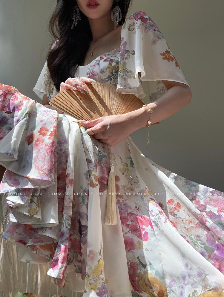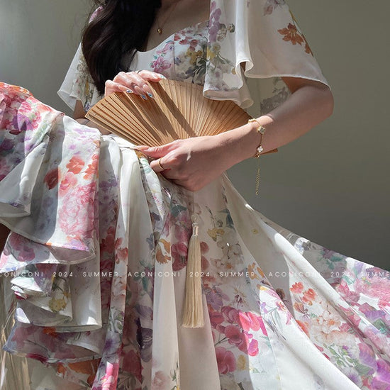 Indulge in the luxurious beauty of the Aconiconi Elegant V-Neck Resort Dress. Its elegant V-neckline and short sleeves are perfectly complemented by the stunning floral print, evoking a sense of beauty and grace. Experience the essence of a fairy tale in this flowery scenery dress, a true gem for your wardrobe.