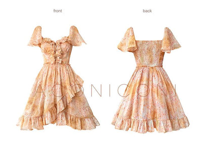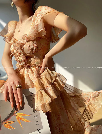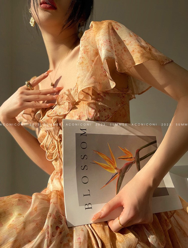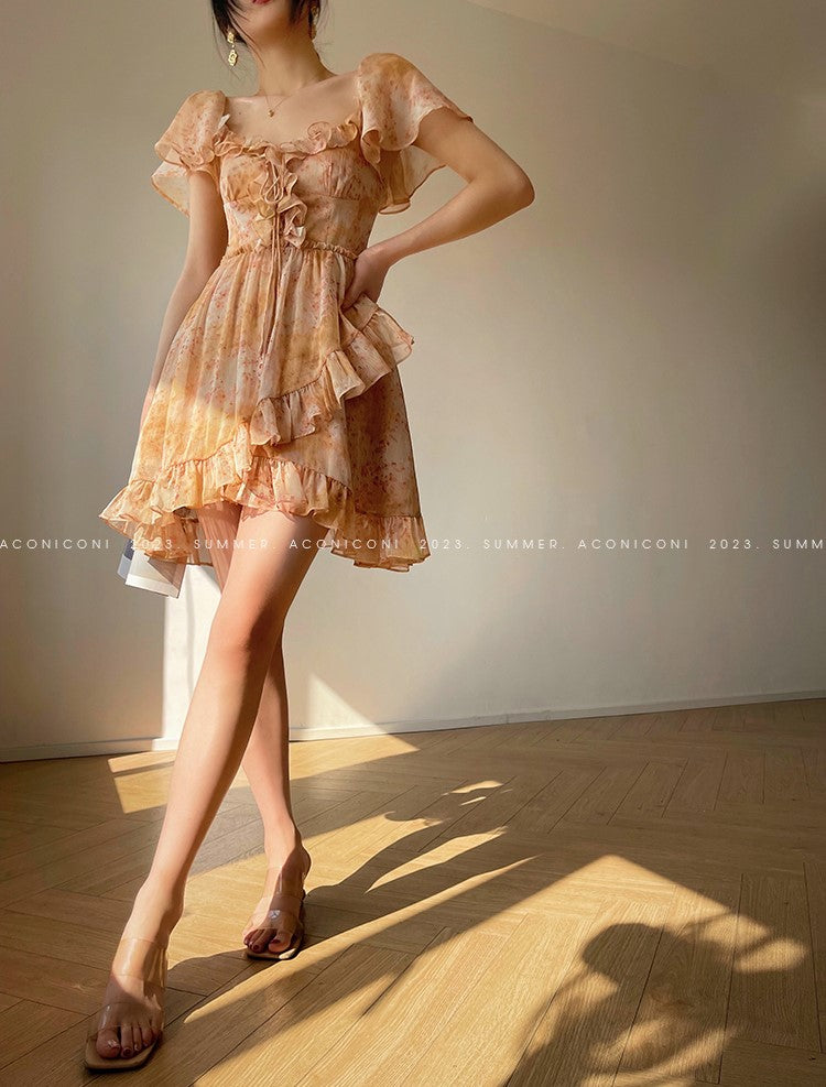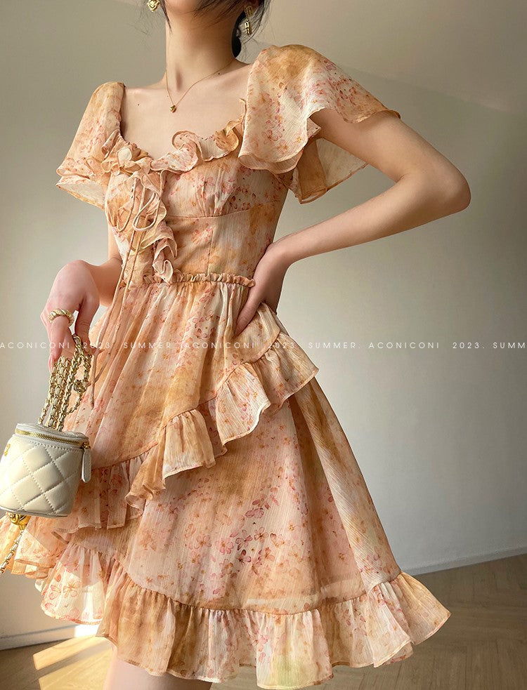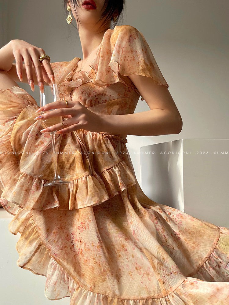 Aconiconi Elegant Warm French Printed Ruffle Short Tea Dress- Huayu Sweet Tea