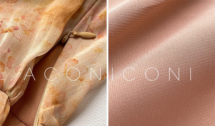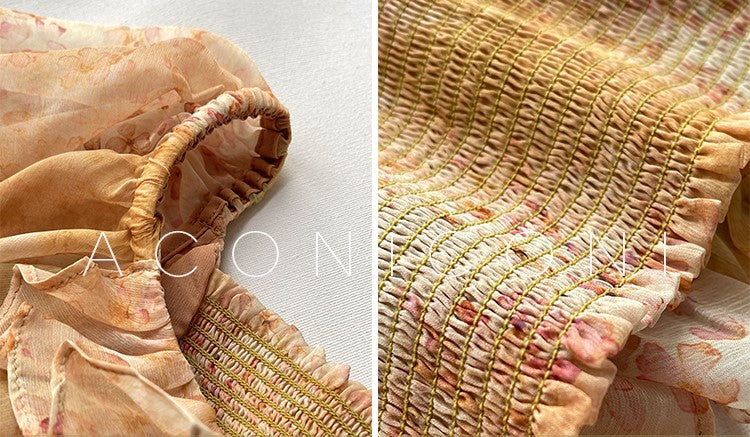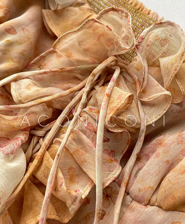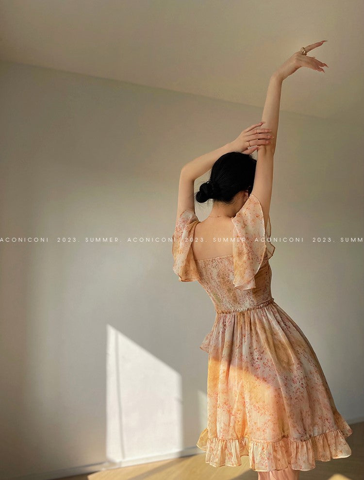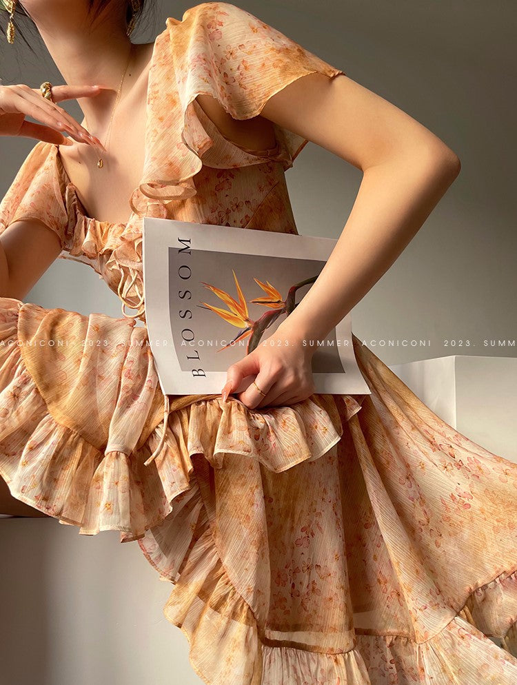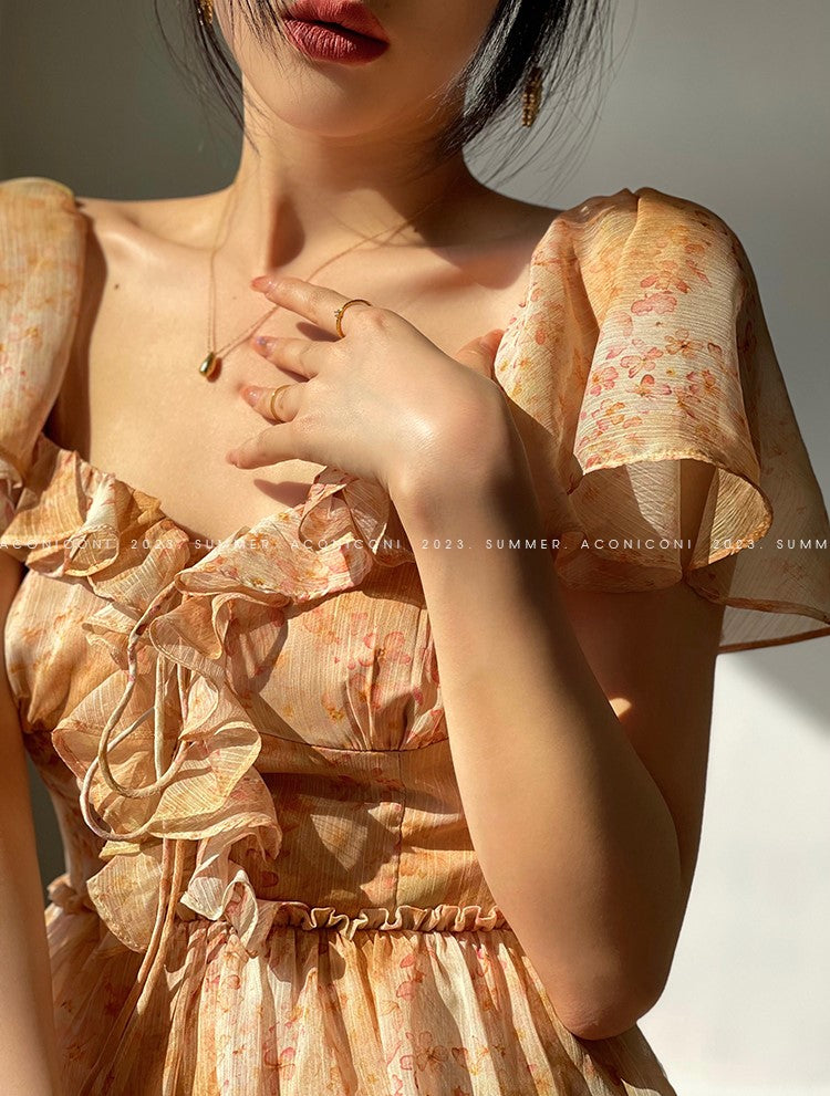 Aconiconi Elegant Warm French Printed Ruffle Short Tea Dress- Huayu Sweet Tea