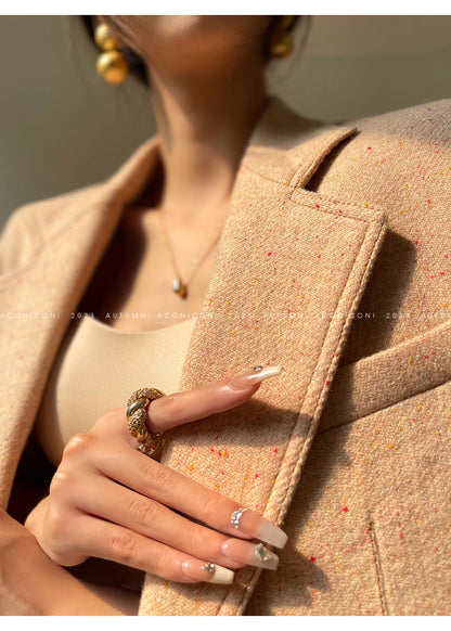 The Aconiconi Girl Full wool French blazer is a luxurious and sophisticated fashion statement for any woman. With its full wool construction, beautiful pleated skirt suit, and elegant long sleeves, this blazer will instantly elevate any stylish ensemble. It's the perfect piece for the modern woman who appreciates quality and sophistication.