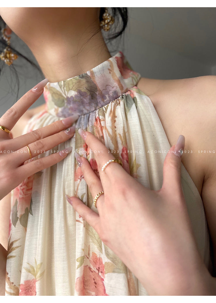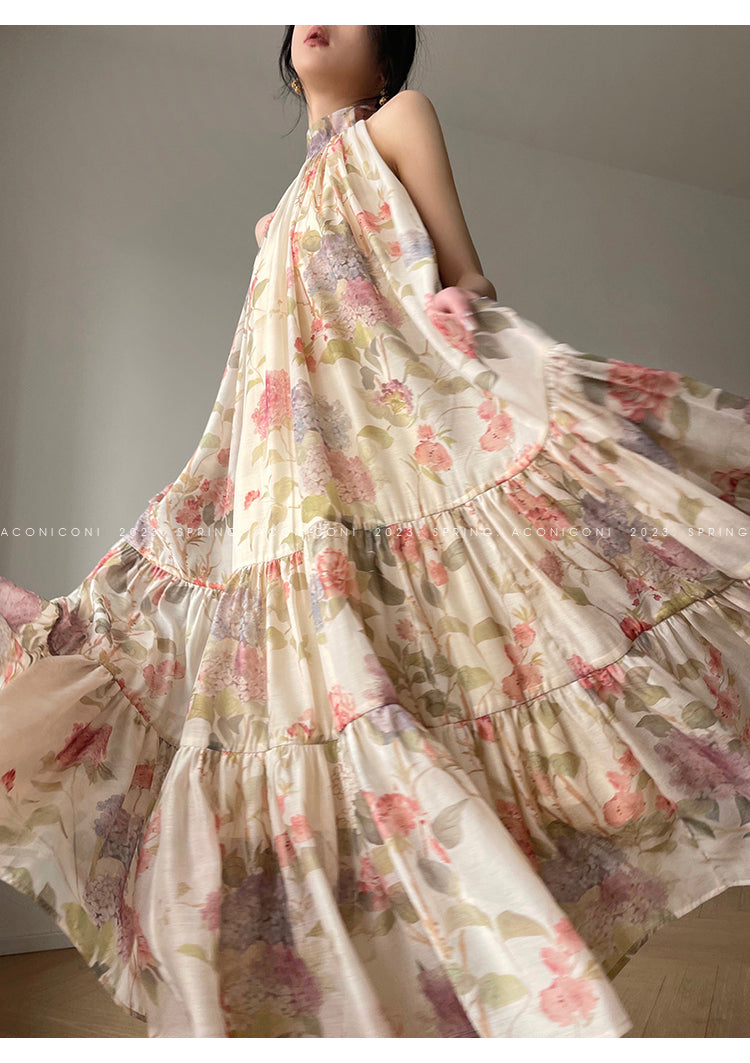 Aconiconi High End Floral Print Sleeve Less Halter Neck Long Resort Dress- Spring Dream