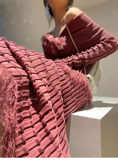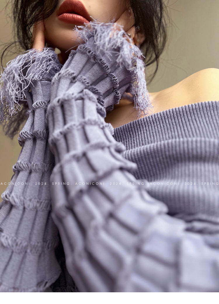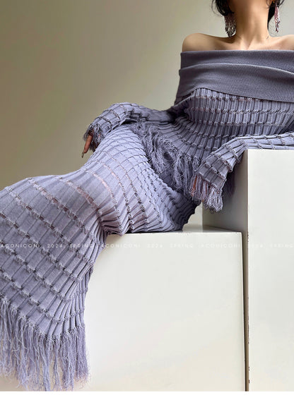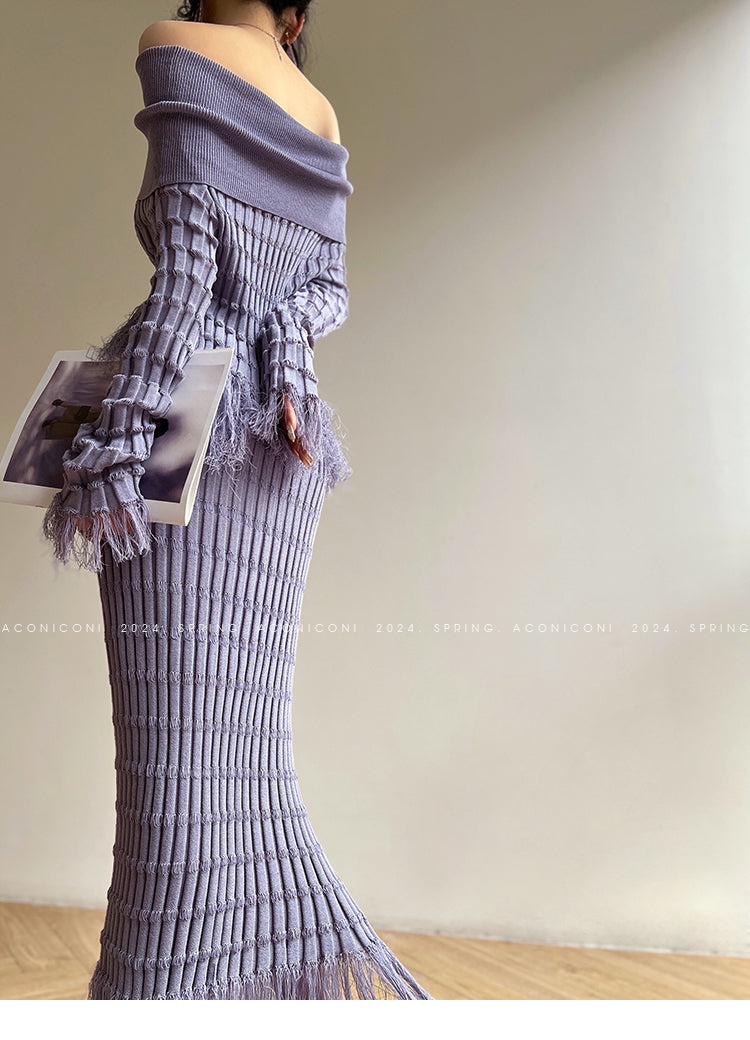 Aconiconi High EndOff Shoulder bodyon Long sweater skirt top- Lavender Hibiscus