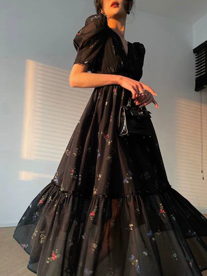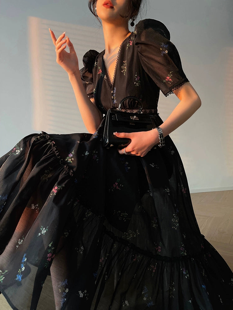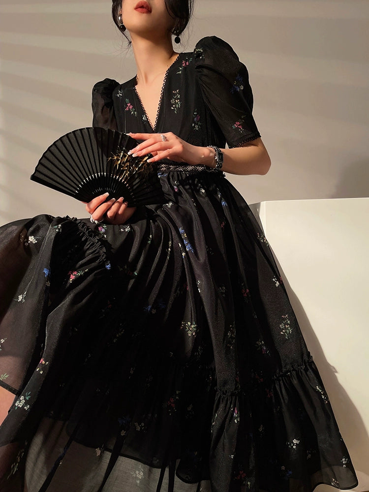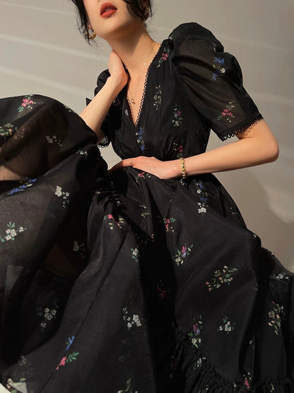 Aconiconi Luxury Black Retro Floral Print V-Neck Slim Waist Midi Cocktail Dress- Dark Fragrance