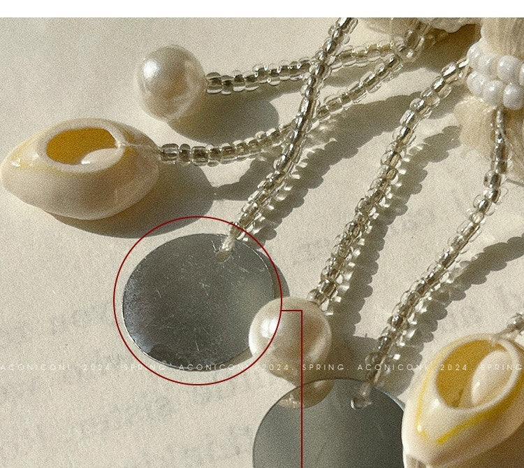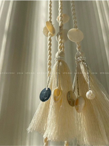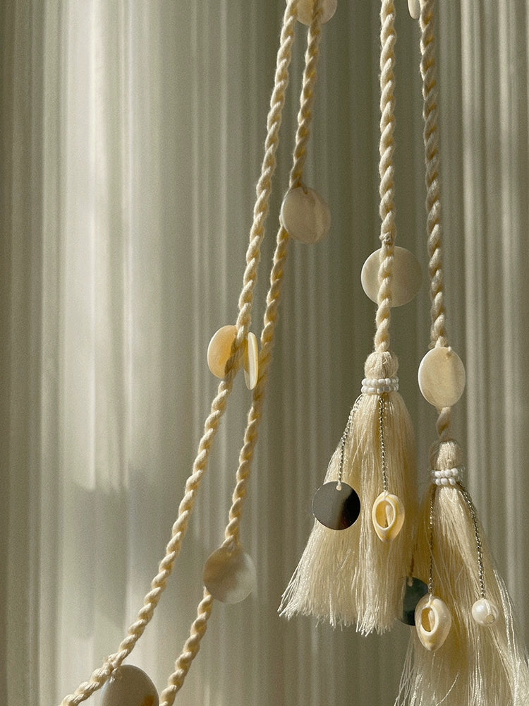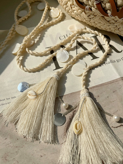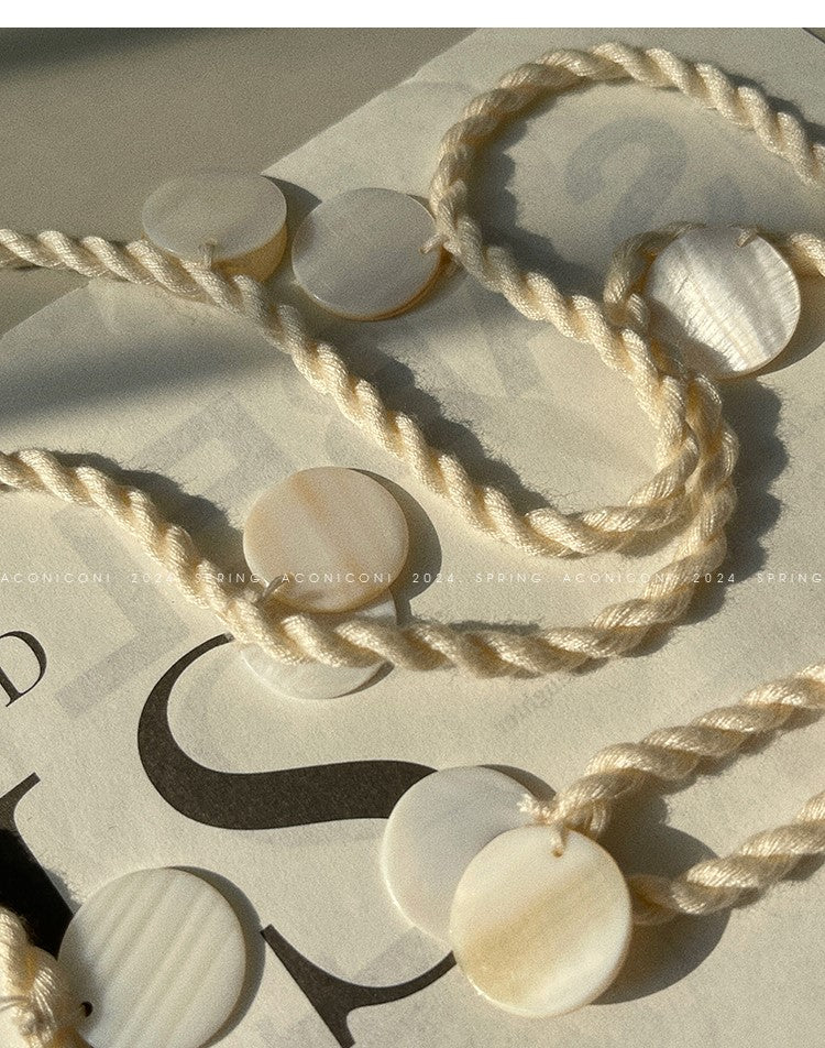 The thin ropes are twisted together to add a sense of detail and texture. Wrapped around the waist, it is wanton and flexible. The natural white color is embellished with natural shell discs. The pure natural mother-of-pearl has a radiant luster giving it a romantic and elegant feel.