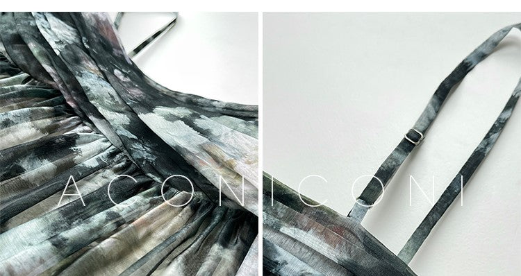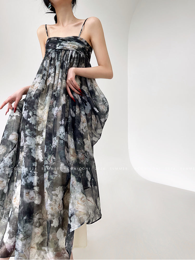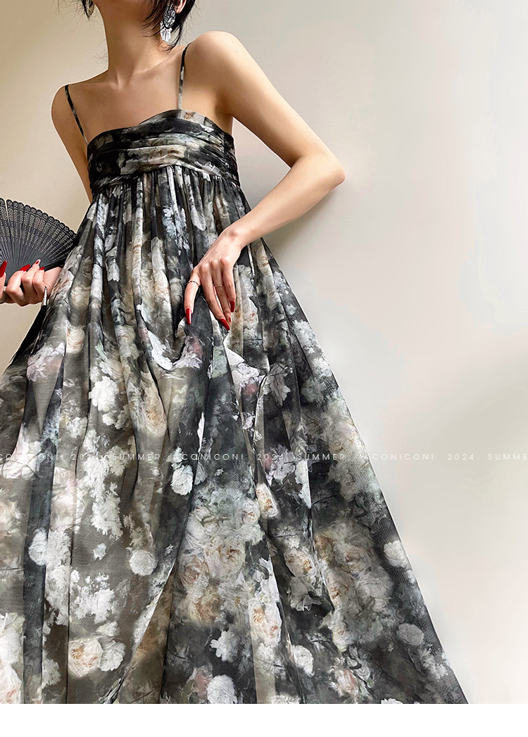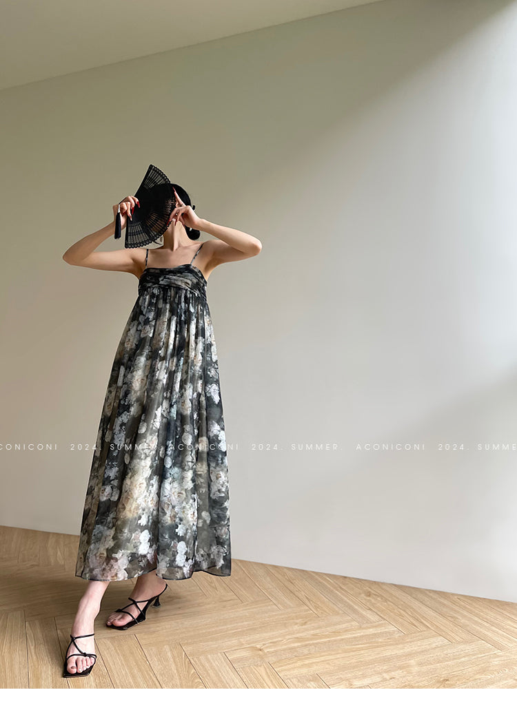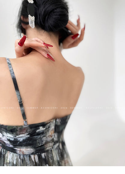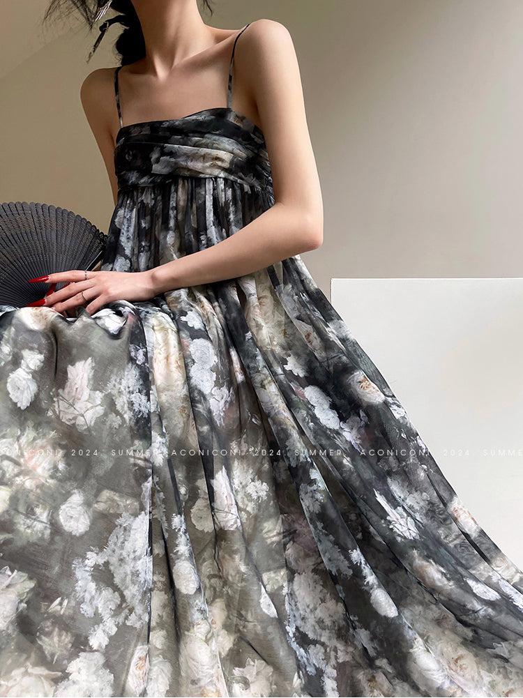 Aconiconi Luxury Chinese Style Ink Floral Print Loose Summer Suspender Dress- Mohua