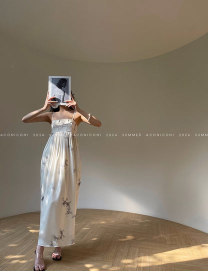 Aconiconi Luxury Floral Print Chinese Style Tube Loose Resort Dress-Ink Gel