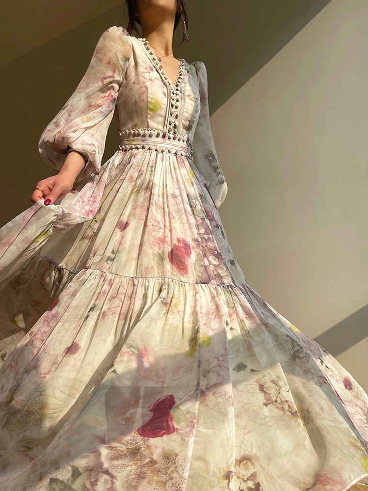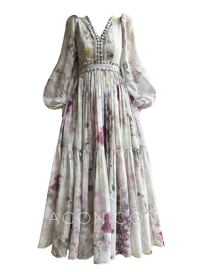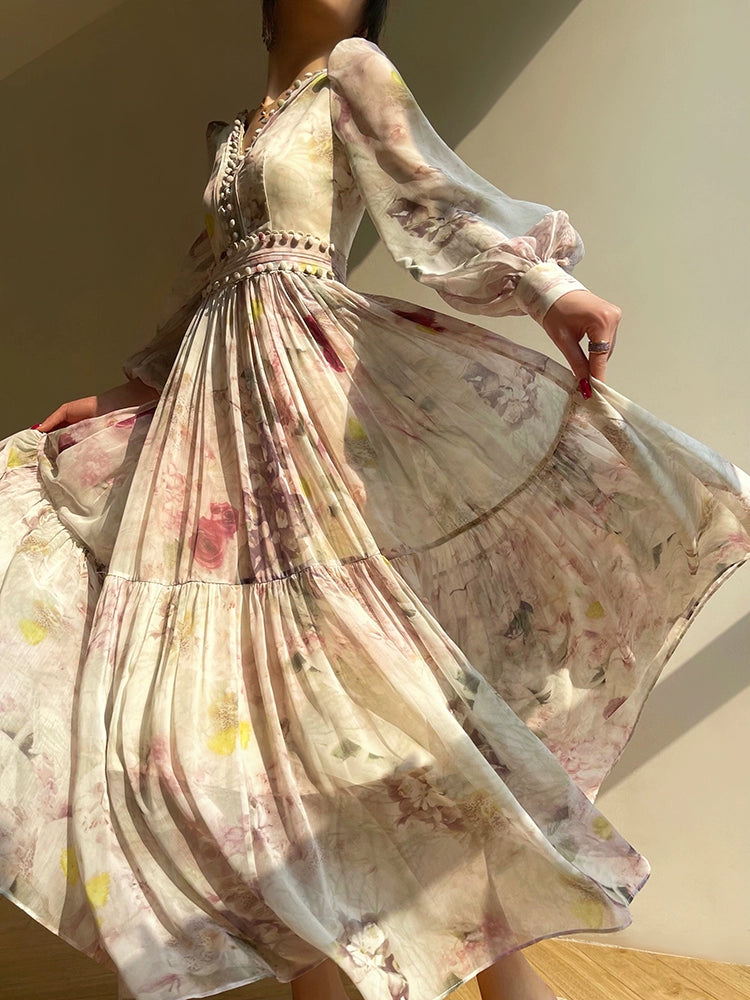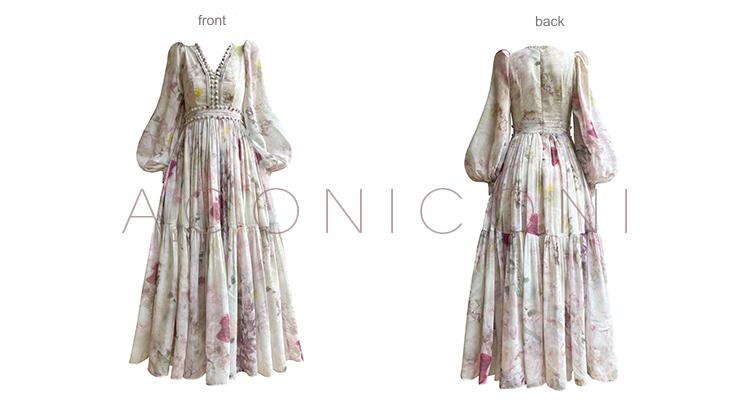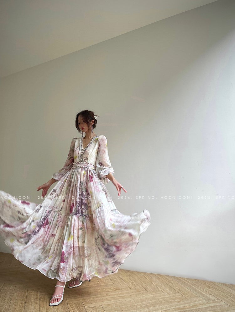 Aconiconi Luxury French Print V-Neck Long Sleeve Pleated Wedding Guest Dress- Liwu