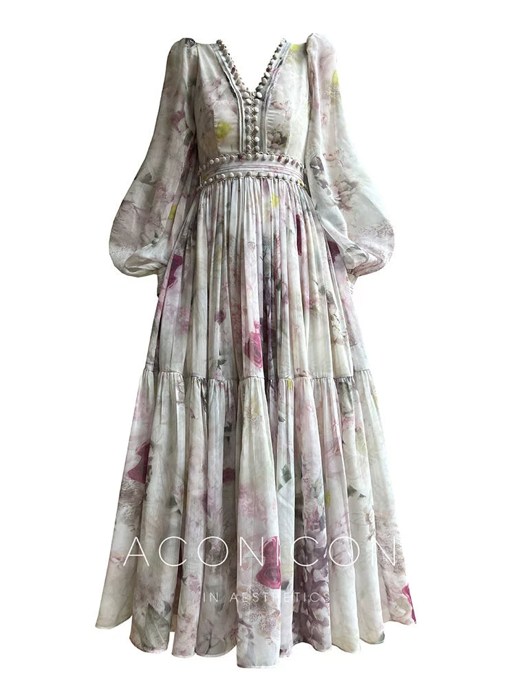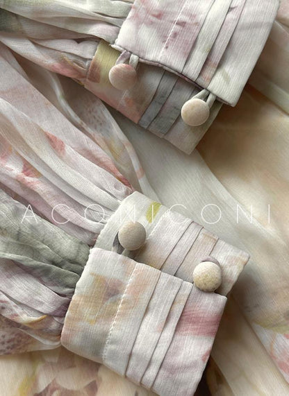 Indulge in luxury with the Aconiconi Connie dress. This exquisite French print V-neck dress features long pleated sleeves and a flowy, floor-length silhouette. Perfect for weddings or special occasions, its effortless elegance will make you the center of attention. Fall in love with its chic, sophisticated design and feel confident and stylish in this stunningly beautiful dress.