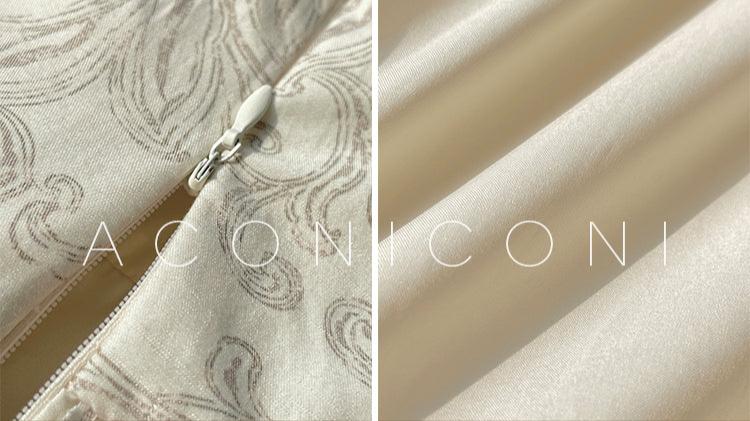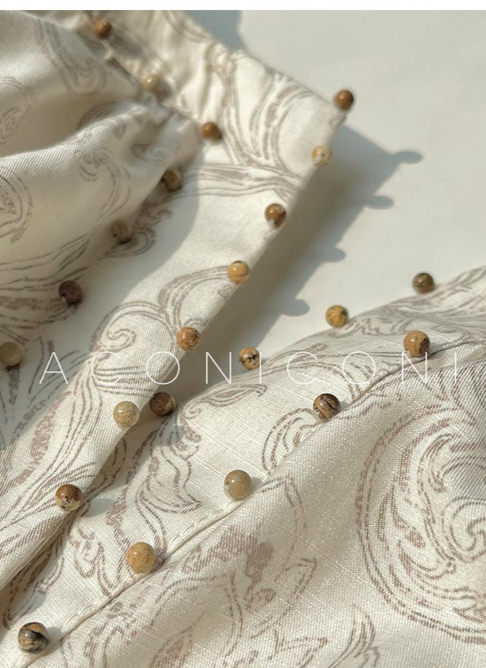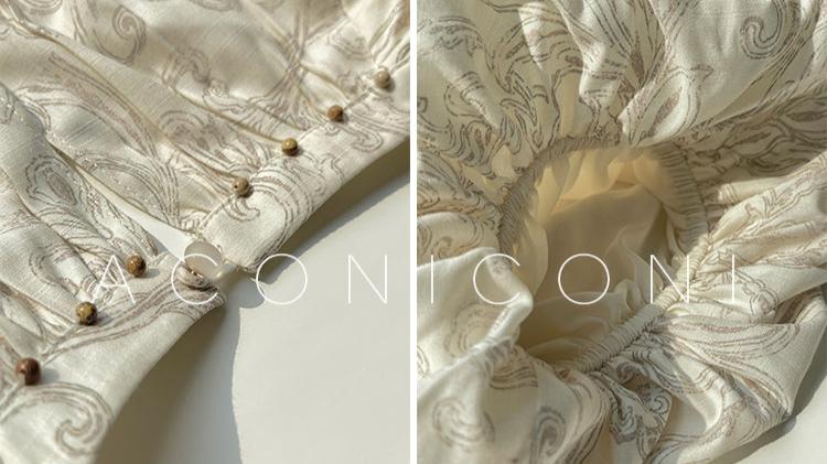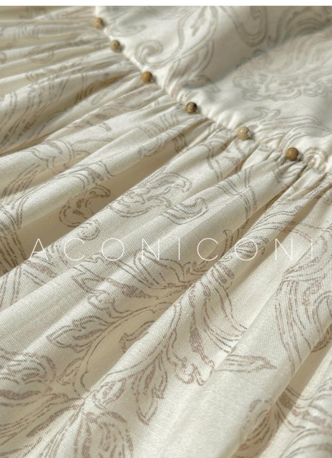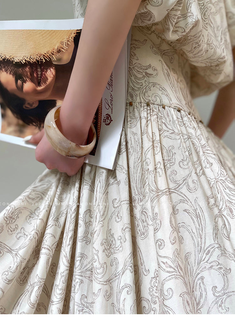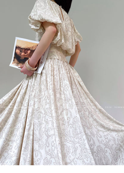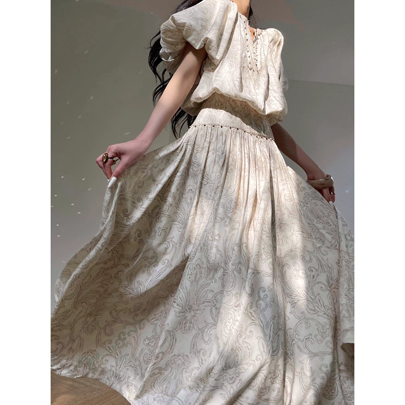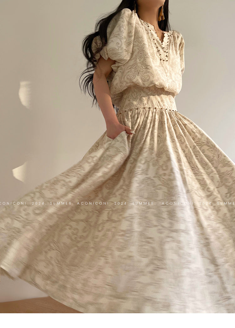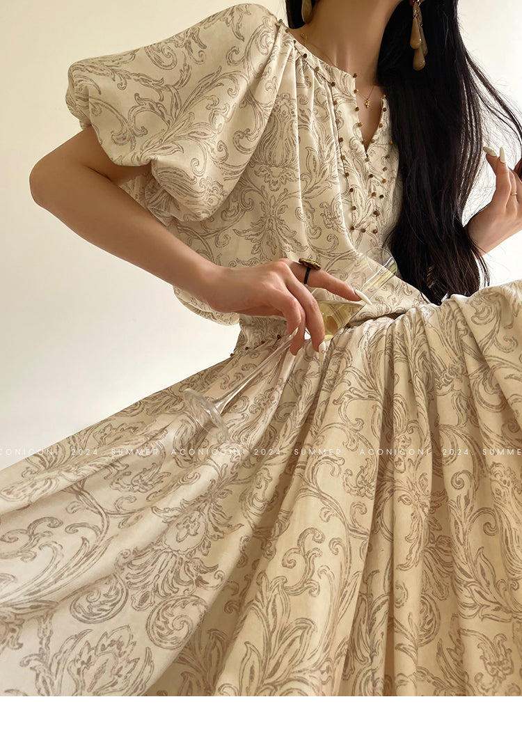 Aconiconi Luxury French Retro V-Neck Printed Puff sleeves Long Dress-Rhine Girl