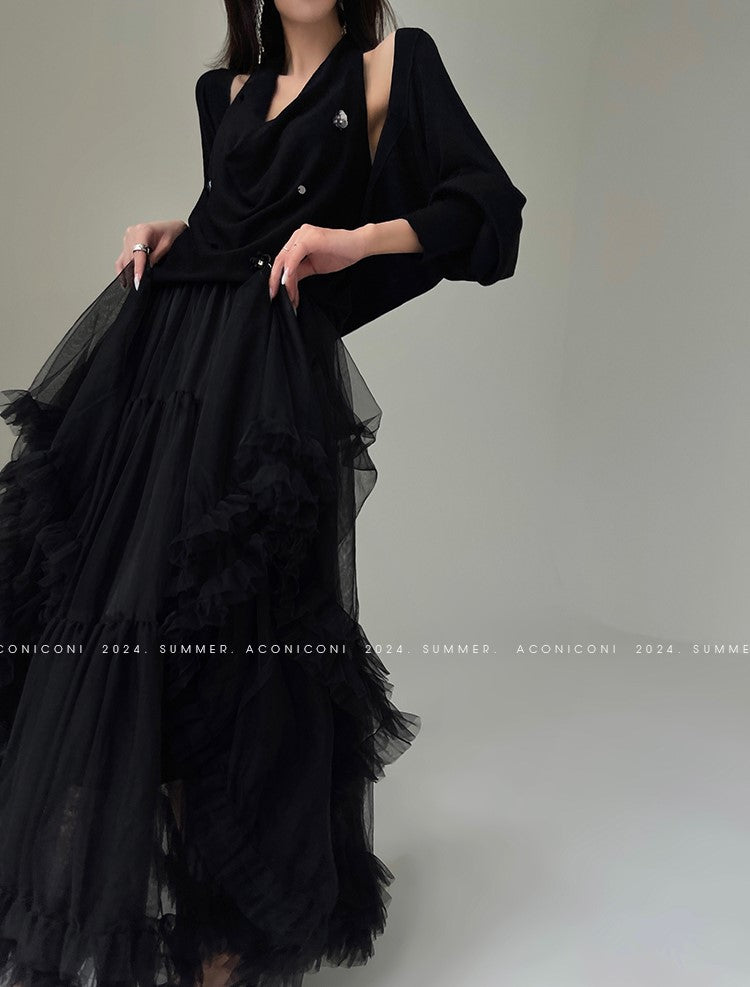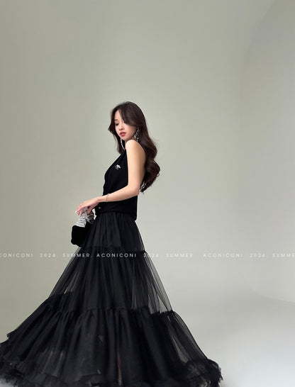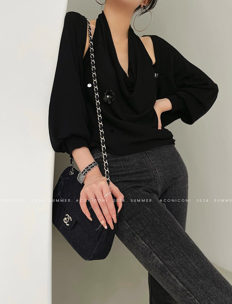 Aconiconi Luxury Deep Cowl Halter Neck Sleeveless Sequin Flower Top- Dream of Flowing Light