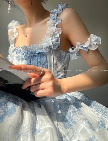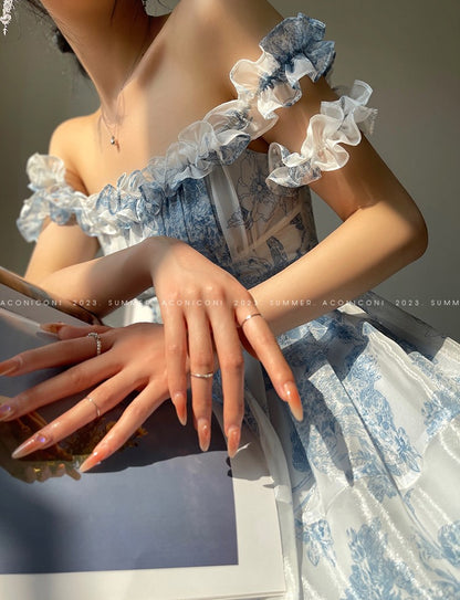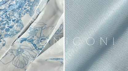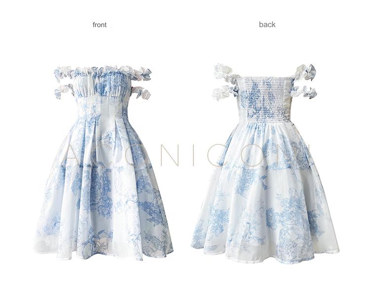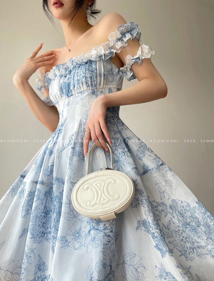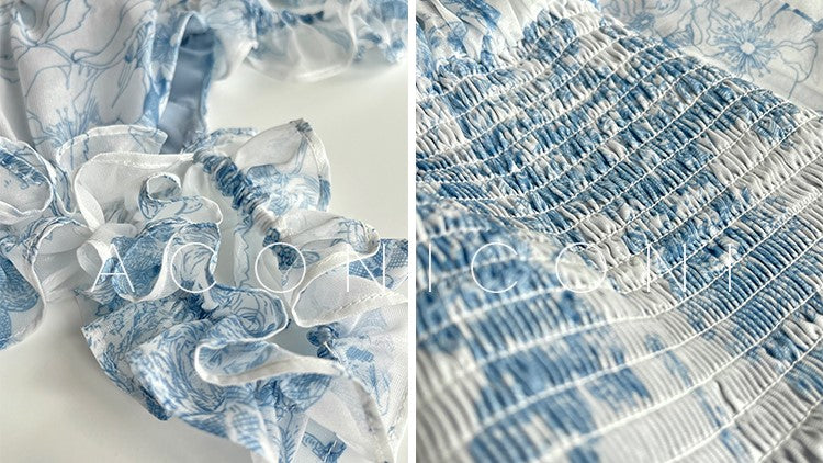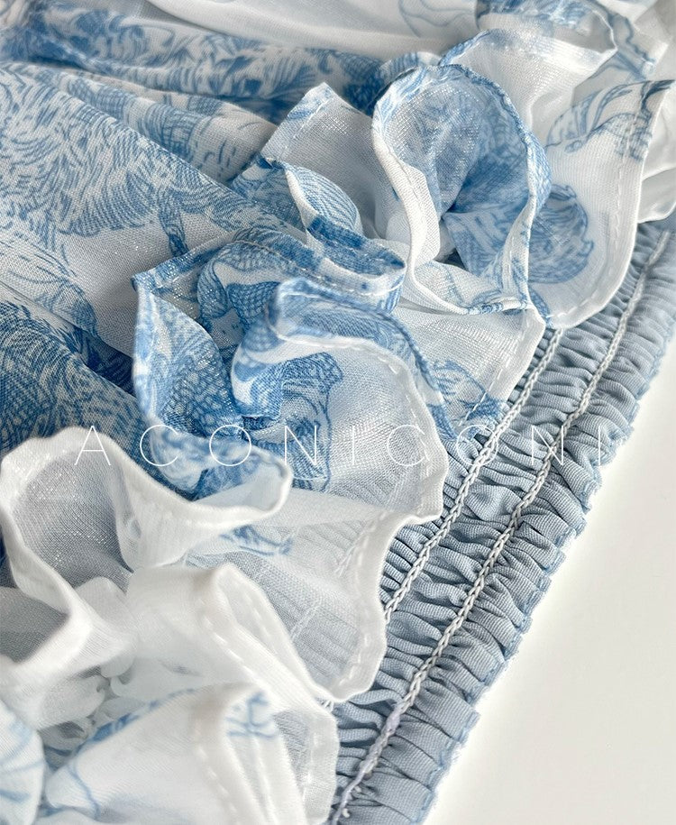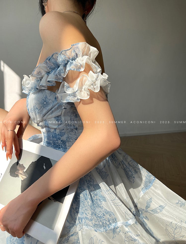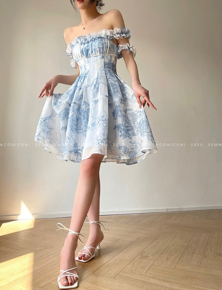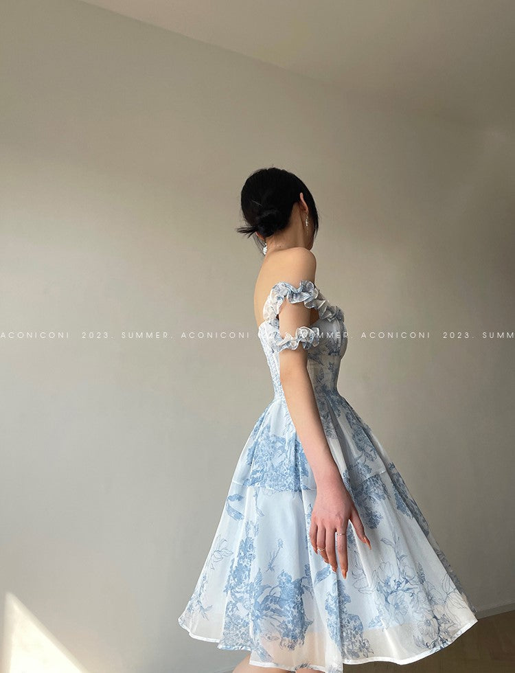 Aconiconi Luxury Light Blue Crew Neck High Waist A-line Short Dress- Haiyu