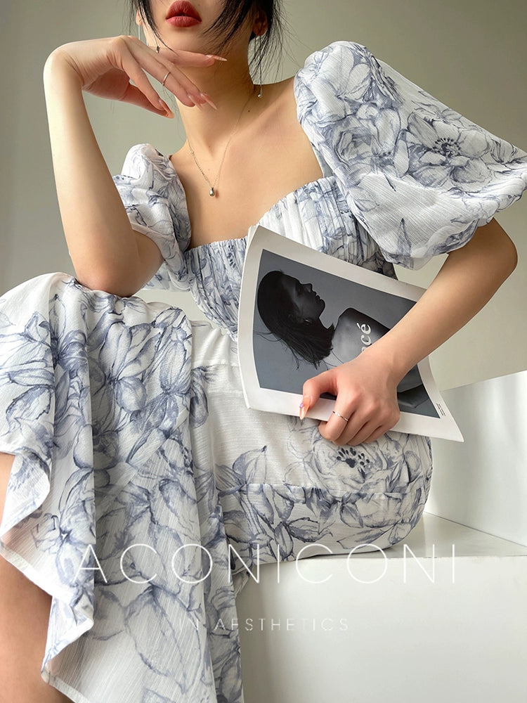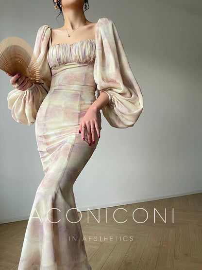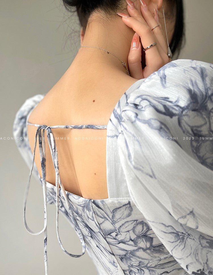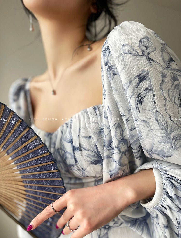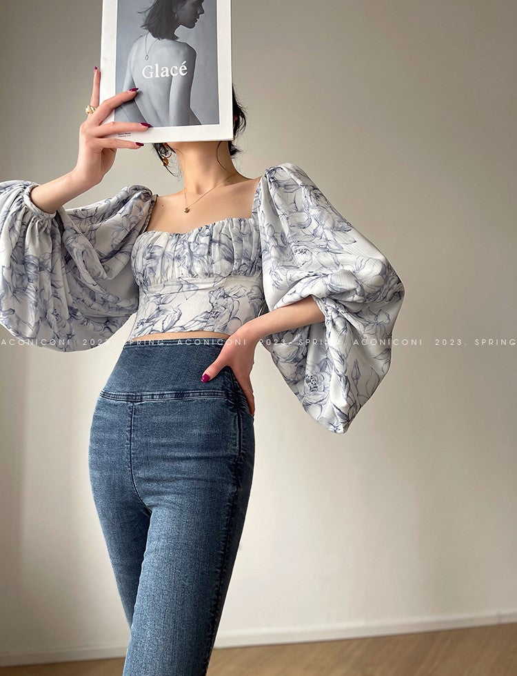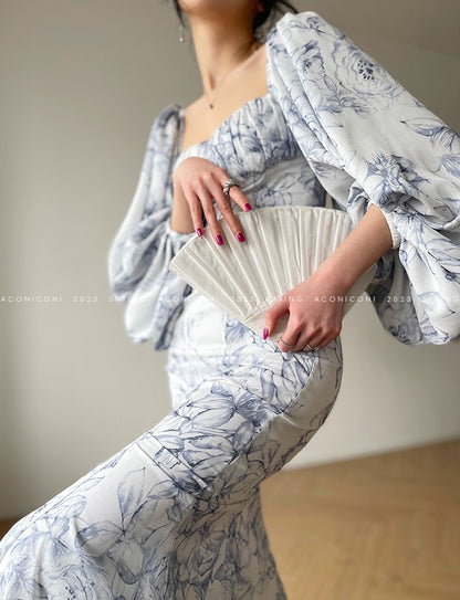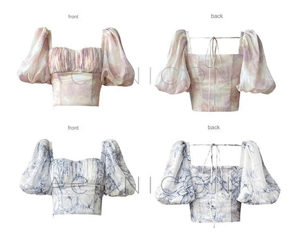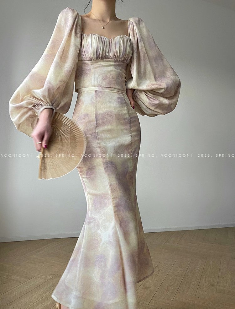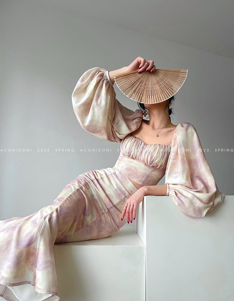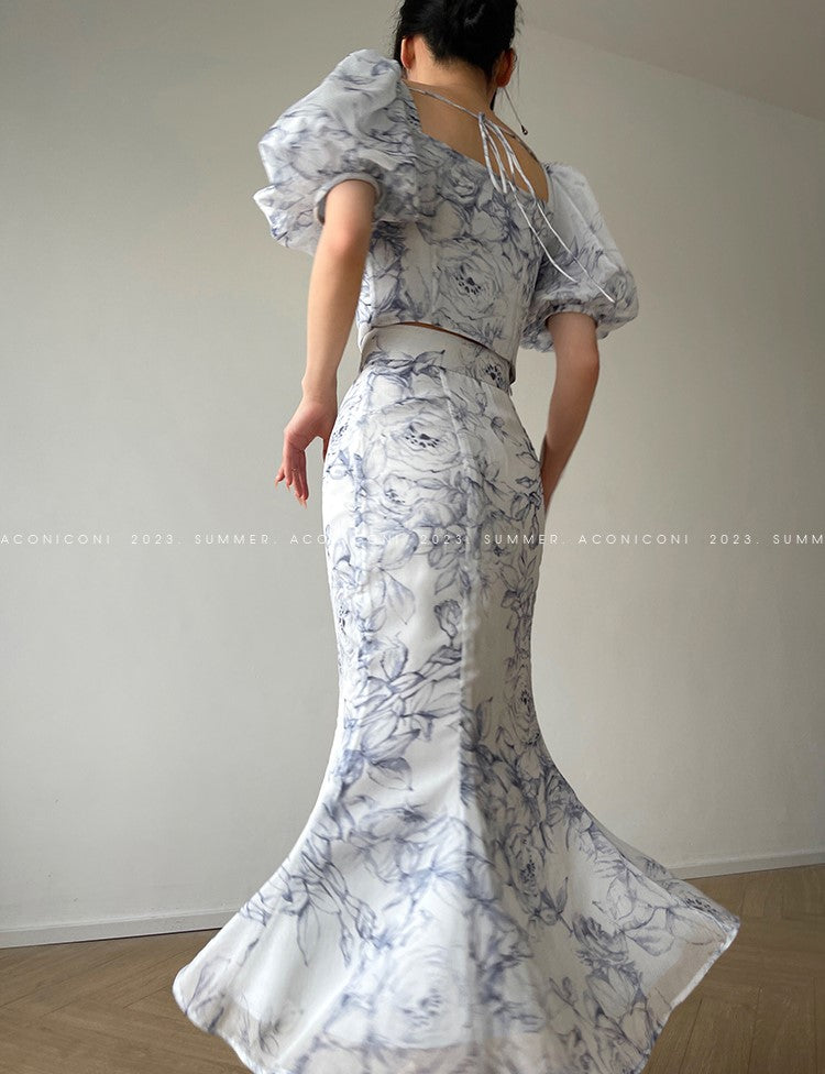 Aconiconi Luxury Square Neck Lantern Sleeve Top/ long Skirt- Angelica dahurica frost