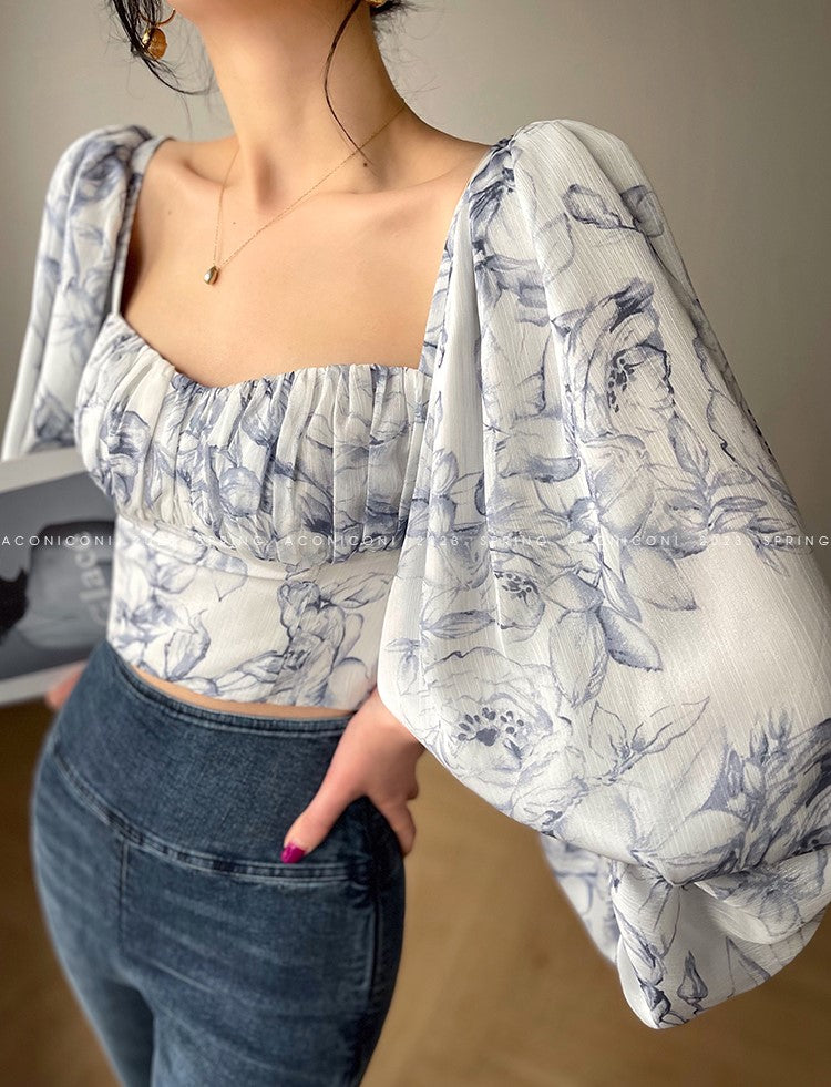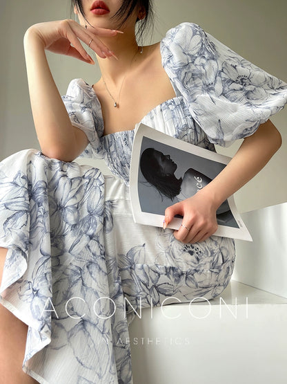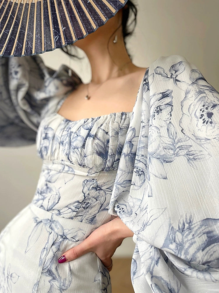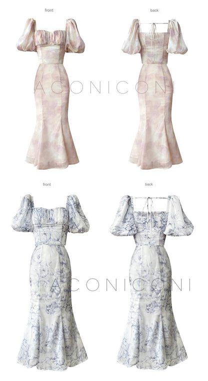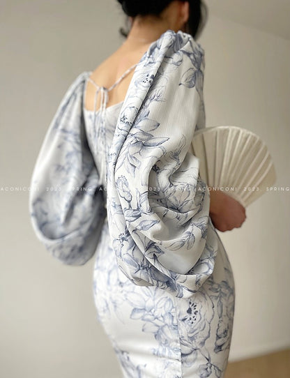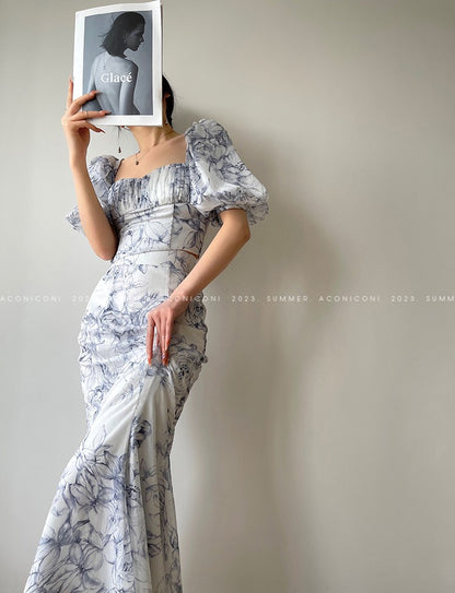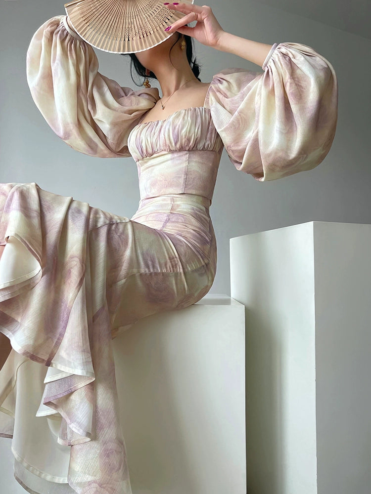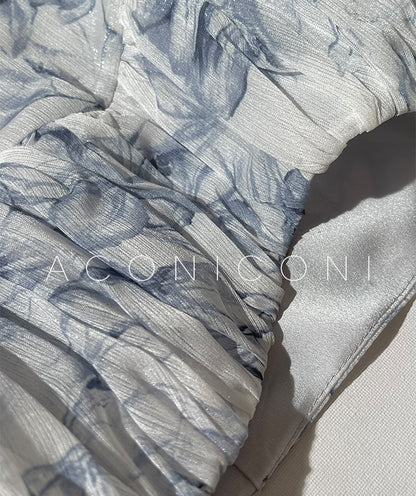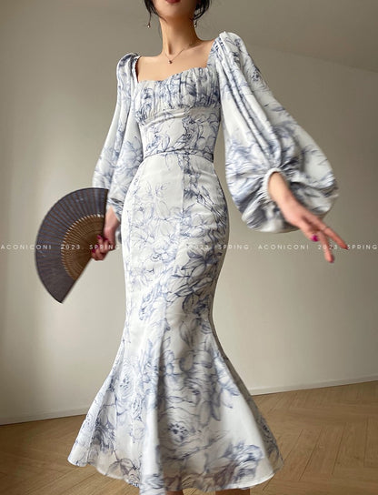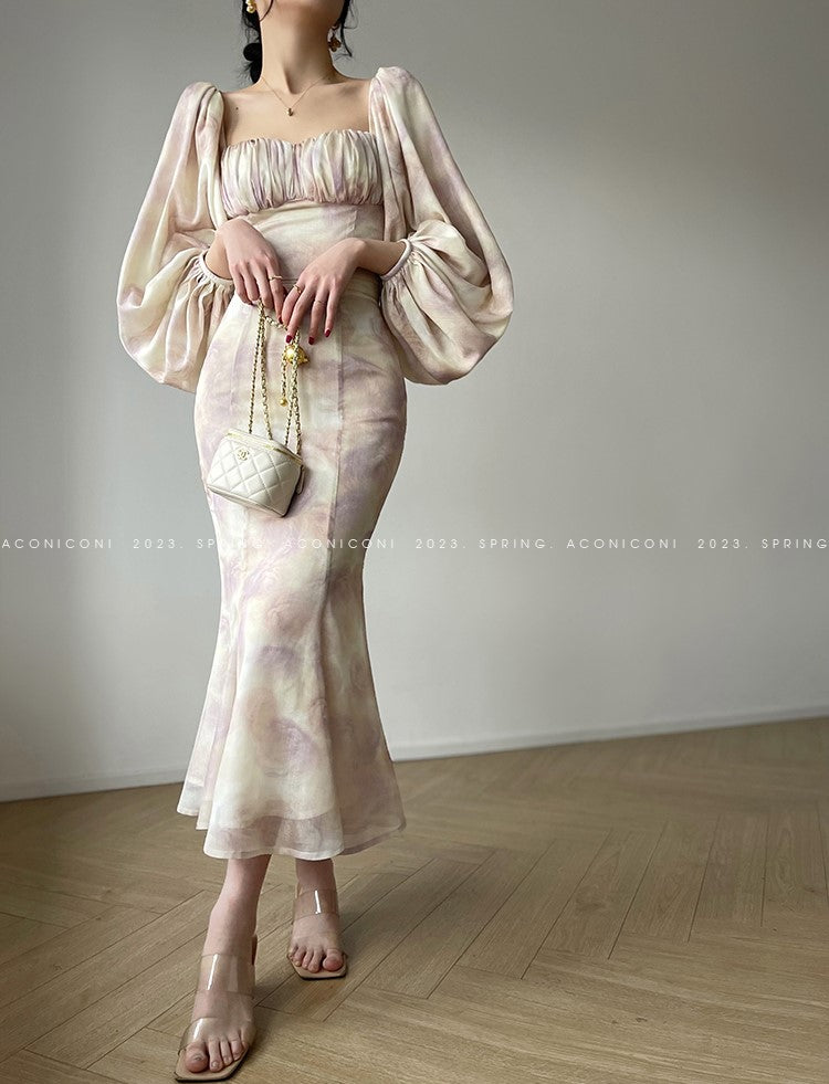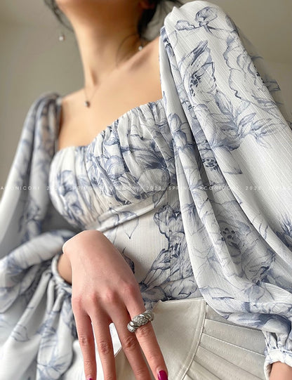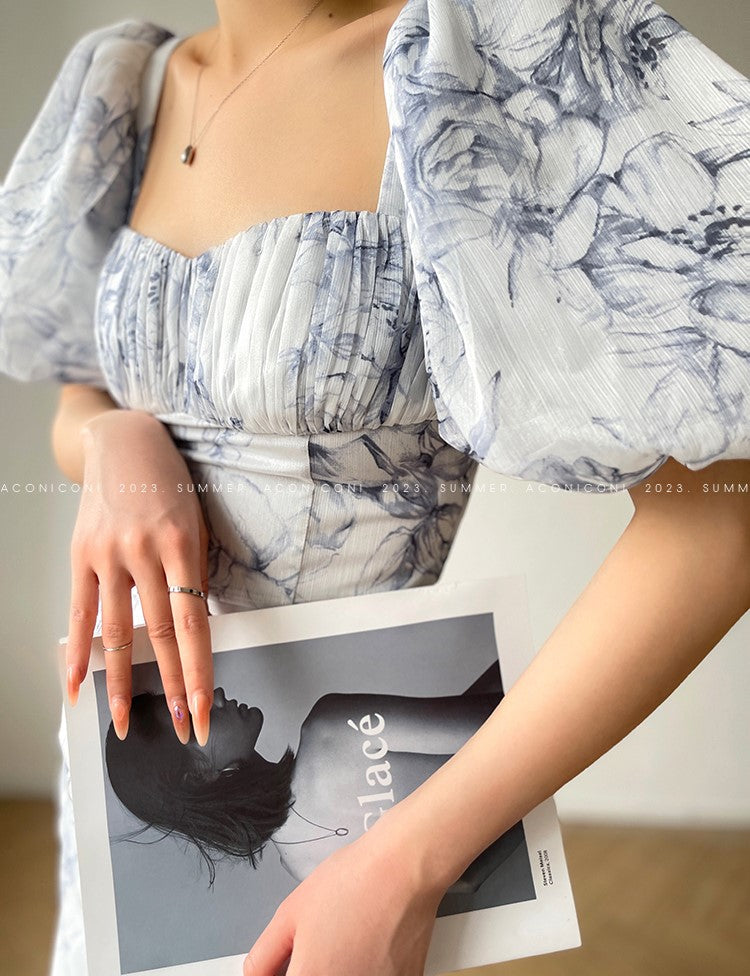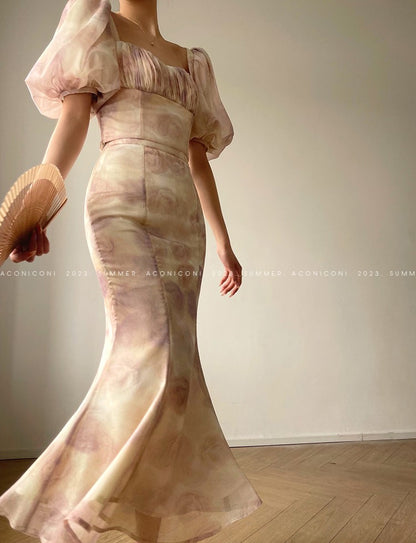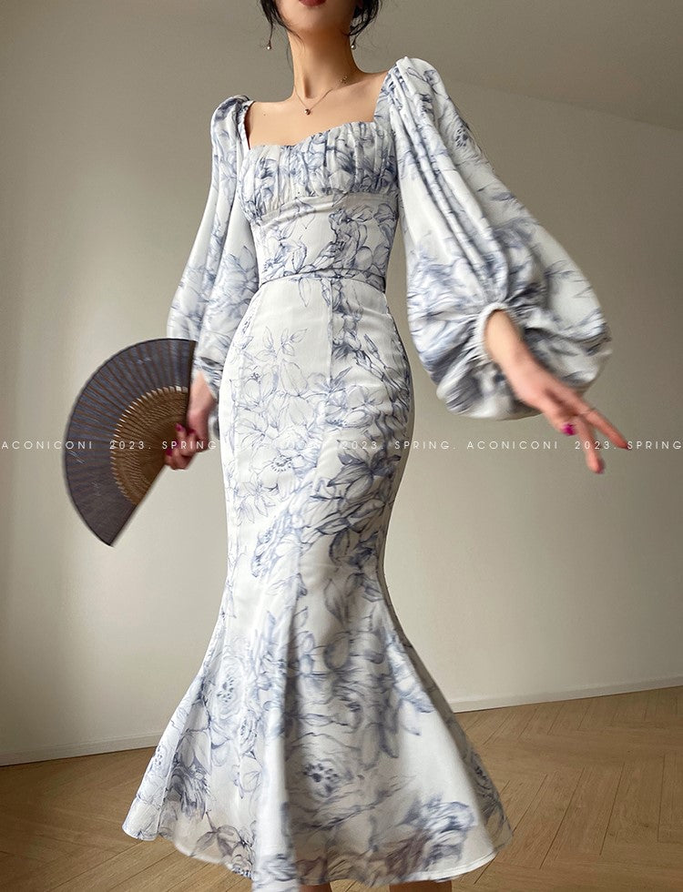 Aconiconi Luxury Square Neck Lantern Sleeve Top/ long Skirt- Angelica dahurica frost