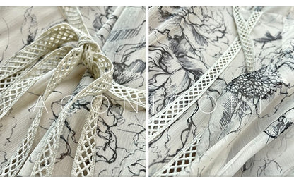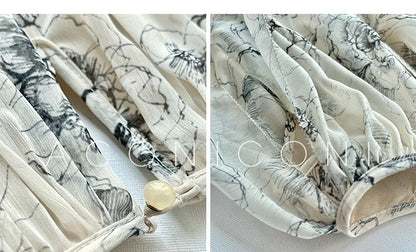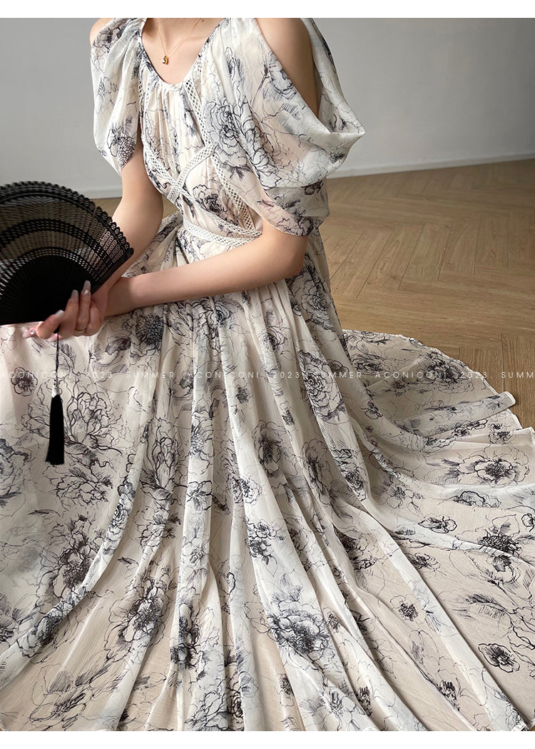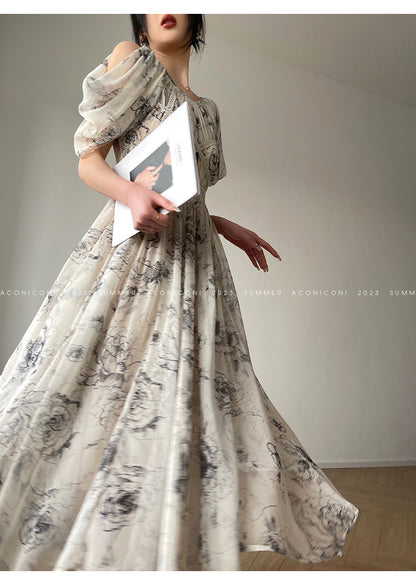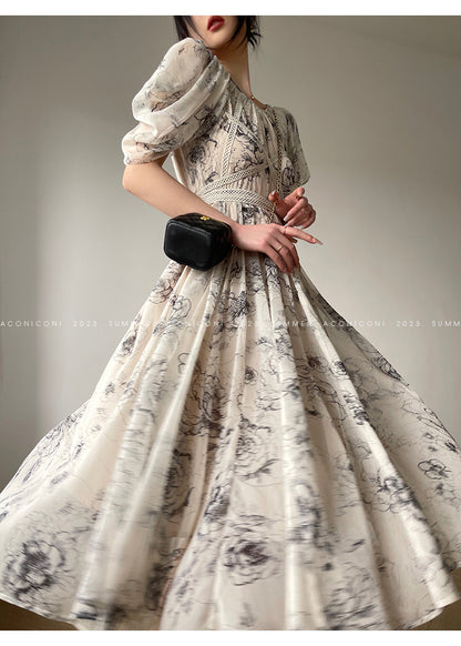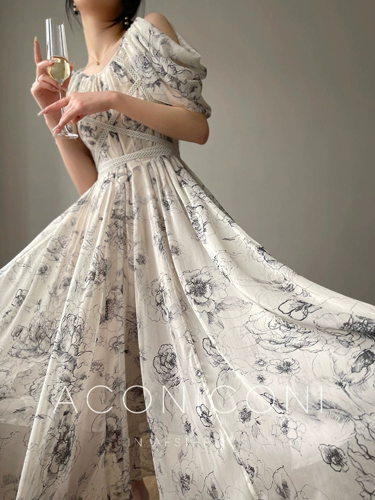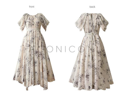 Aconiconi Luxury Rose Print Lantern Sleeve Long Summer Dress- Moonlight Rose