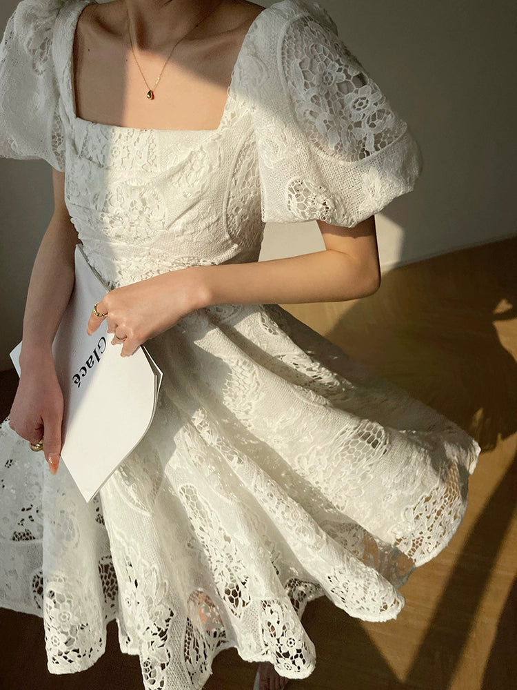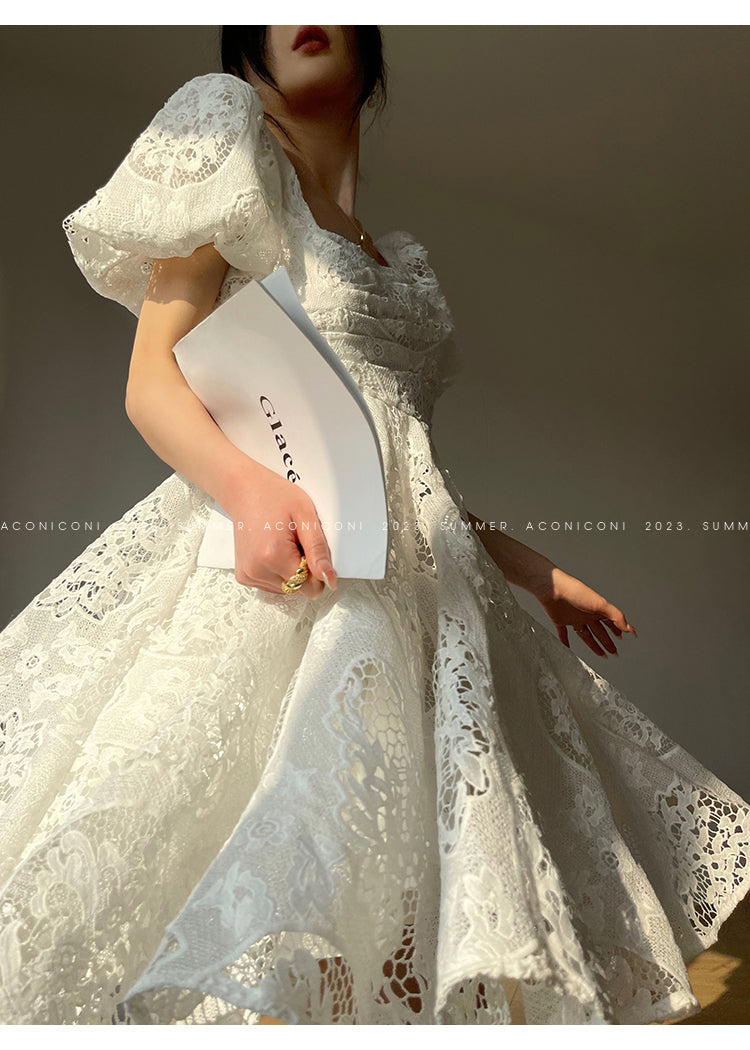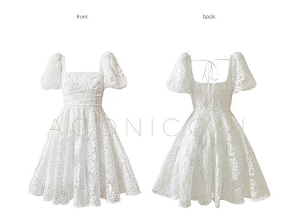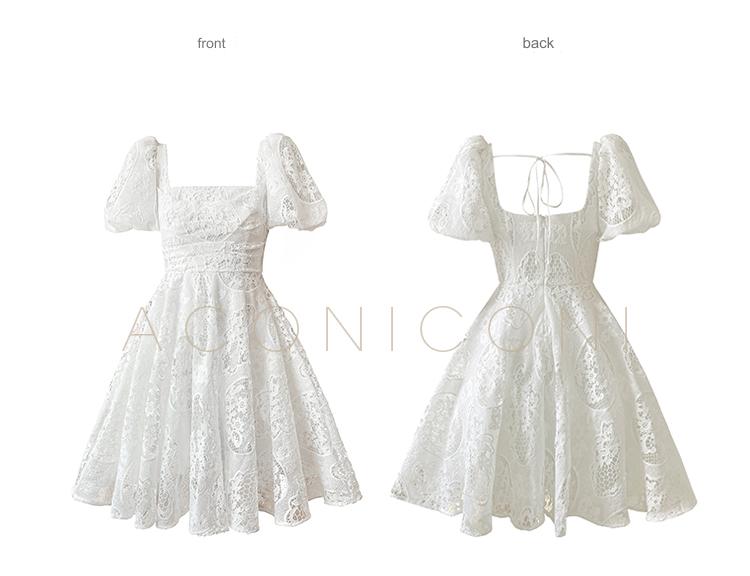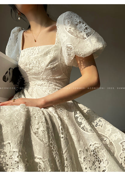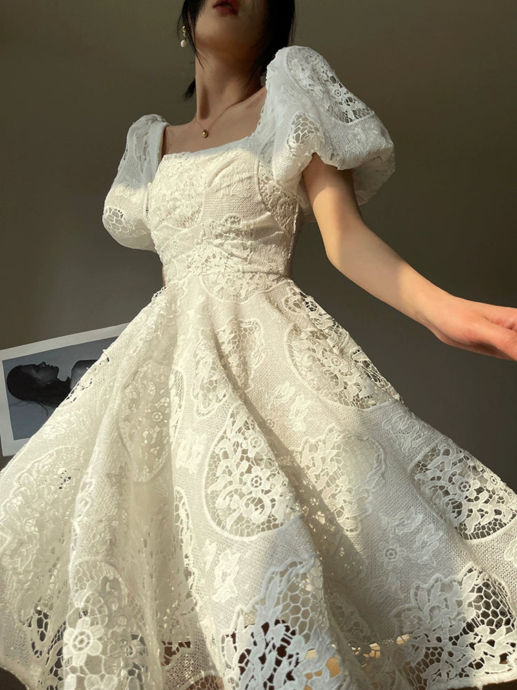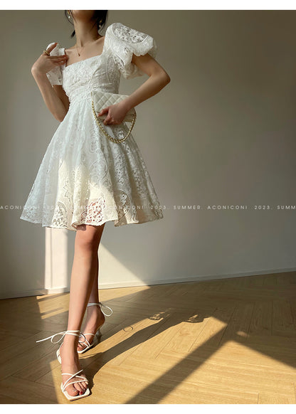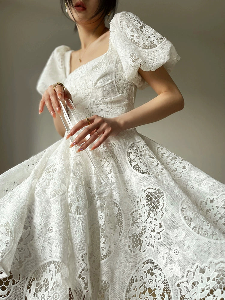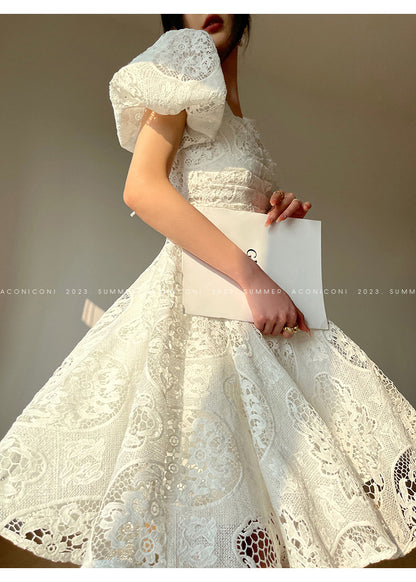 Aconiconi Luxury White French Style Short Puff Sleeve Lace A-Line Dress - White Tea Story