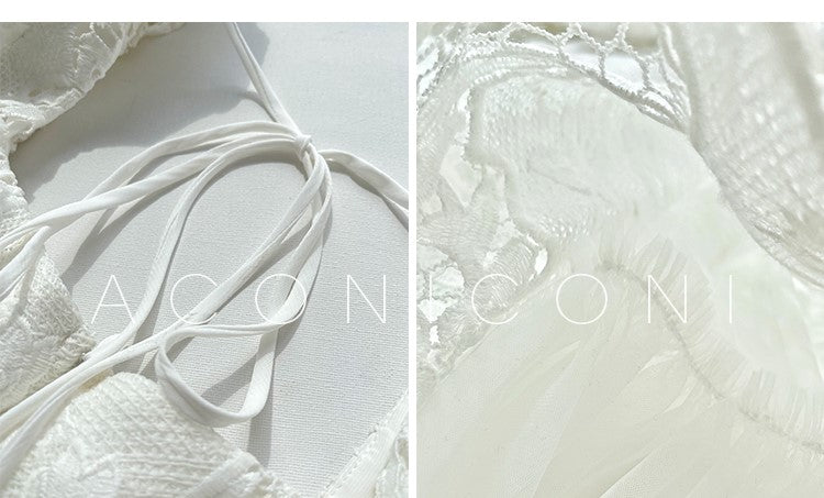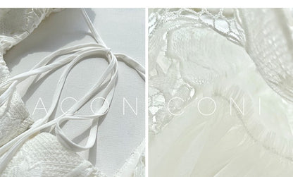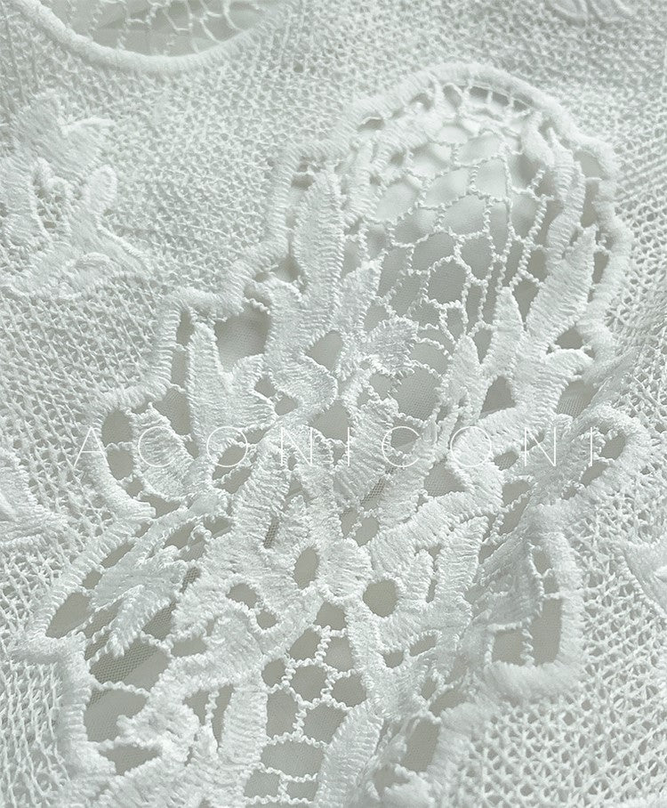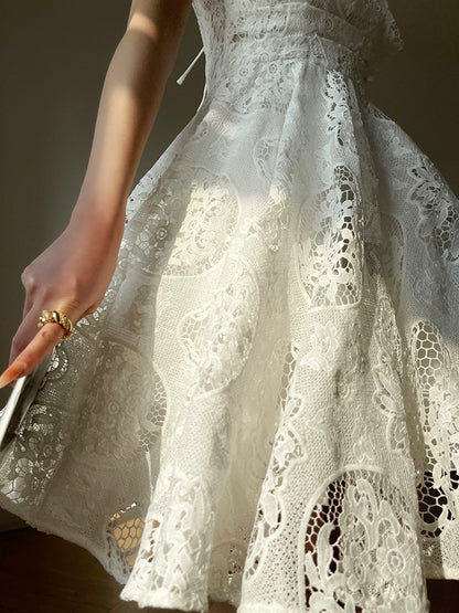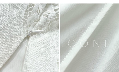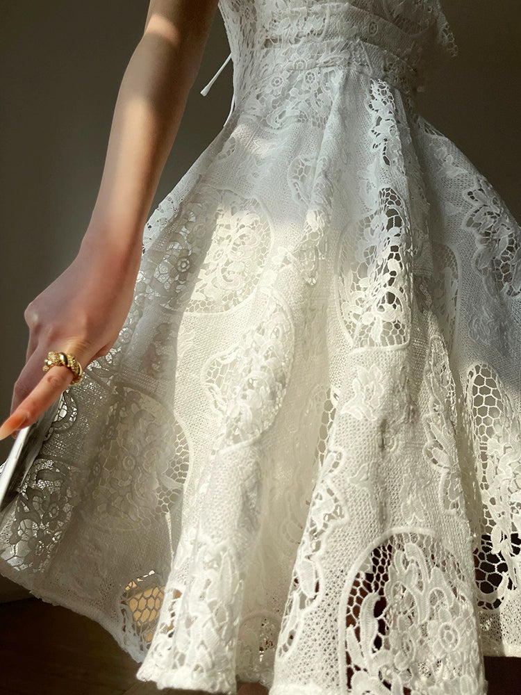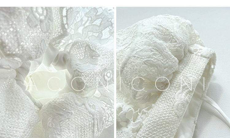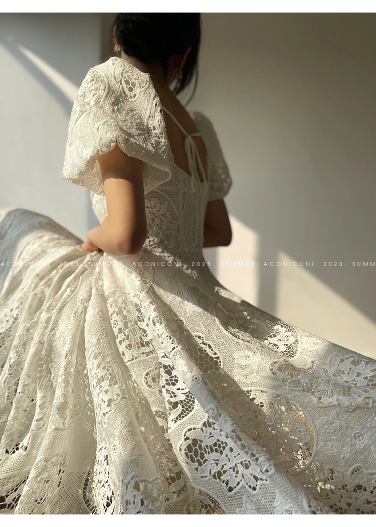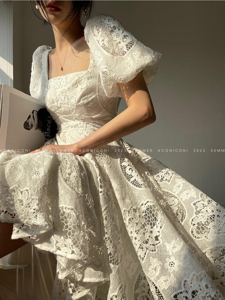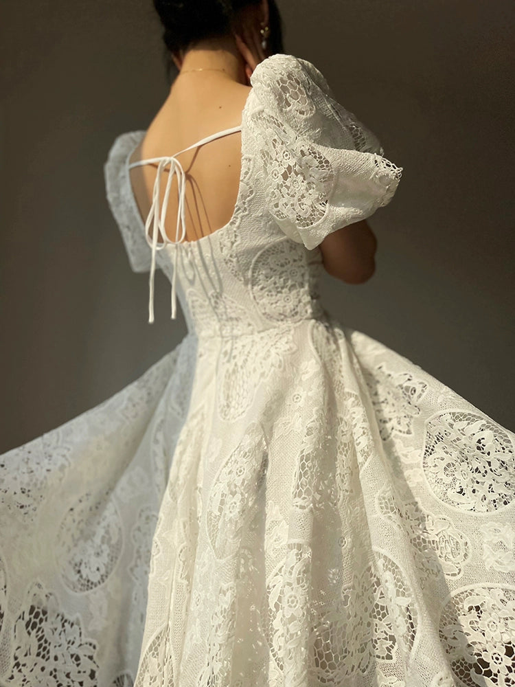 Aconiconi Luxury White French Style Short Puff Sleeve Lace A-Line Dress - White Tea Story