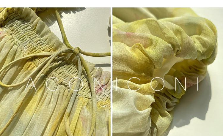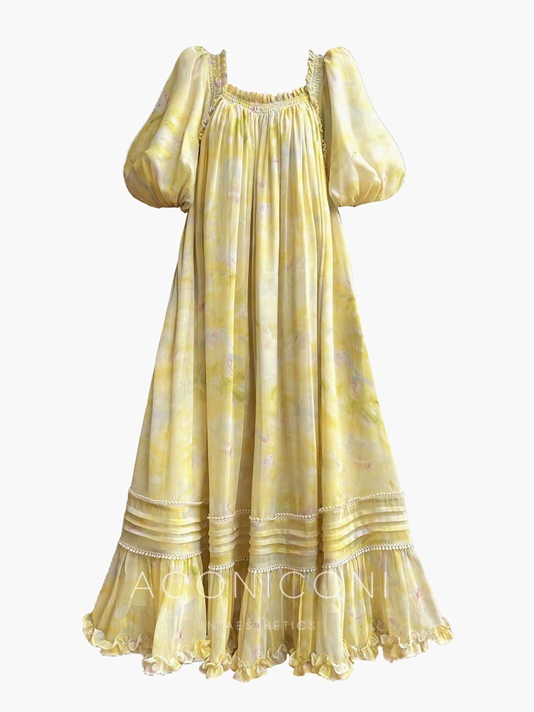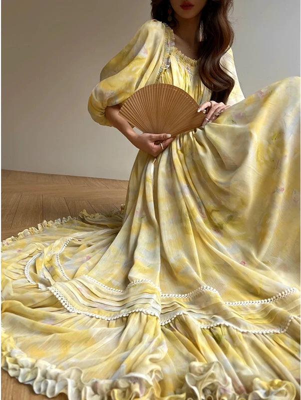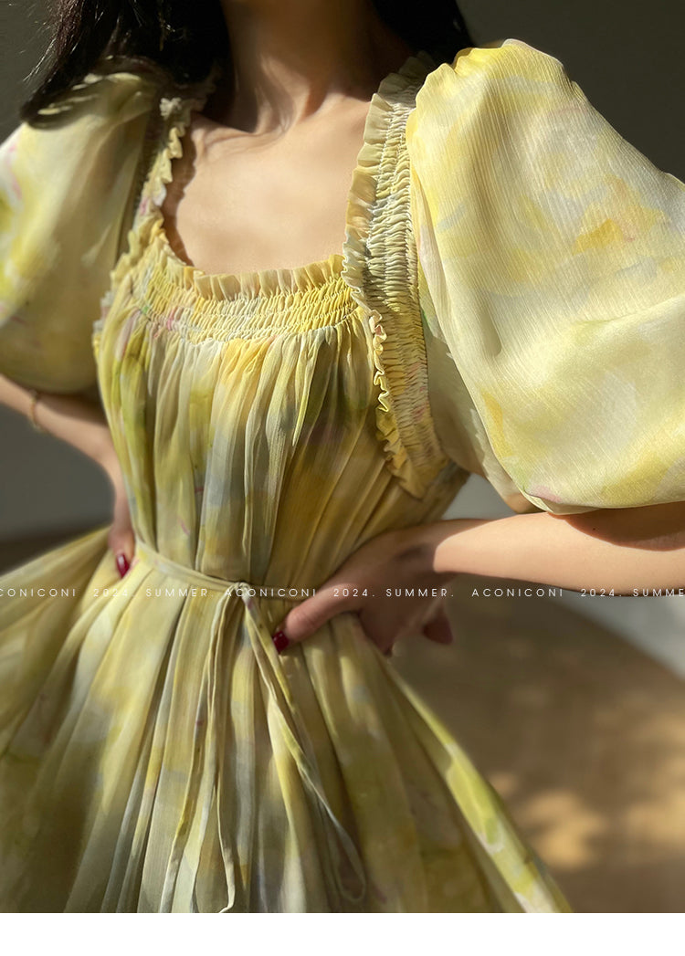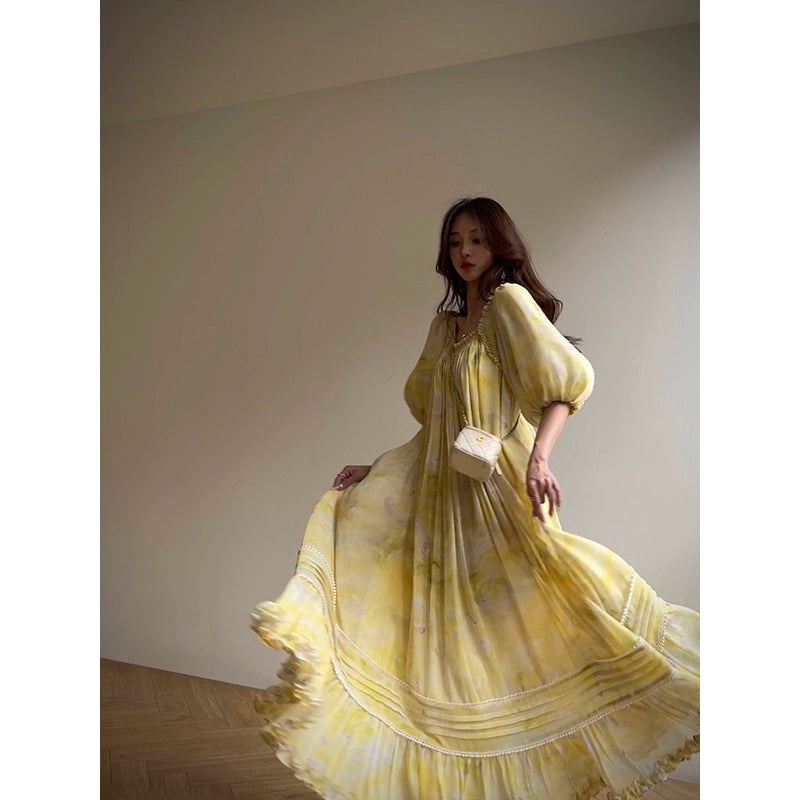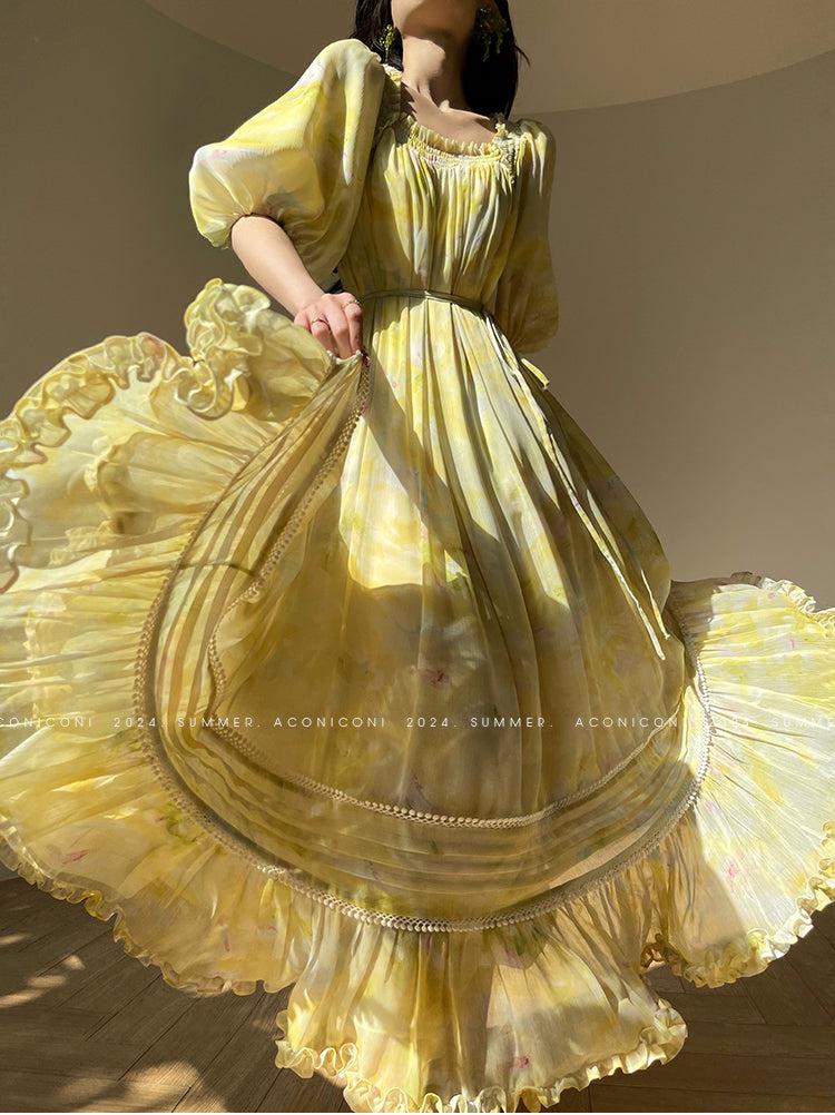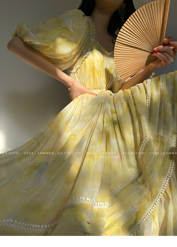 Aconiconi Luxury Yellow French Print Loose Long Resort Dress - Japanese late summer