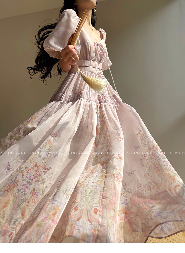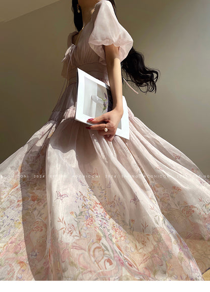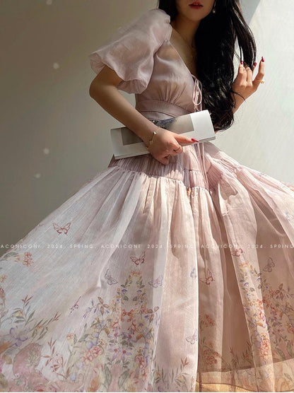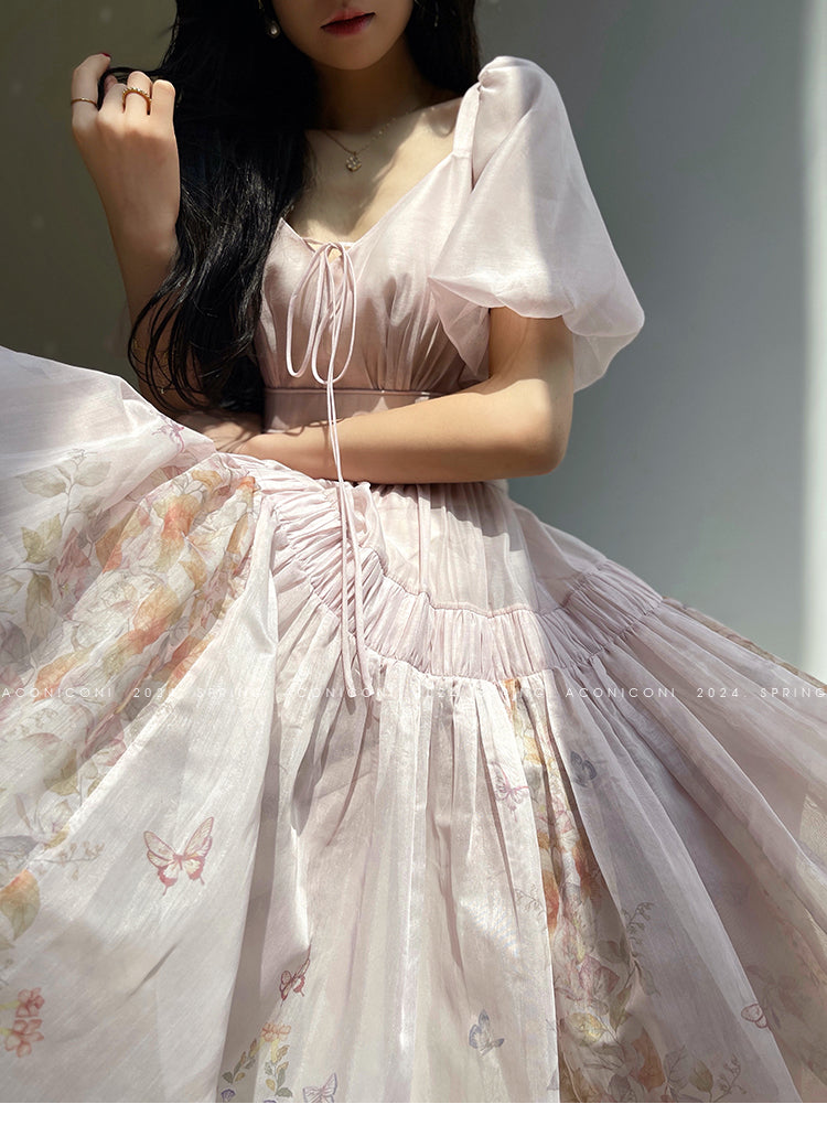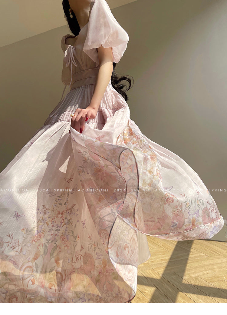 Aconiconi Pink French Print Puff sleeve High Waist Dress- Pink Flower Shadow