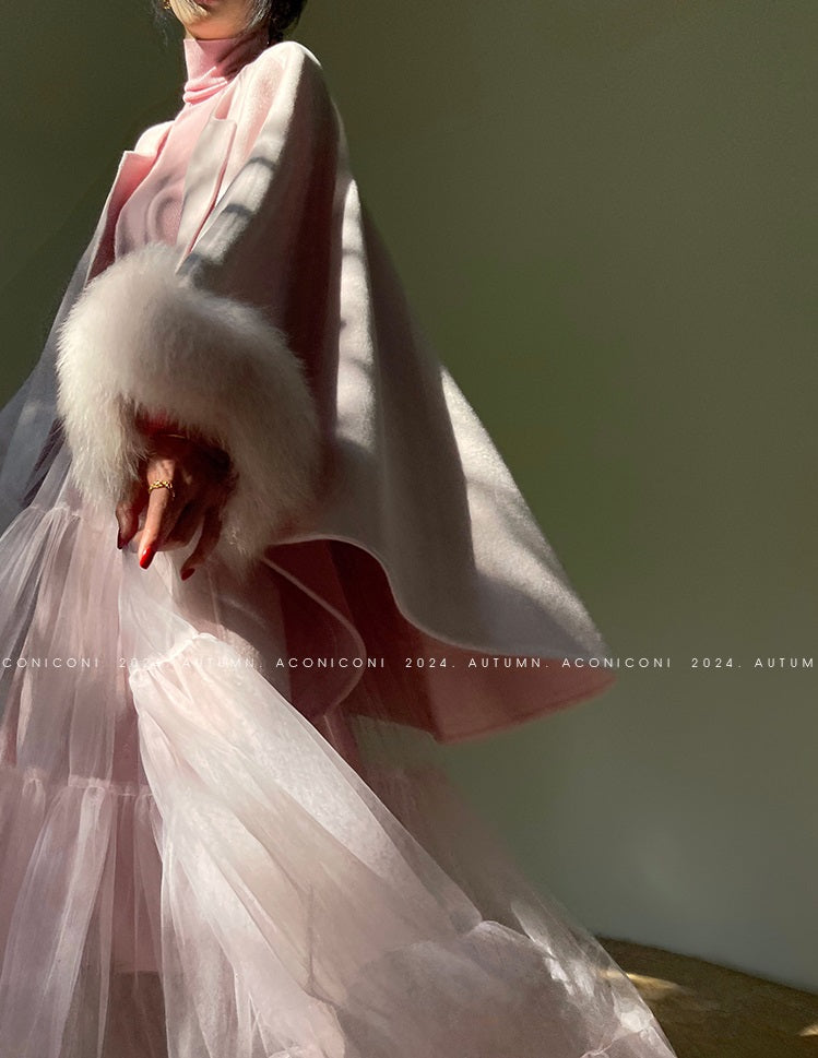 Crafted with exquisite attention to detail, this winter pink wool cape features luxurious fox fur sleeves, making it both elegant and cozy. Experience the ultimate in sophisticated style with our Aconiconi Winter pink wool cape fox fur sleeve double-sided coat.