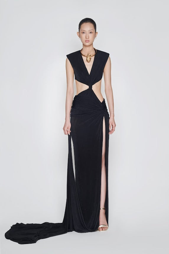 Renowned for masterful pleating, Tonyy presents this dress for SS24 in a classic dark and asymmetric hem offer the finishing touches to the garment.