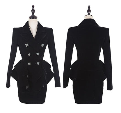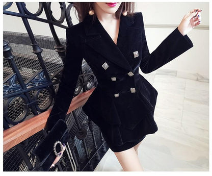 Achieve a timelessly chic and sophisticated wardrobe with the Black Velvet Skirt Suit from Sookyung. This stunning ensemble offers a dashingly gorgeous silhouette that is perfect for any fall or autumn occasion. Crafted from the finest velvet, this chic two-piece skirt suit radiates elegance and opulence.