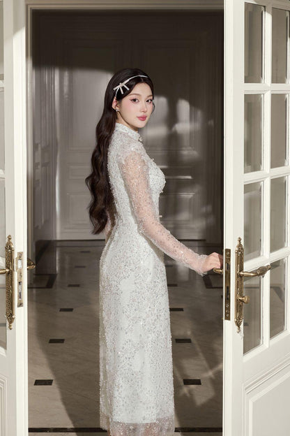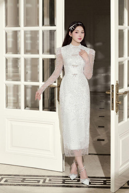 WH PLAN Bridal Sheath Long Sleeved shimmering Organza Midi Dress - BRIDA