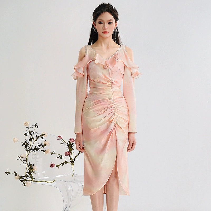 Dominate every room in this unapologetically pink creation that refuses to be ignored. CHECOCRE's smudged floral pattern plays across fabric like a secret language only the bold can decipher. The provocative off-shoulder cut and thigh-high slit aren't just design choices—they're weapons in your seduction arsenal. This isn't just a midi dress; it's a declaration that your body deserves to be worshiped