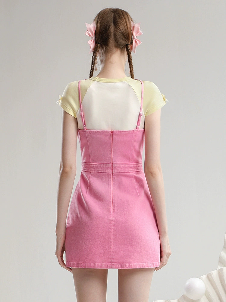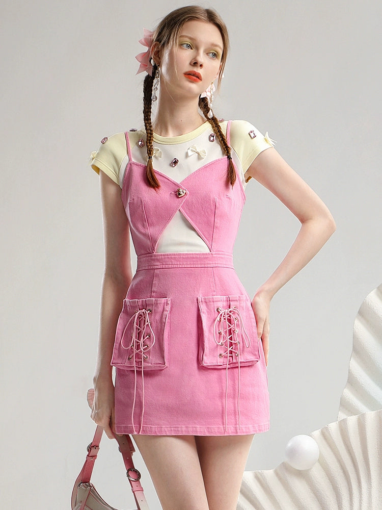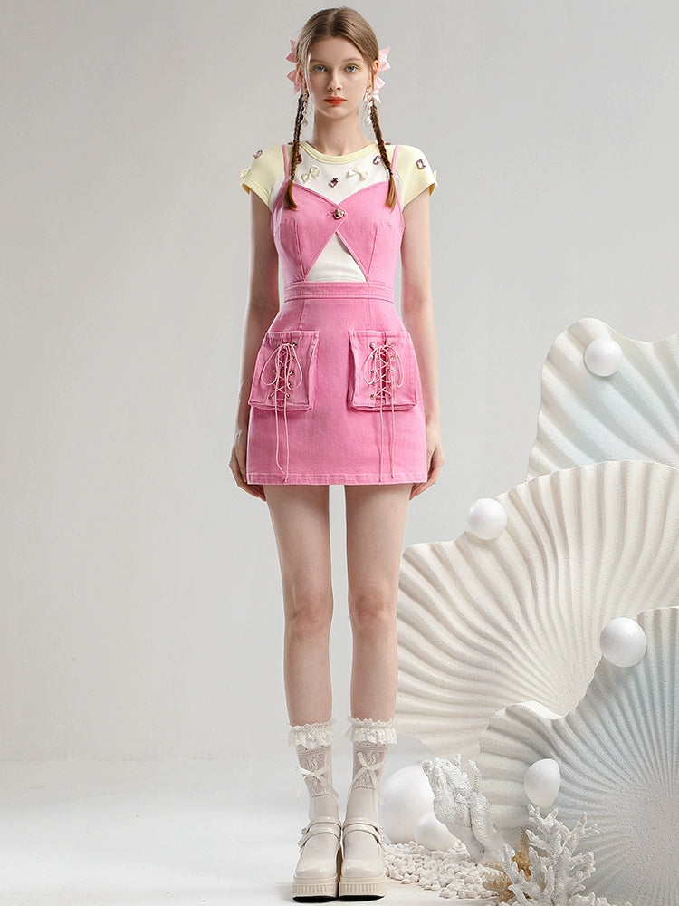 Introducing the CHECOCRE Summer T-shirt and Suspender Denim Skirt Set, designed specifically for women. Made with a stylish pink denim dress and a comfortable crop top, this set is perfect for your summer wardrobe. Feel confident and stylish all day long!