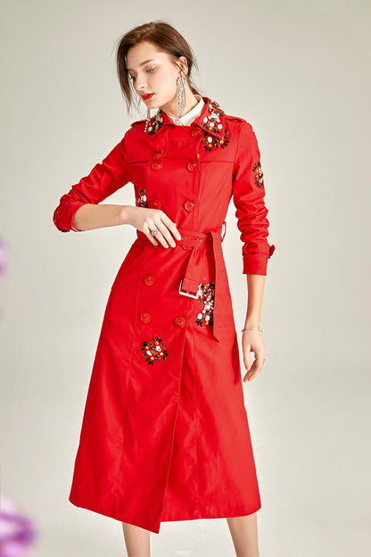 Classic autumn winter luxury limited edition handmade beaded long trench coat - Siaha Red