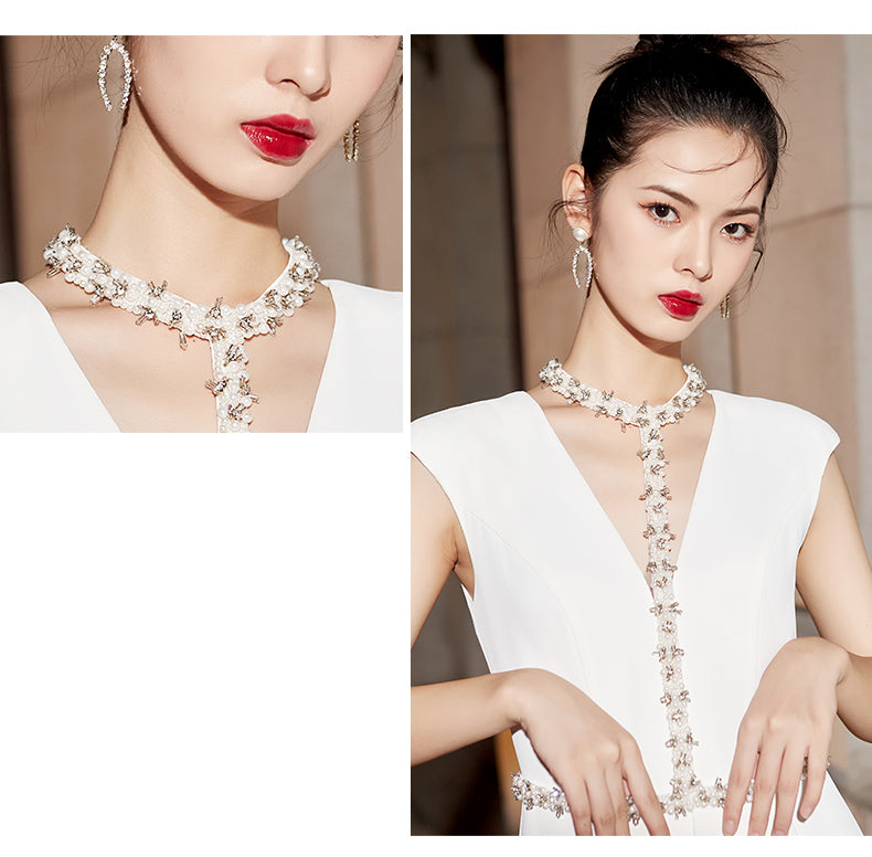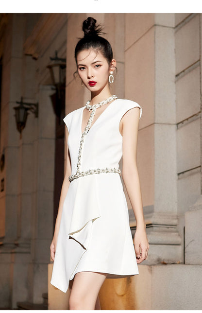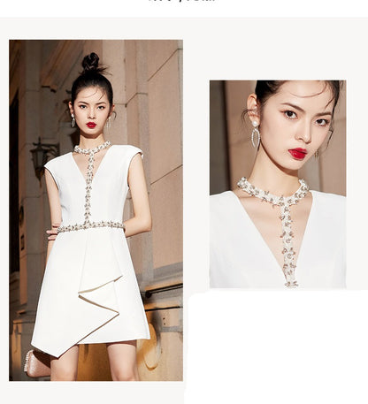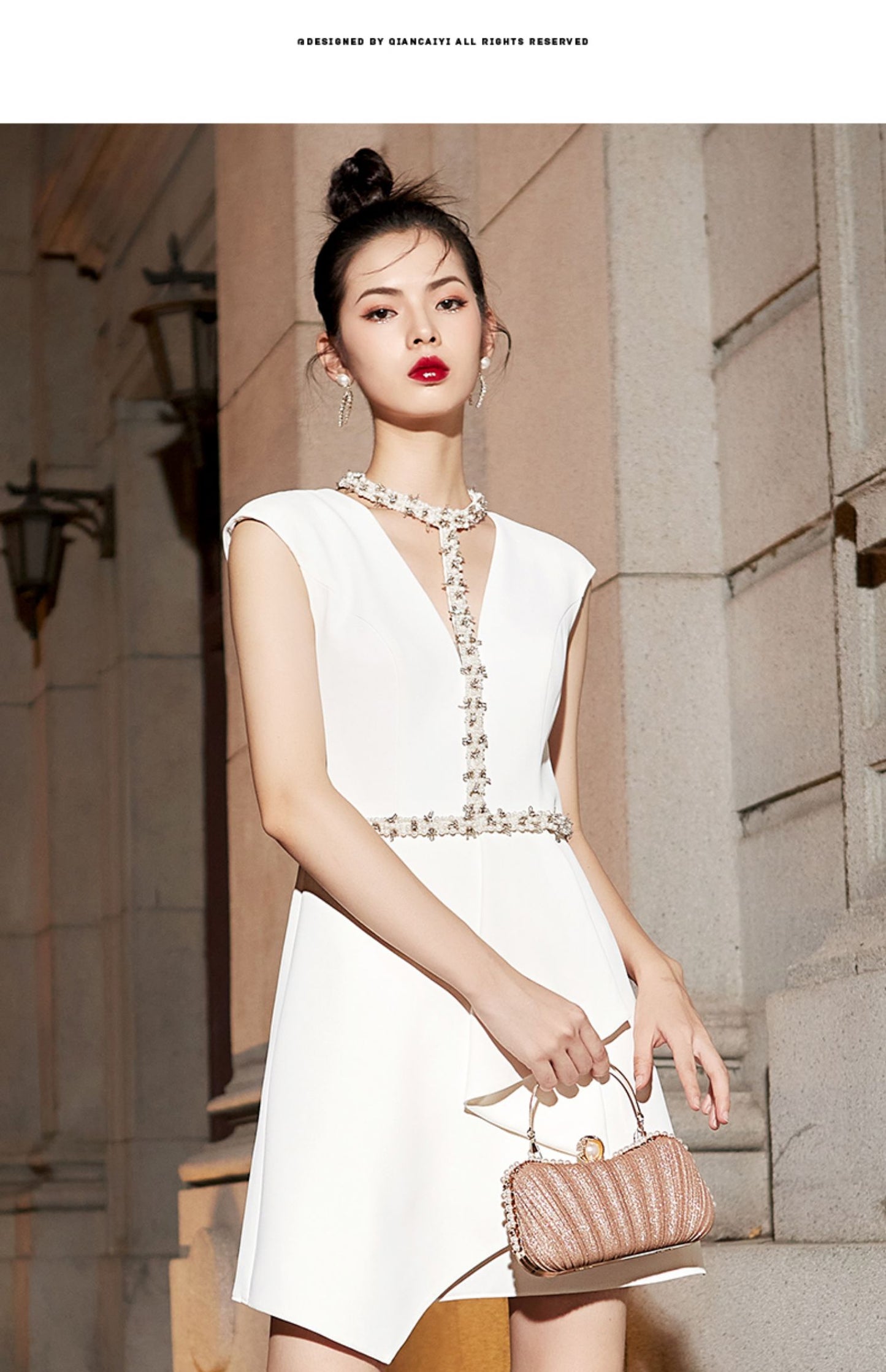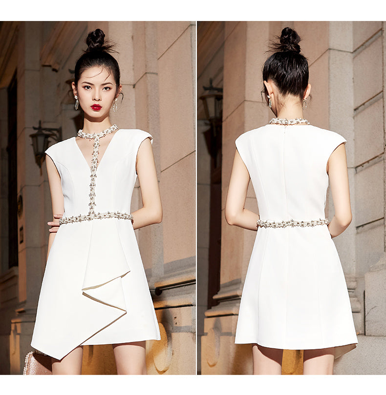 Featuring an elegant halter neck, this summer party dress is designed to display a deep V, providing a sexy look. Utilize facts, percentages and numbers with a scientific and latinate word choice in declarative sentences to build trust in the reader with an objective and professional tone. Refrain from using subjective language or exclamation marks.