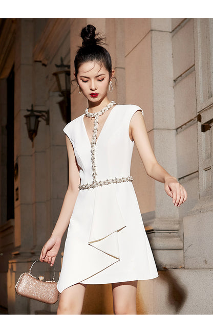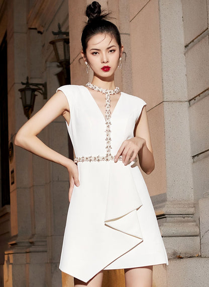 Elegant halter neck, this summer party dress is designed to display a deep V-Filomina