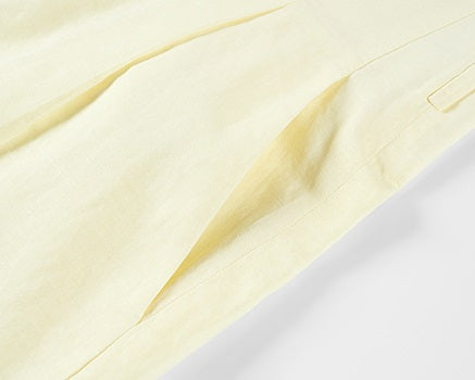 These cotton-linen blend shorts marry comfort with understated elegance through thoughtful material selection and design. The relaxed cut through the hips and thighs accommodates unrestricted movement, while slant pockets introduce casual functionality. A pleated waistband creates dimensional texture that enhances visual interest while flexibly accommodating varying waist sizes. The fabric blend strategically combines cotton's inherent softness with linen's crisp structural integrity, resulting in a slightly coarse texture that embodies relaxed sophistication. The creamy yellow hue—positioned between soft pastel and milk white—delivers a low-saturation warm neutral that coordinates effortlessly across diverse color palettes. This nuanced tone, paired with the fabric's natural texture and generous silhouette, creates an ideal summer essential that prioritizes both comfort and refined, approachable style.