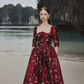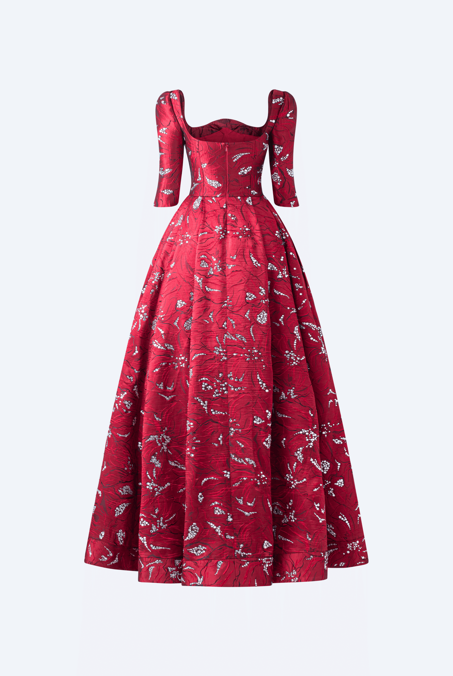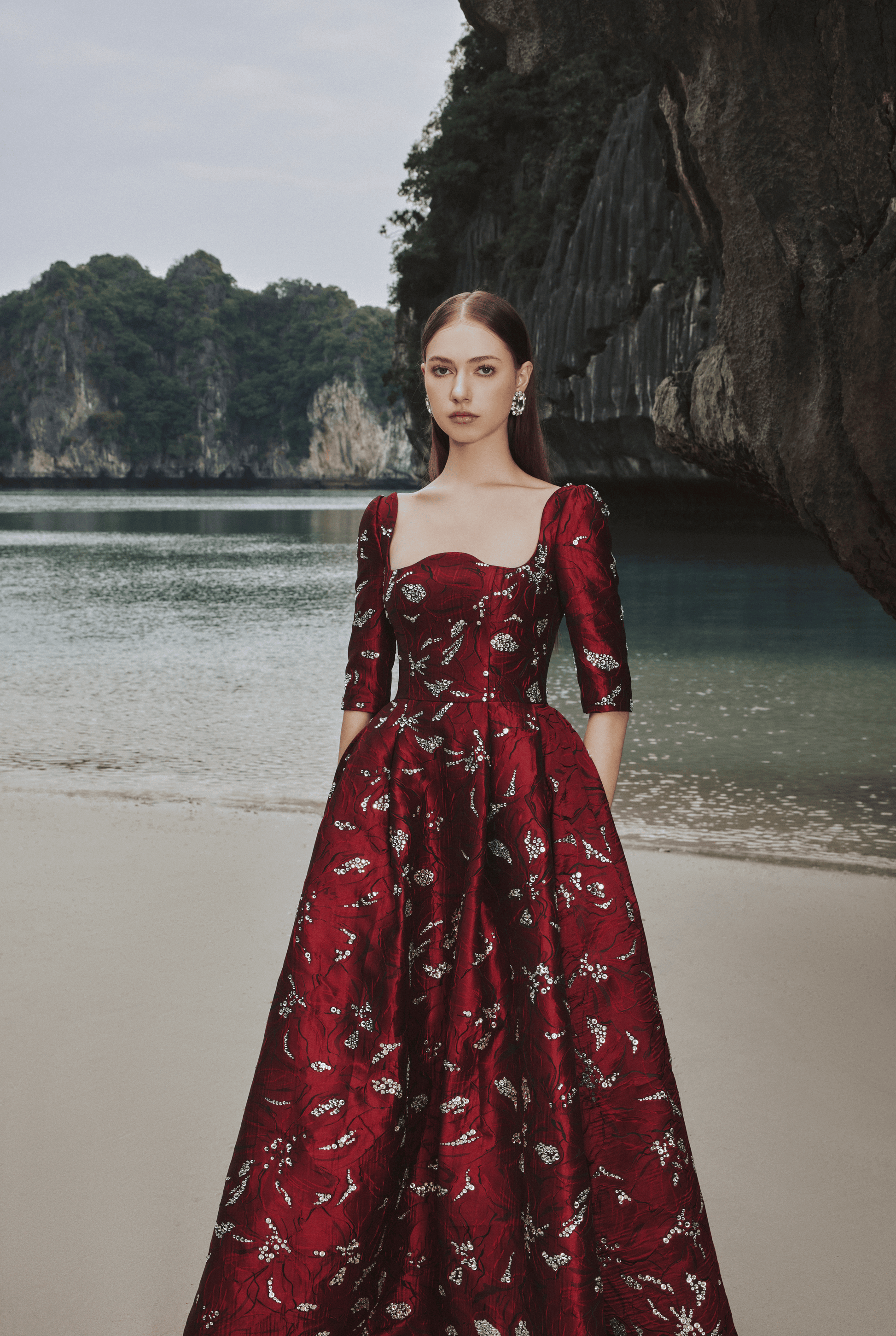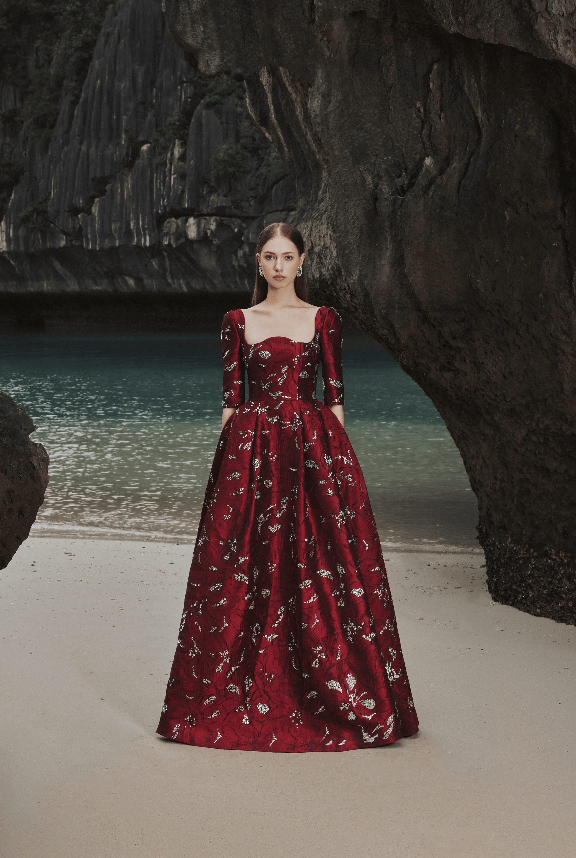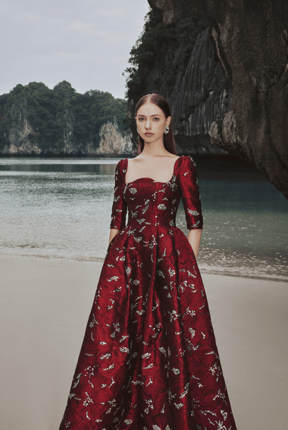 The long sleeve full dress from Tracy Studio promises to provide an elegant and luxurious look for women in important events or red carpet parties. The high-quality brocade material, decorated with delicate sunken patterns and stone embellishments, creates a sophisticated and classy appearance. The gentle pleats and exclusively wavy neckline, designed by Tracy, add extra elegance to the dress, creating a timeless and classic style reminiscent of European aristocrats.