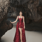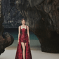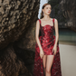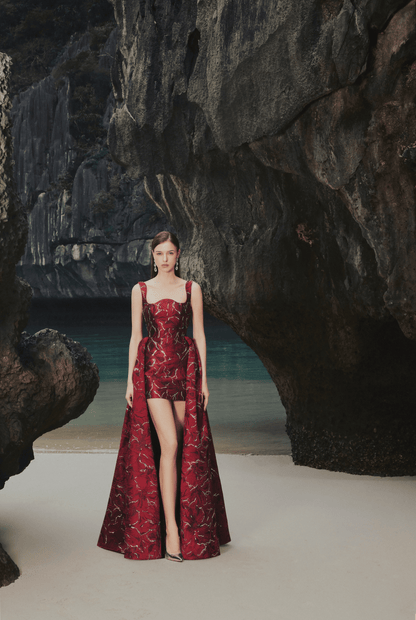 This sleek and elegant sleeveless full dress from Tracy Studio showcases a unique "High-Low" style, featuring a shorter front and longer back, inspired by the Victorian era in England. Made from high-quality brocade with intricate sunken patterns, the dress boasts a luxurious and sophisticated look. The wavy neckline and the High-Low style add to its timeless elegance, making it the perfect choice for red carpet events and special occasions. The dress is sure to make a statement and help you shine with your own brilliant light.