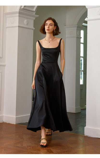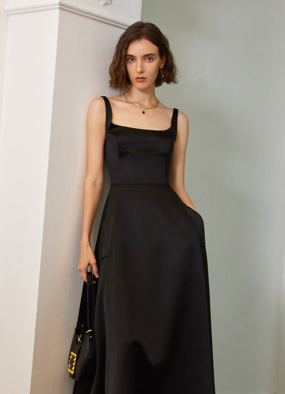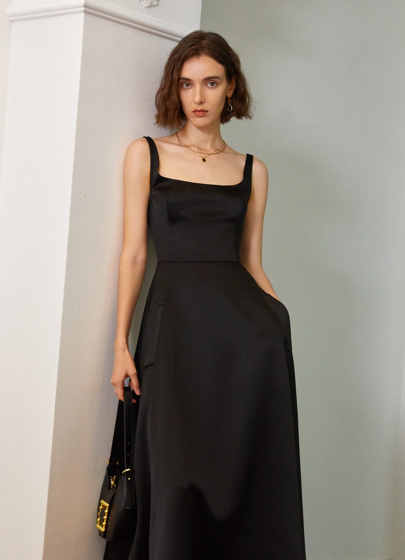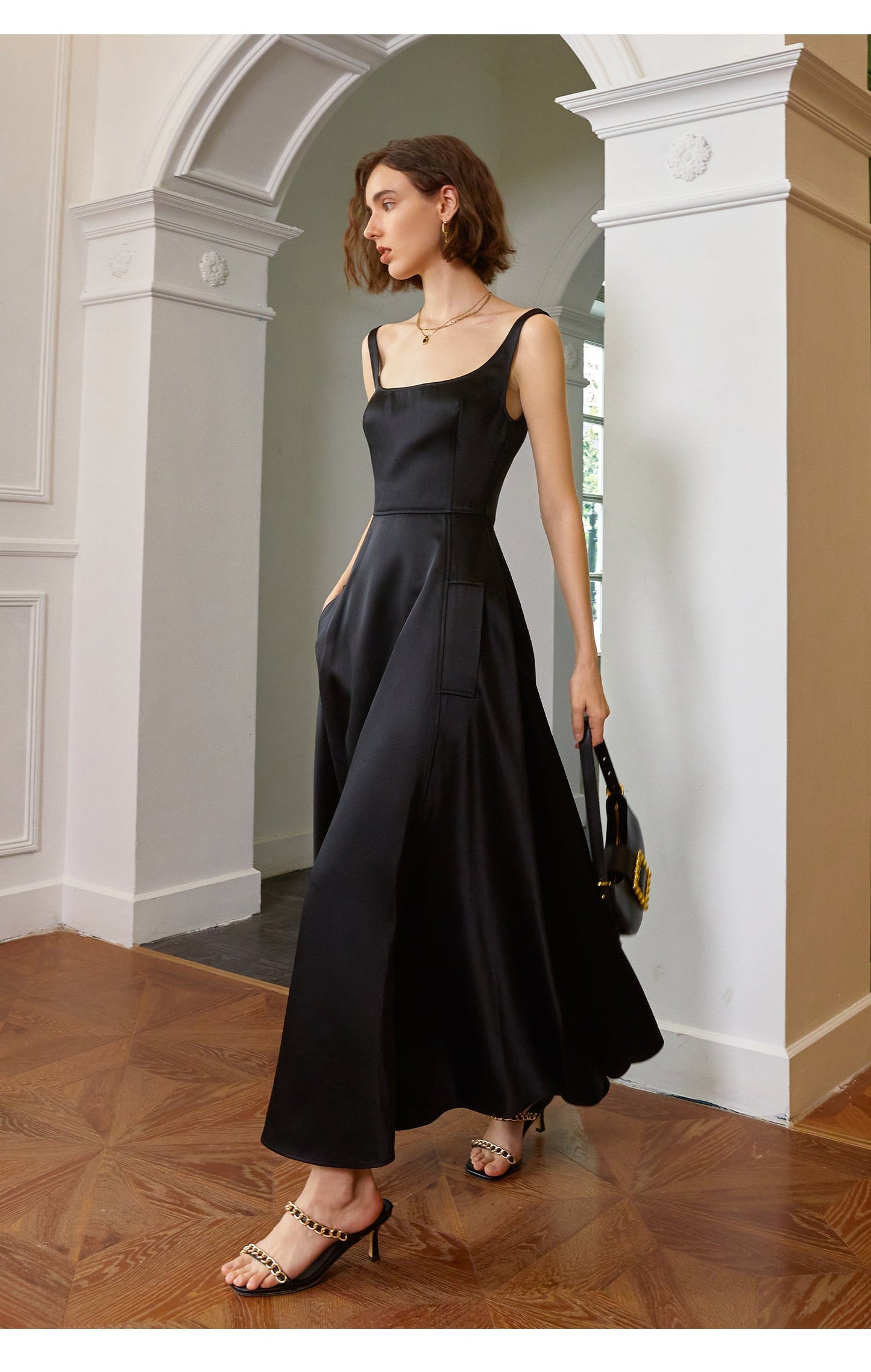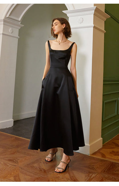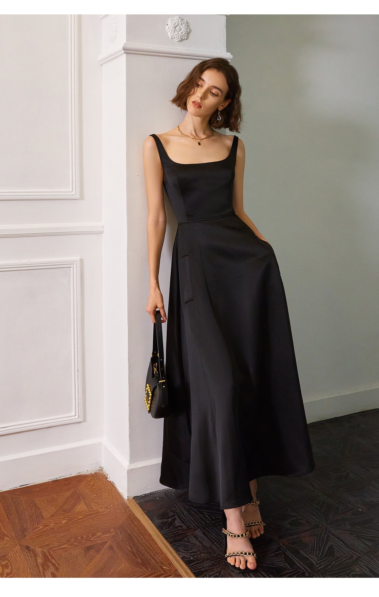 This sleeveless slim dress features a long skirt and comes in a black and white color. Its timeless design ensures the perfect combination of style and comfort for any occasion.